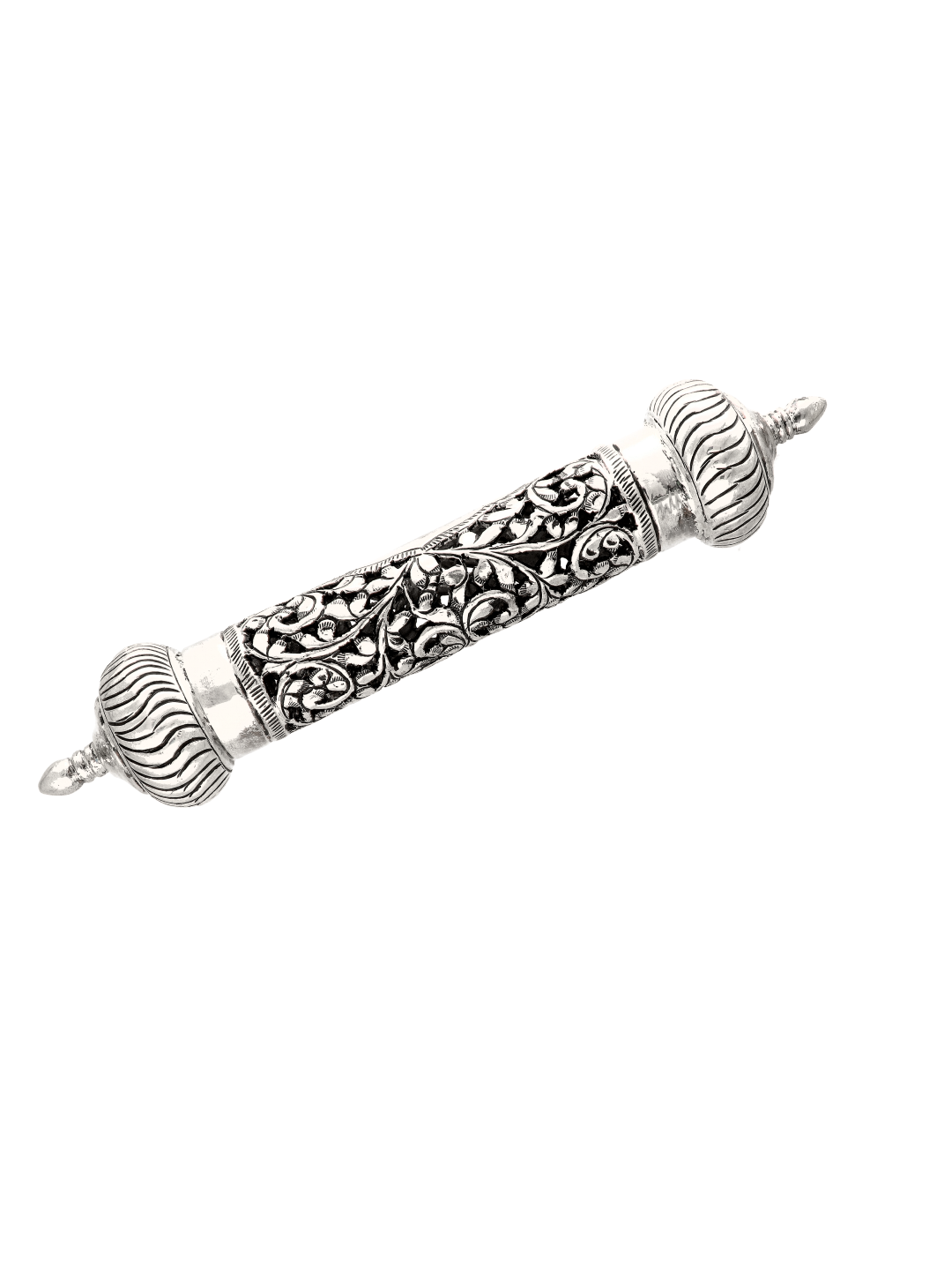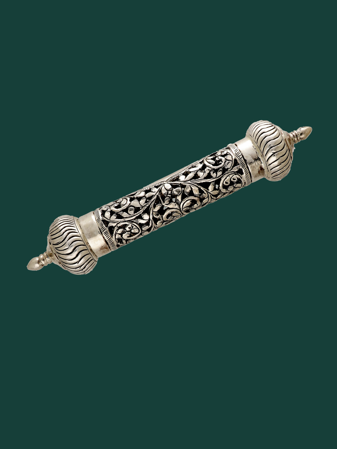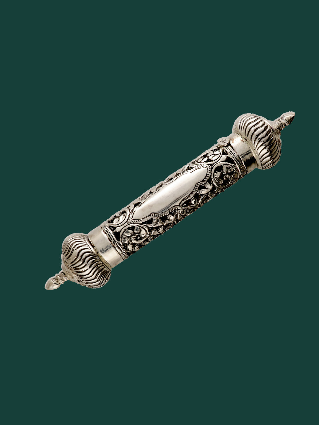Preserve important documents in timeless elegance with this 925 silver Farman Casket. Hand-crafted by master artisans, the cylindrical form features intricate repoussé work—raised floral bands and classical motifs achieved through meticulous hammering. The deep antique finish evokes historic prestige, while certified pure silver ensures durability across generations. Ideal for scrolled papers, certificates, and family letters, this piece functions as both secure storage and a refined desk accent that speaks to heritage and authority. A distinguished heirloom gift for those who honor tradition and scholarship.