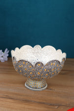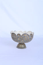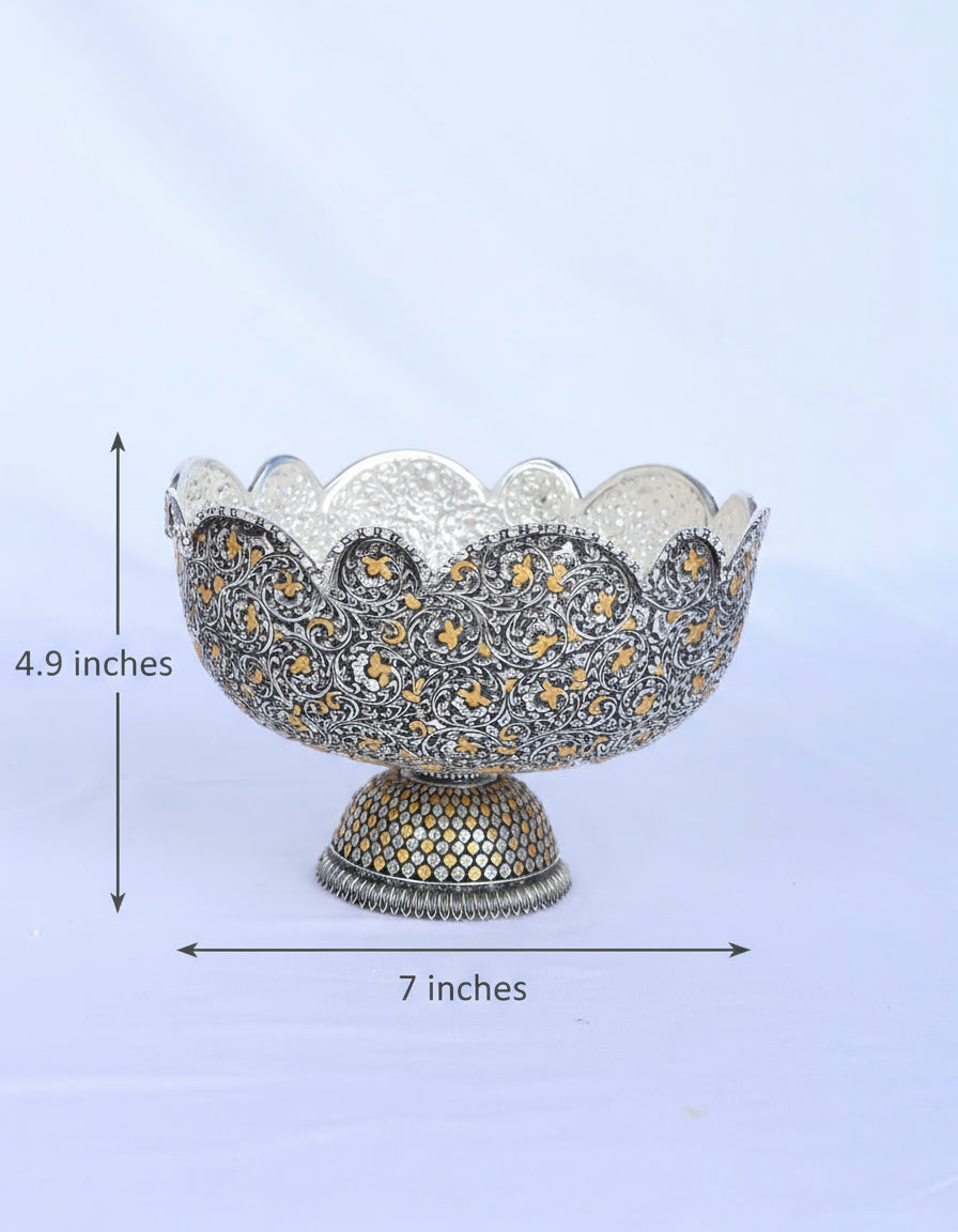 The heirloom-worthy creation is inspired by the classic Indo-Persian artistry of Mughal courts, merging ancient nakashi (hand embossing) with ornate gold detailing found in royal Florentine decor. Historically, such bowls graced the banquets and darbars of kings, used to serve rare fruits, sweets, or even as a centerpiece for blooming floral displays. The scallop and pedestal elements are reminiscent of thrones and crowns, symbolizing timeless power and celebration.