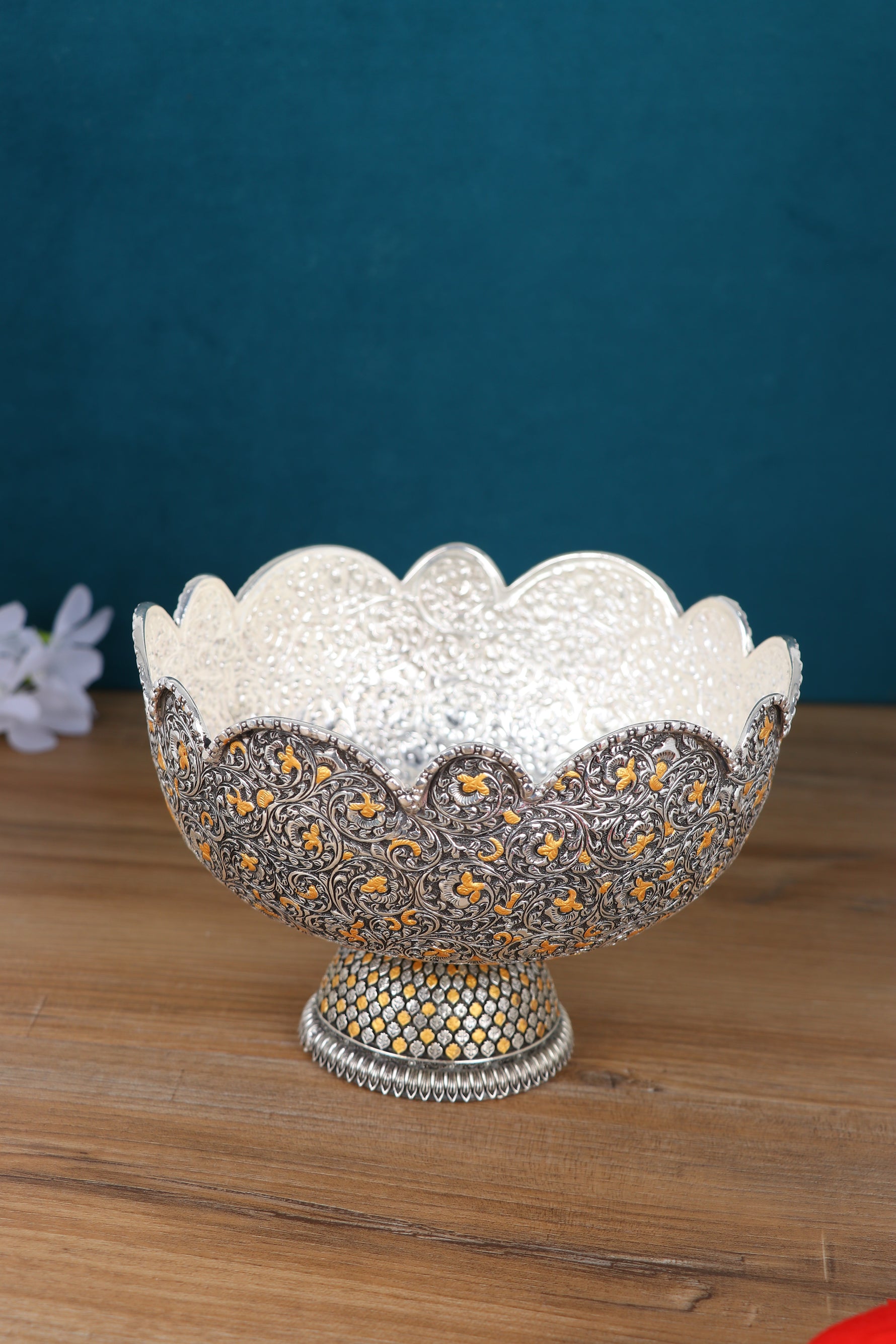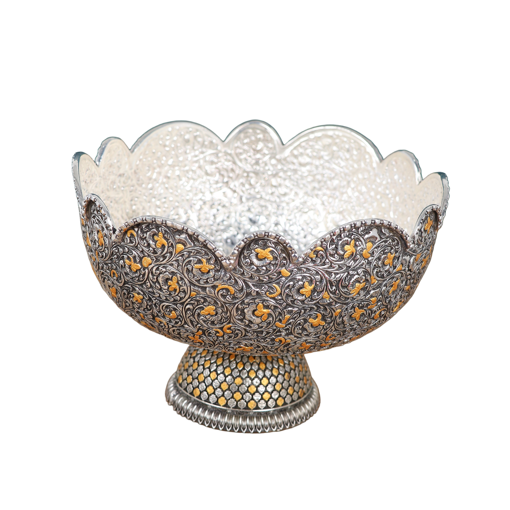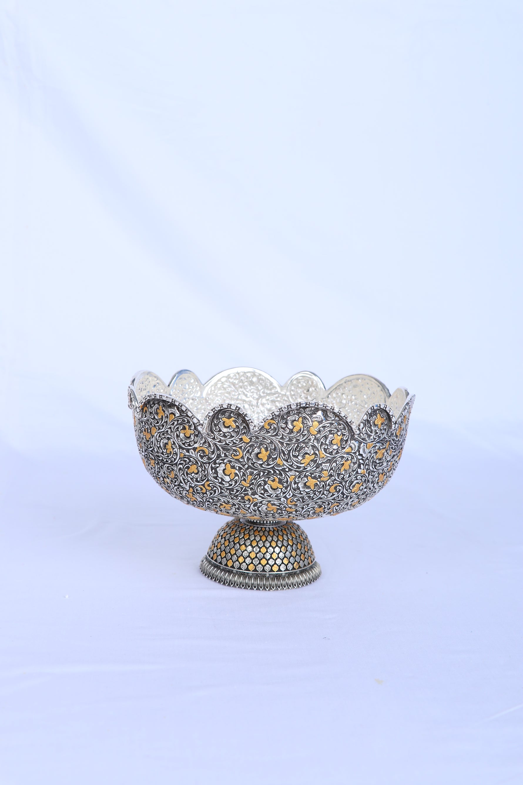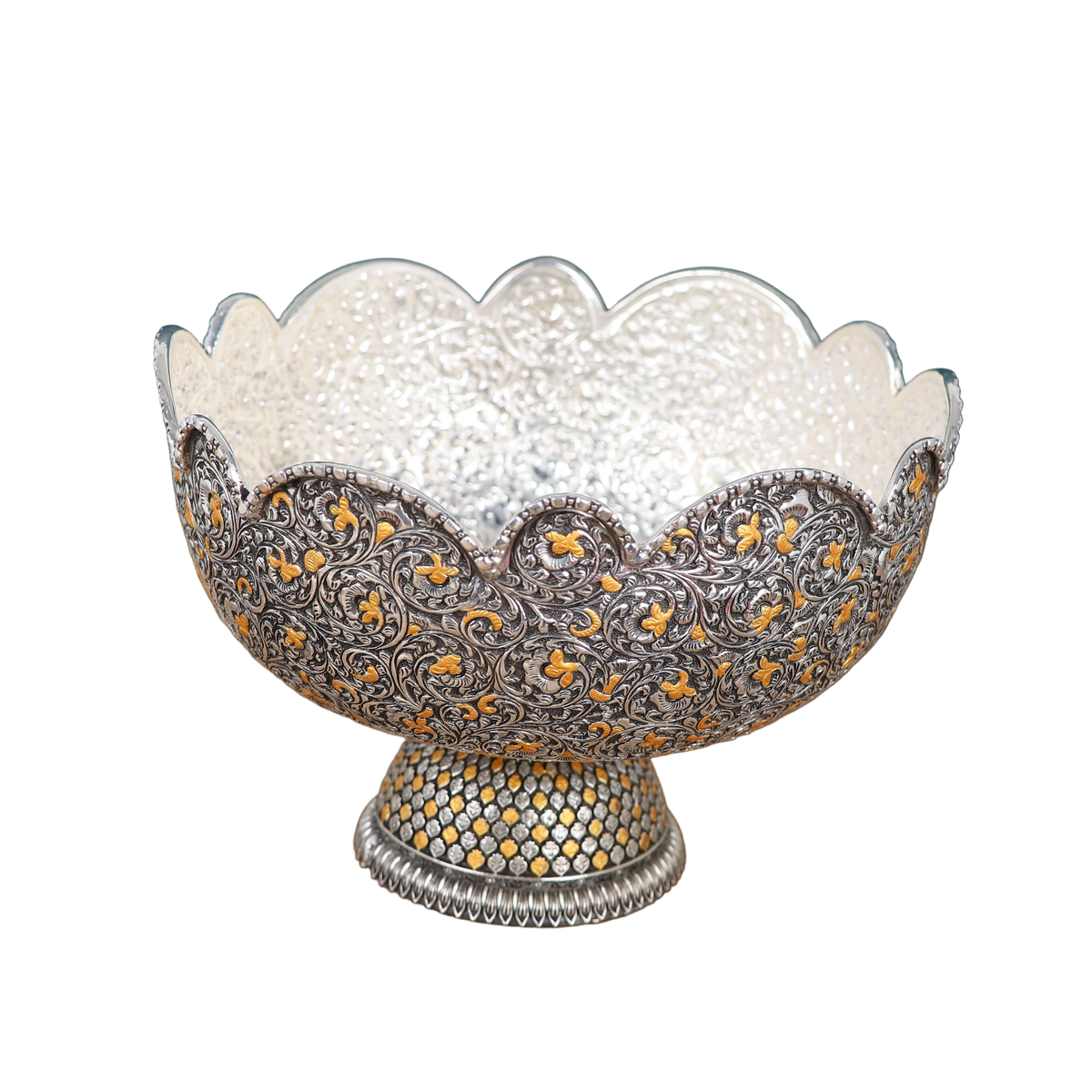 Craftsmanship: Features intricate Florentine-inspired nakashi (chasing and repoussé) scrolls and vines, masterfully interwoven with gold-highlighted floral motifs on both bowl and pedestal. The scalloped rim adds a regal edge. The domed pedestal base is double-layered—hand-studded with gold-plated accents creating a breathtaking, lattice-like effect. Each motif is individually chased and burnished, making it both a tactile and visual delight.