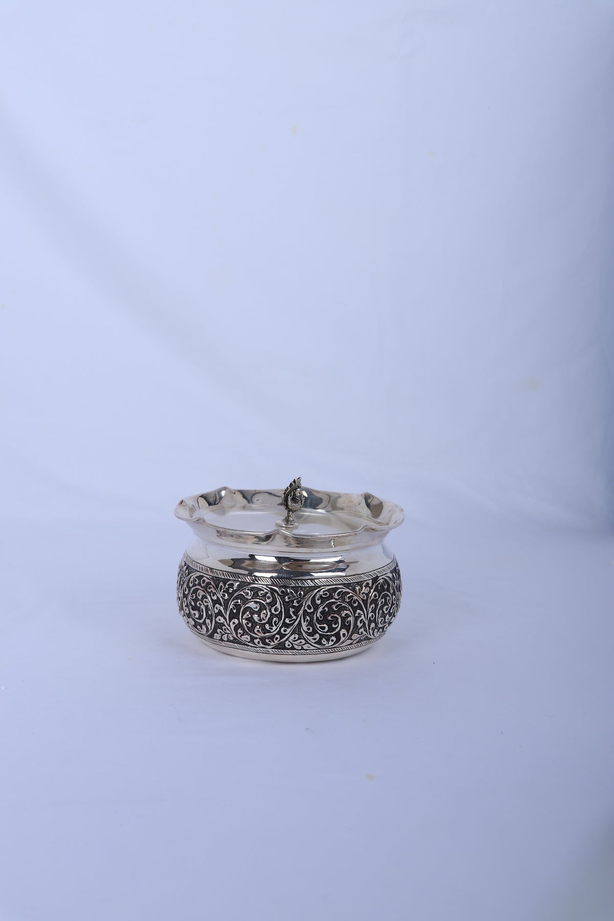 Type: Indian Handcrafted 92.5% Premium Silver Nakashi Bowl with Peacock Finial / Lidded Heritage Container