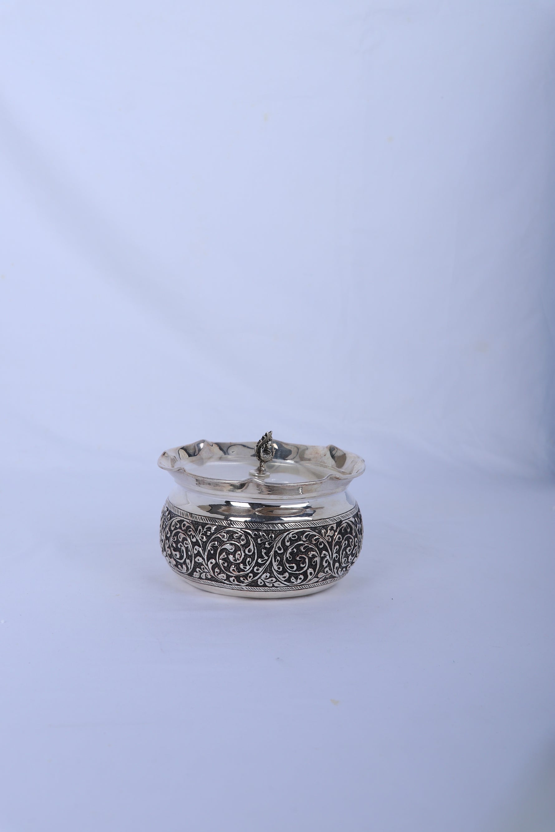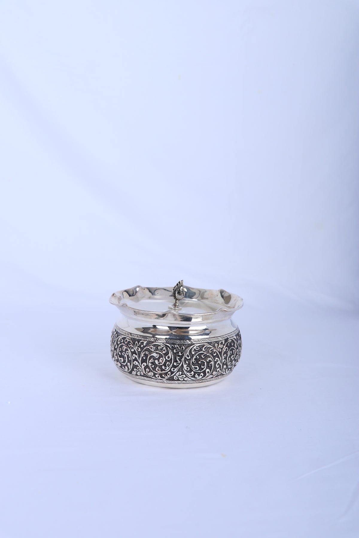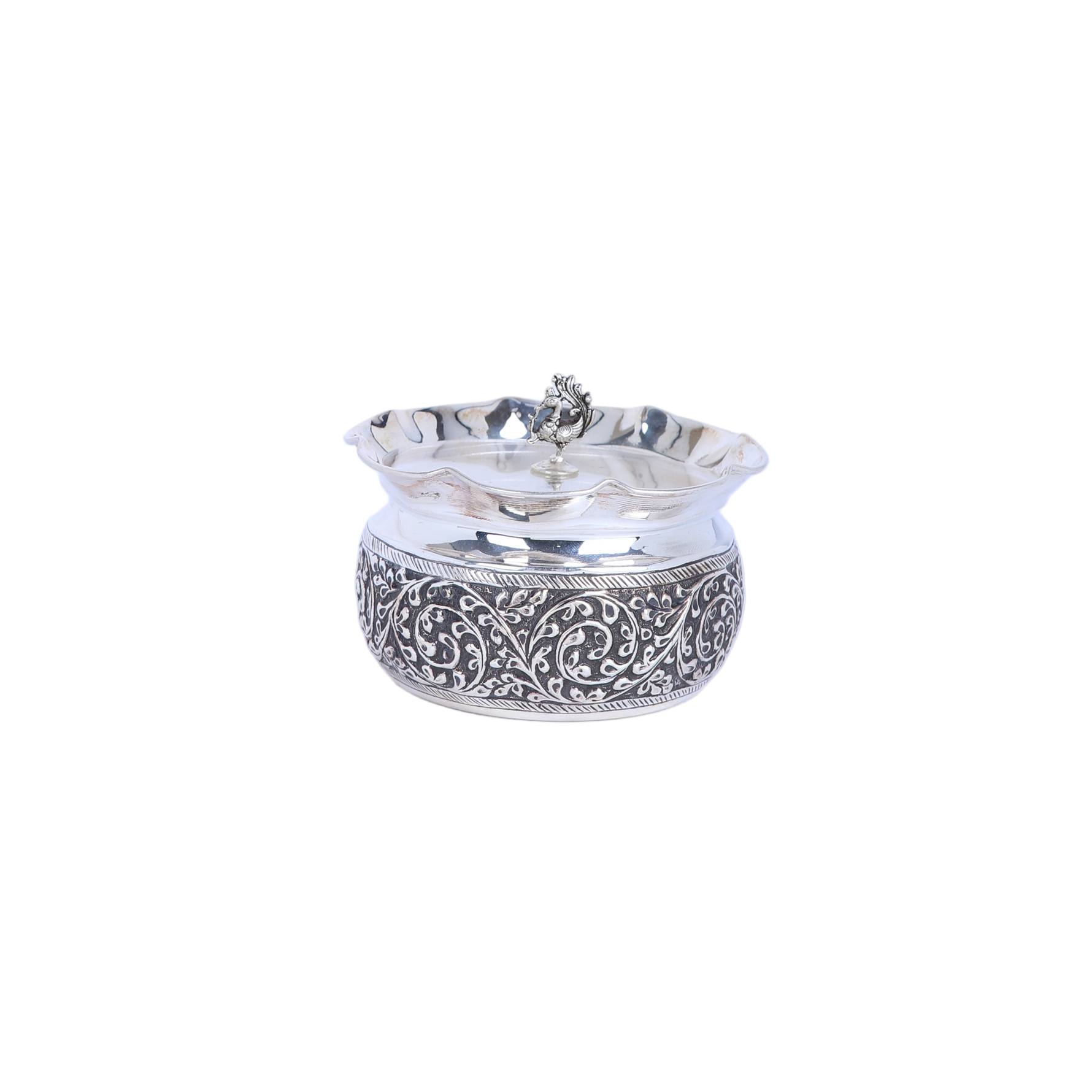 Craftsmanship: Features deep-relief nakashi floral scrollwork enveloping the cylindrical body with traditional rope-twist borders. The scalloped lid is crowned with a finely sculpted peacock motif, representing grace and prosperity. Made using traditional Indian repoussé and chasing techniques.