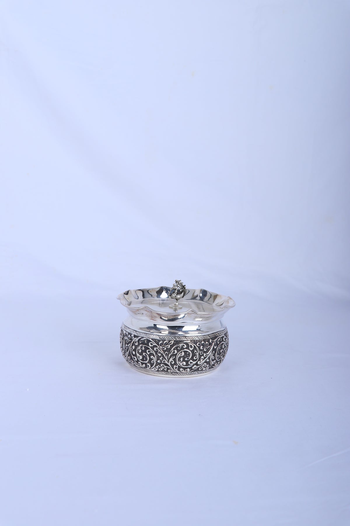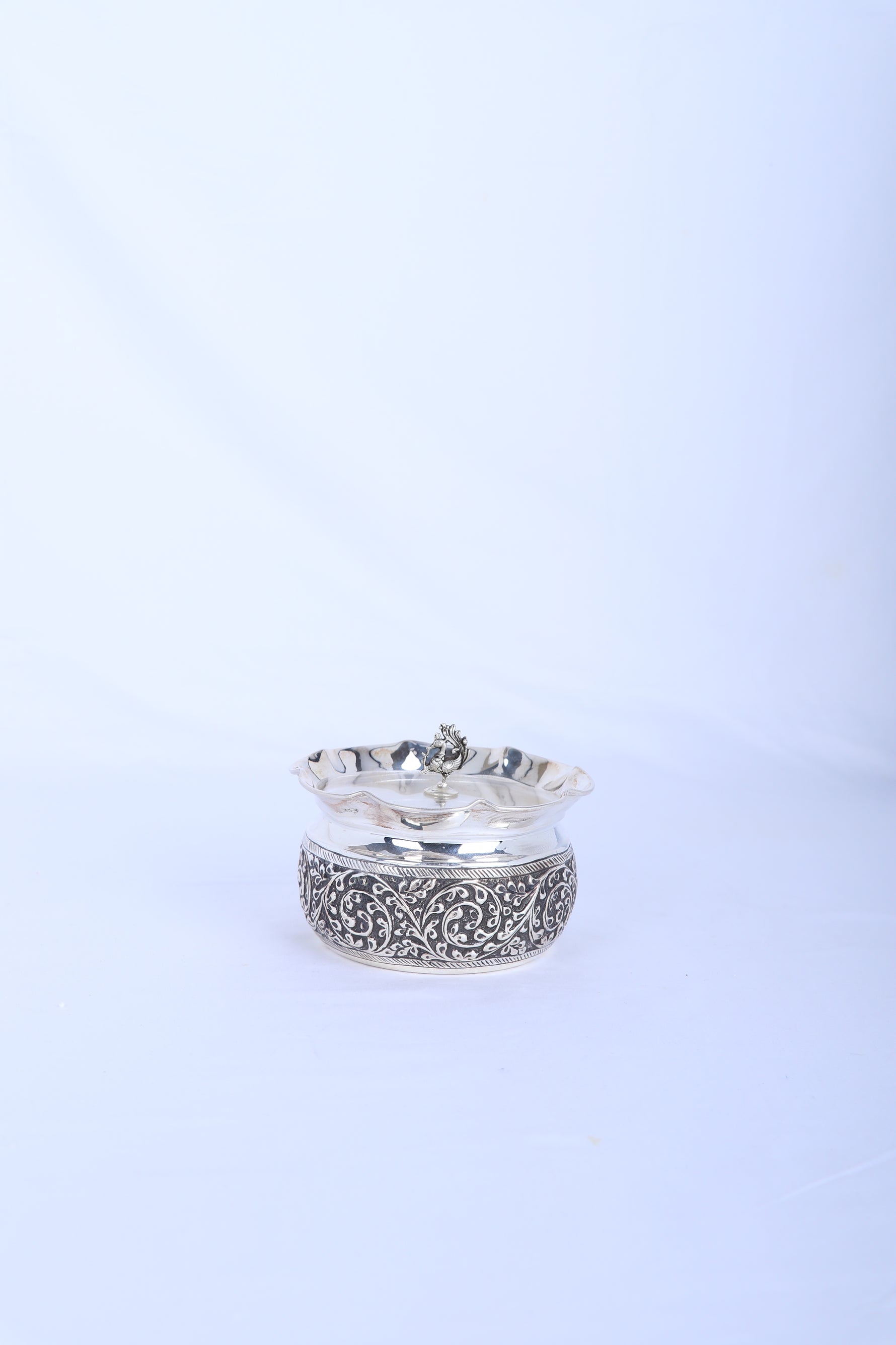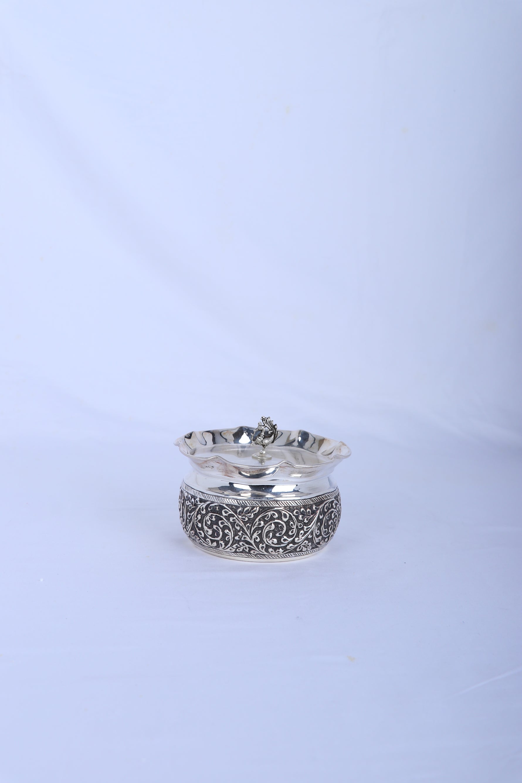 Craftsmanship: Features exquisite hand-engraved nakashi work covering the cylindrical body with deep-relief floral vine scrollwork. The domed lid is crowned with a graceful peacock finial symbolizing prosperity and elegance. Side handles provide practical functionality while enhancing the ceremonial aesthetic. Handcrafted using traditional Indian repoussé, chasing, and nakashi techniques.
