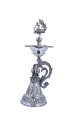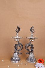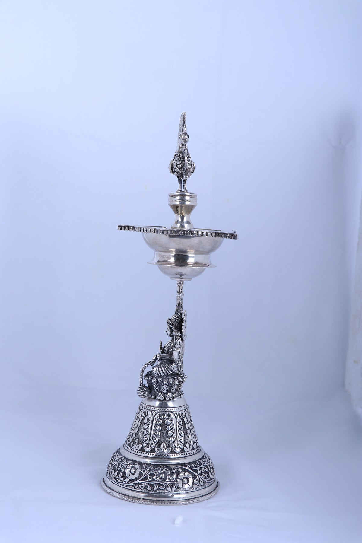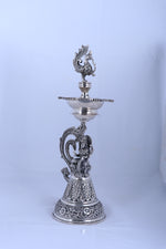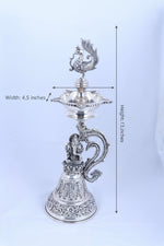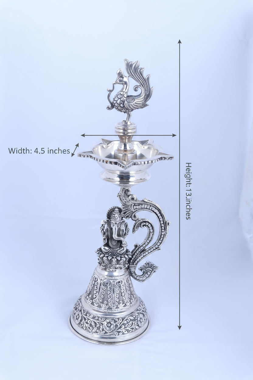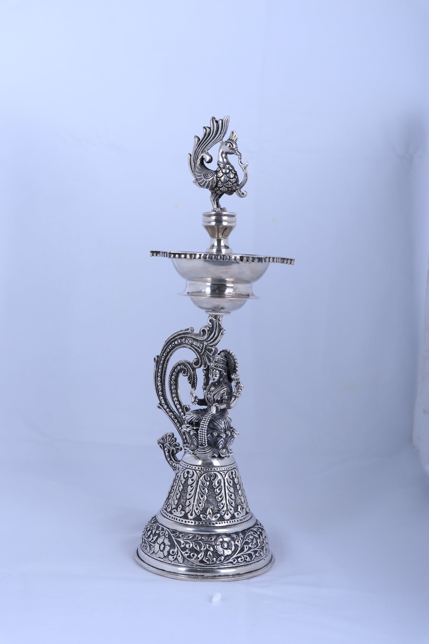 Elevate your spiritual practice with this magnificent Premium Brass Lakshmi Ganesha Ceremonial Oil Lamp Pair, a stunning representation of traditional Indian craftsmanship. This ornate deepak stand set features intricate peacock motifs and divine figurines, creating an atmosphere of sacred elegance during worship.