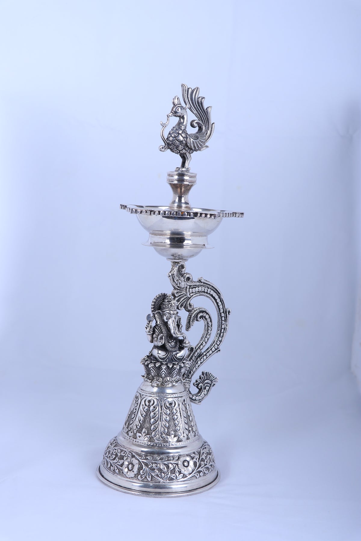 Premium Brass Lakshmi Ganesha Ceremonial Oil Lamp Pair - Ornate Peacock Design Deepak Stand Set