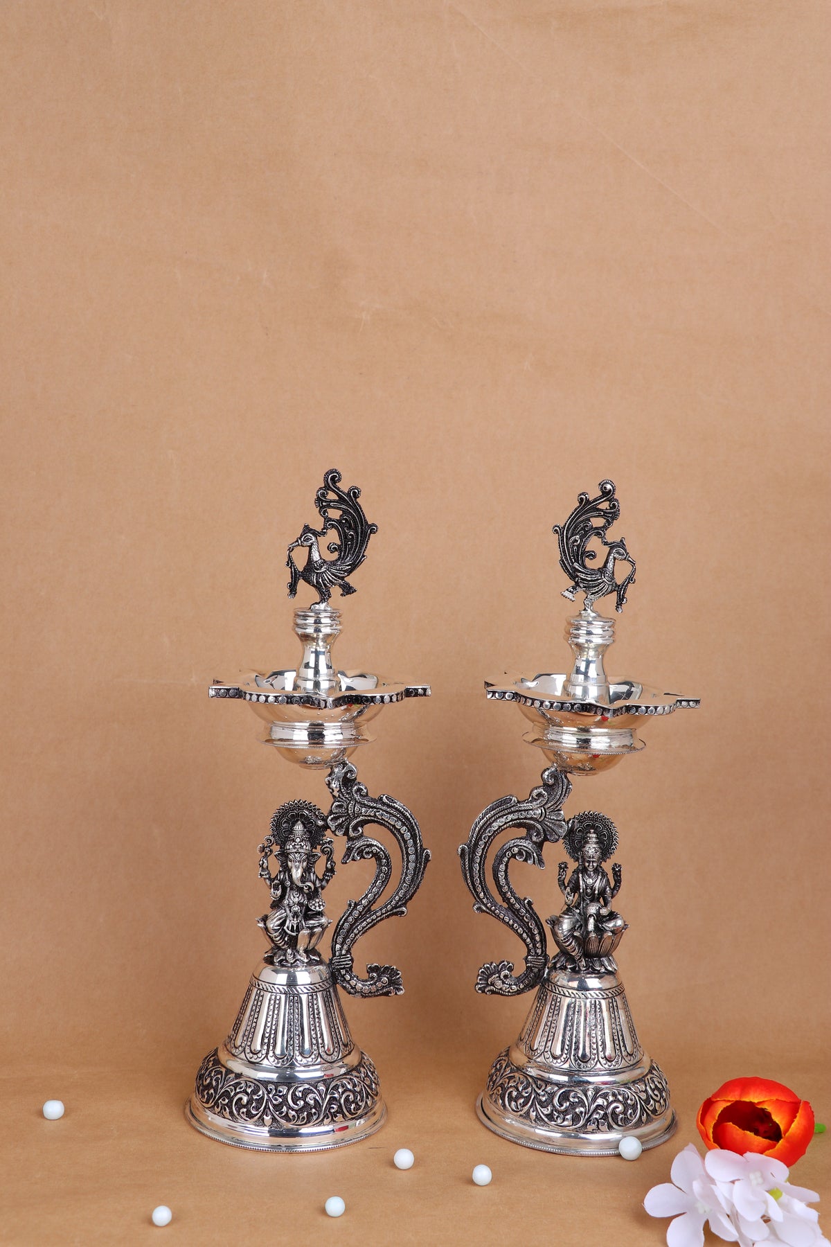 Exquisite pair of brass ceremonial oil lamps featuring Lord Ganesha and Goddess Lakshmi with ornate peacock designs, perfect for worship rituals and festival celebrations.