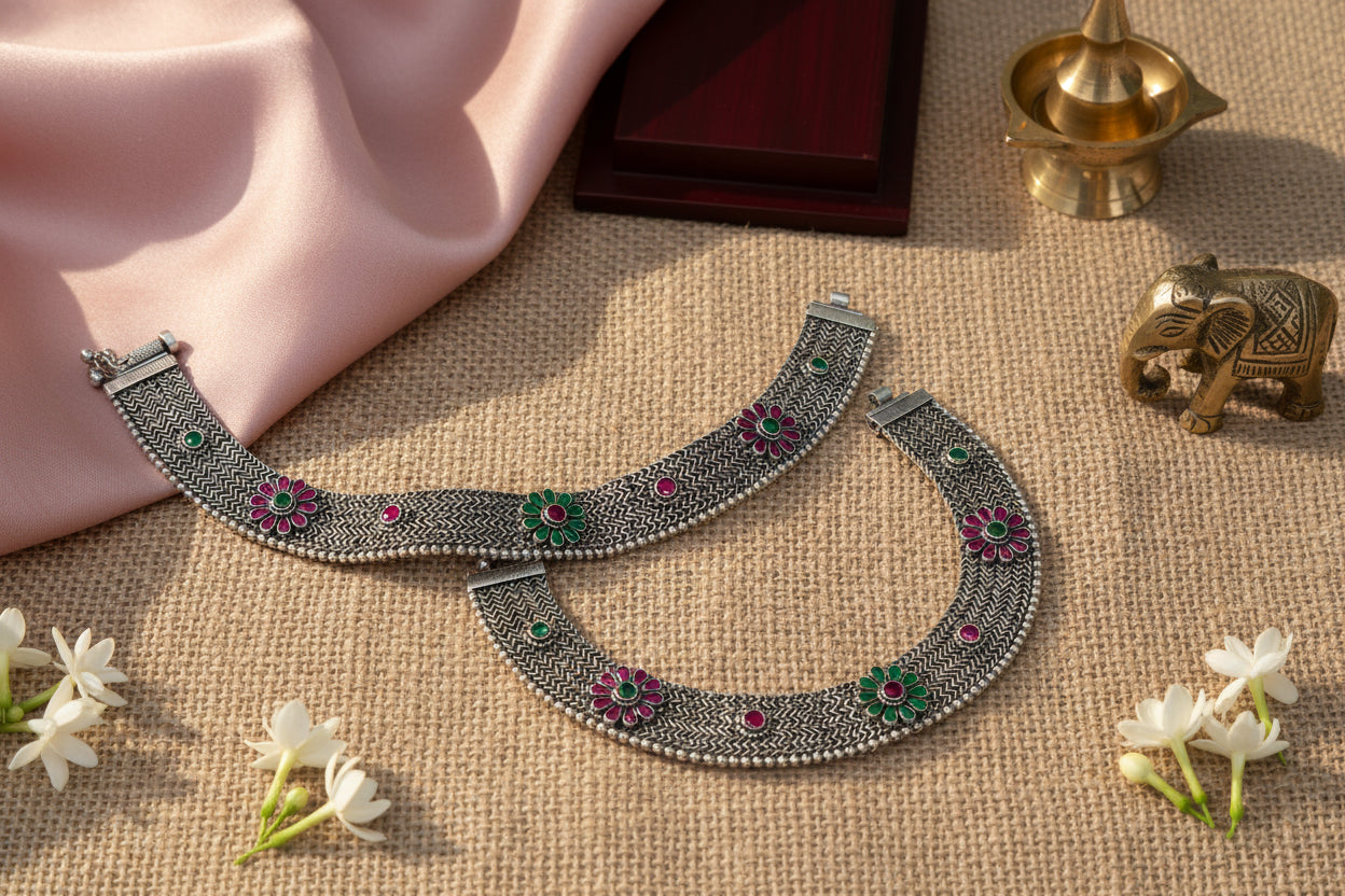 Handcrafted from certified 925 sterling silver, these elegant anklets combine traditional artistry with lasting quality. The intricately designed pair features delicate strands and beads that create graceful movement, finished with a brilliant high-polish luminescence. Anti-allergenic and durable, they're equally suited for festive occasions or everyday wear. A timeless investment piece that makes a meaningful gift for celebrations, anniversaries, and cherished milestones.