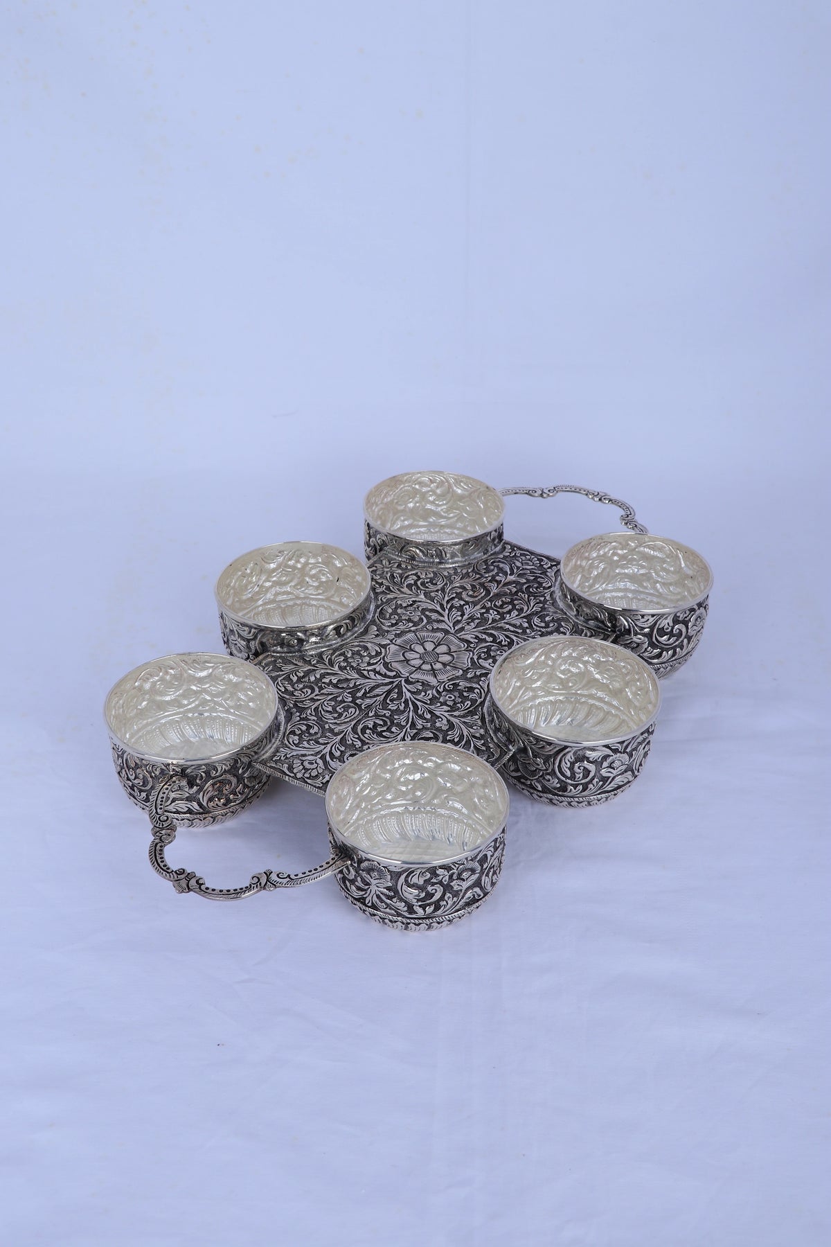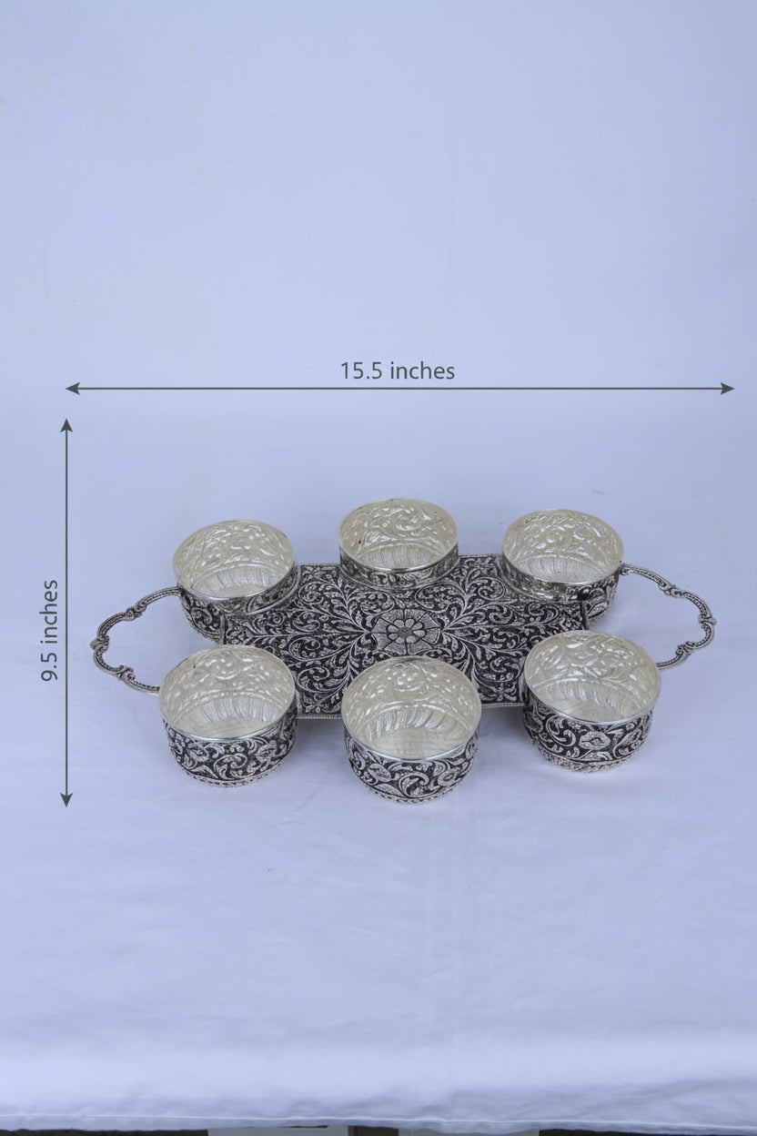 Hand-chased 925 sterling silver serving bowl featuring traditional Nakshi floral detailing. This 605-gram piece combines certified purity with expert craftsmanship, offering a hygienic surface ideal for fruits and dry fruits. The mirror-polished finish reflects light elegantly, transforming any table setting. Perfect as a heirloom gift for weddings or housewarmings, it represents both cultural heritage and lasting quality.