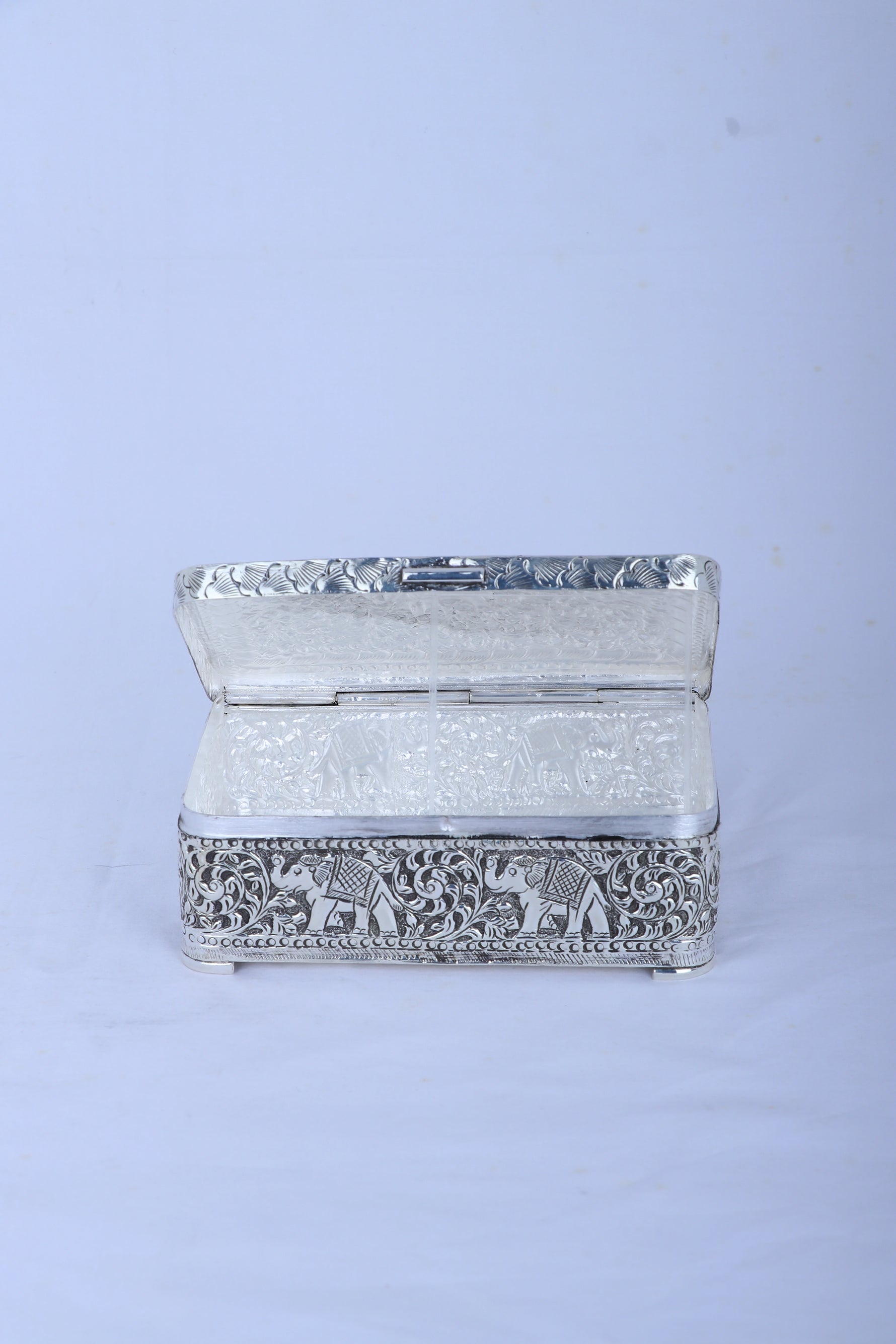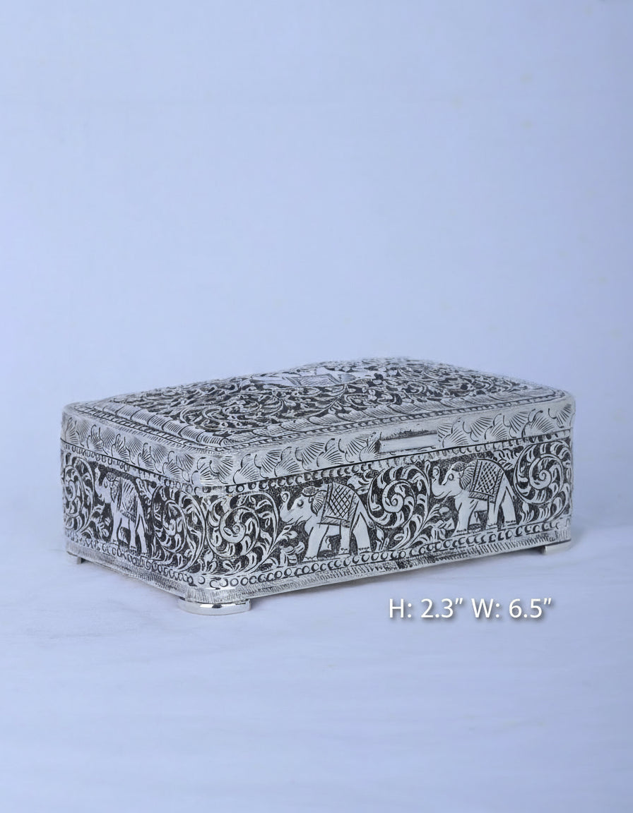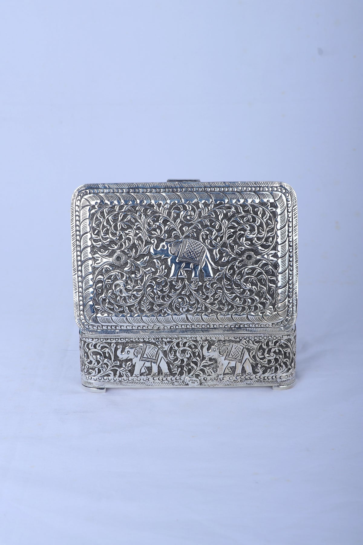 | Design | Rectangular box with carved elephant motifs on the sides and floral carving on the lid |