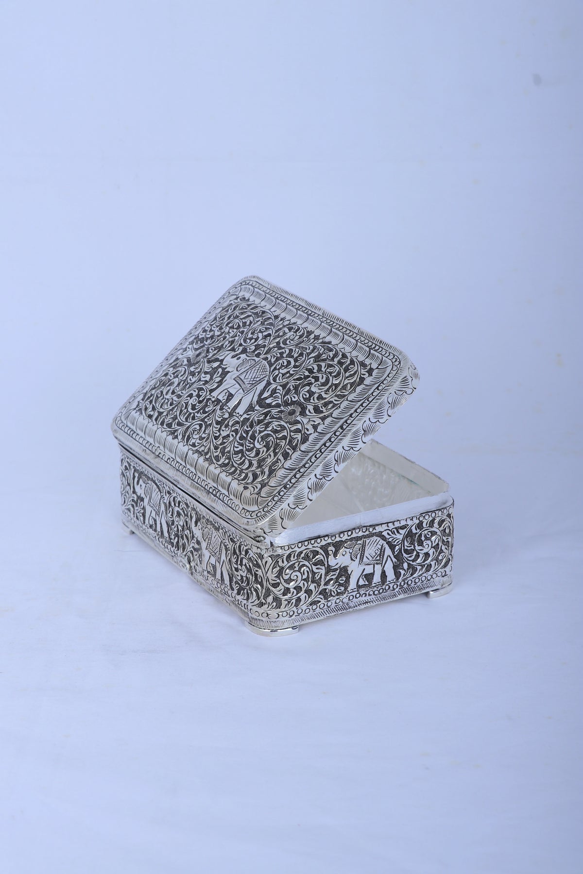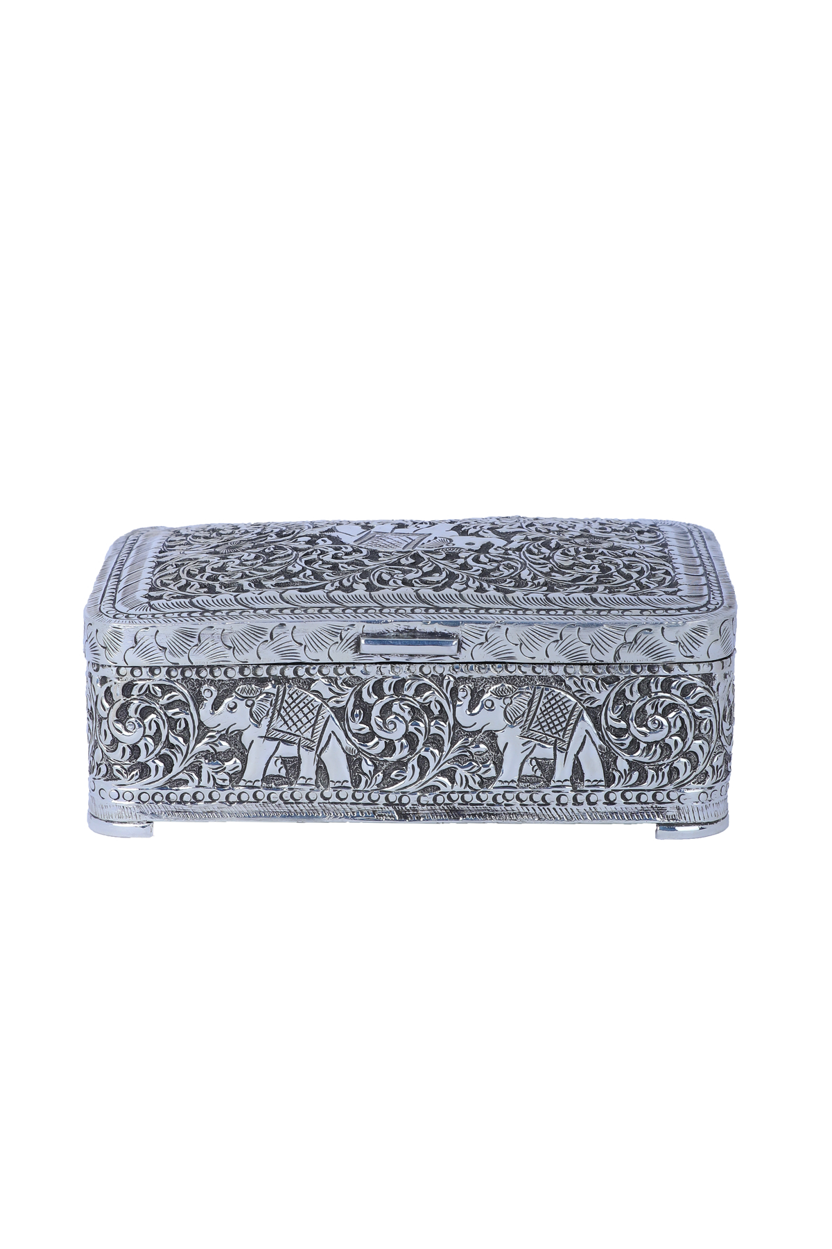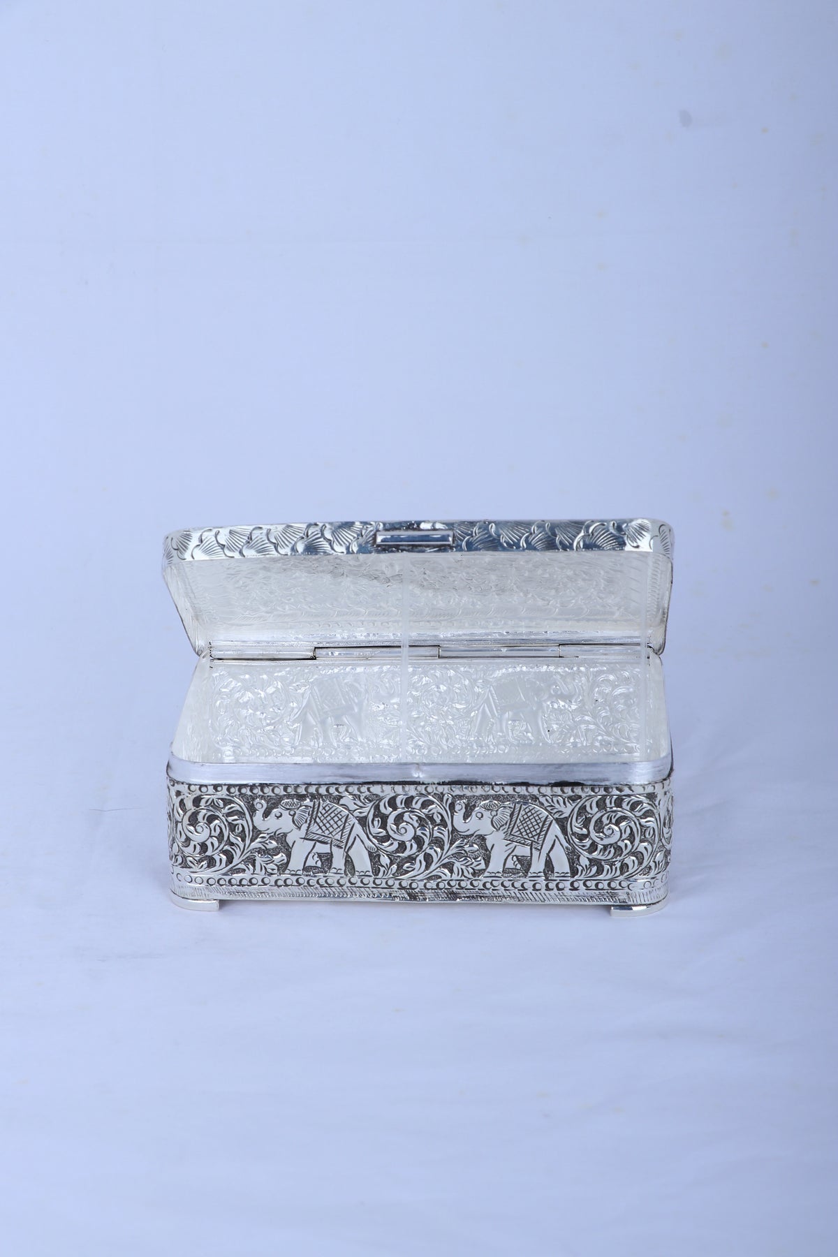 | Design | Rectangular box with carved elephant motifs on the sides and floral carving on the lid |