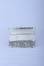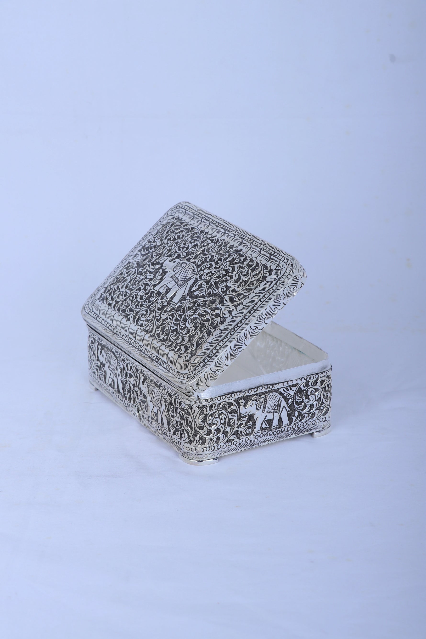 This heavy silver jewellery box is crafted from 925 pure silver with finely carved elephants and intricate floral designs. Its antique finish enhances the detailed work, making it both a beautiful and durable storage solution. Ideal for keeping jewellery, dry fruits, or religious items, it symbolizes good fortune and strength. This elegant piece serves as a meaningful gift for weddings or housewarmings, offering timeless beauty and lasting value.