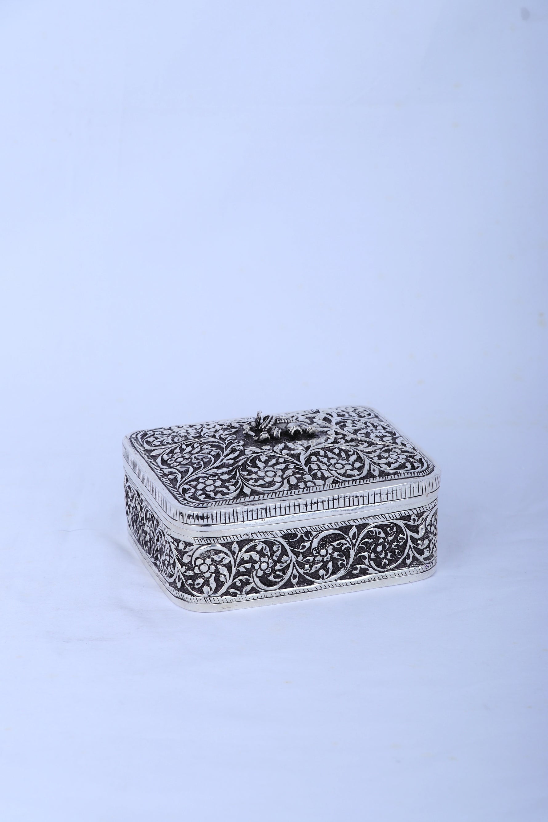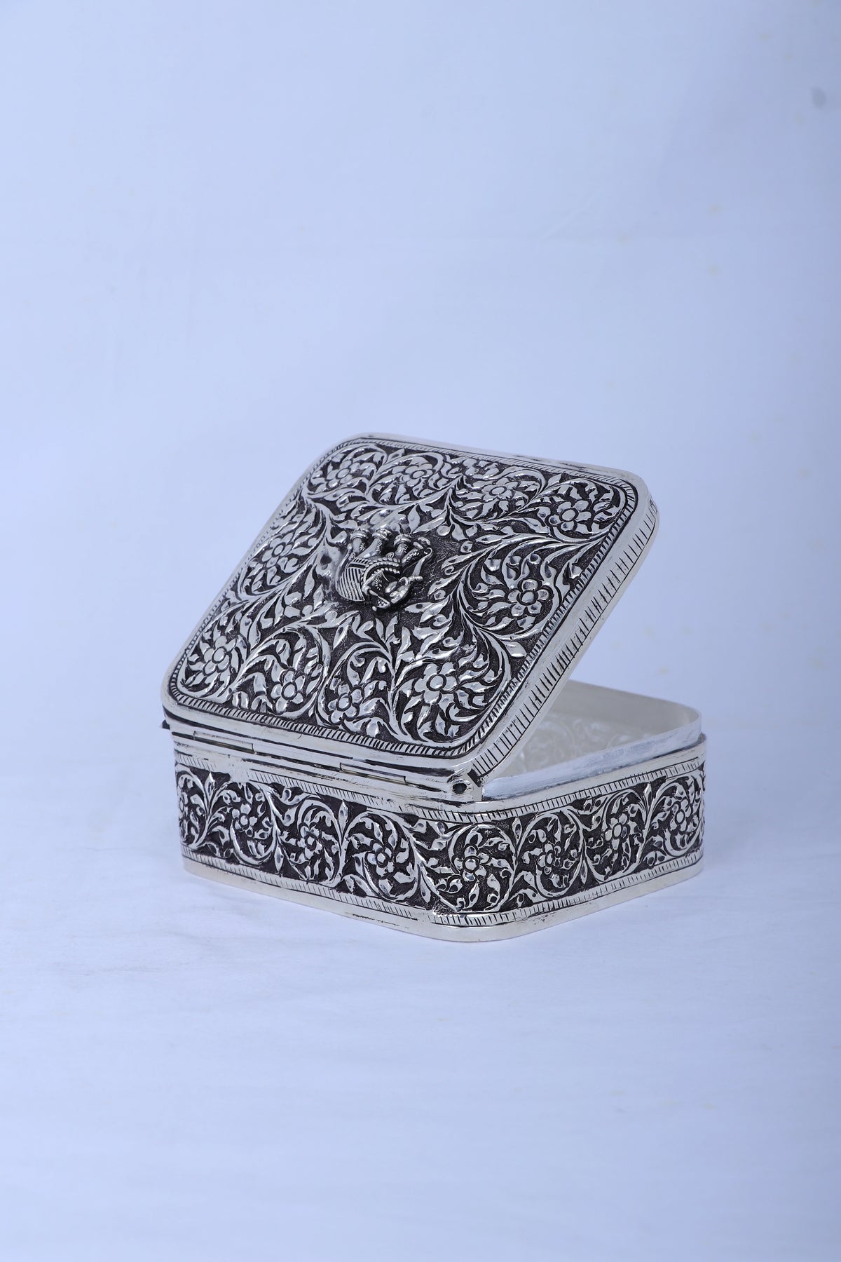 | Design | Rectangular box with dense floral carving and a miniature elephant sculpture on the lid |