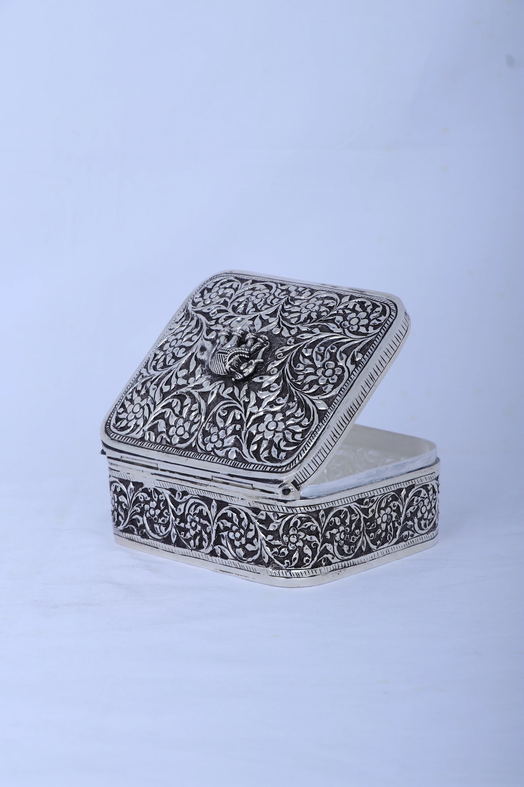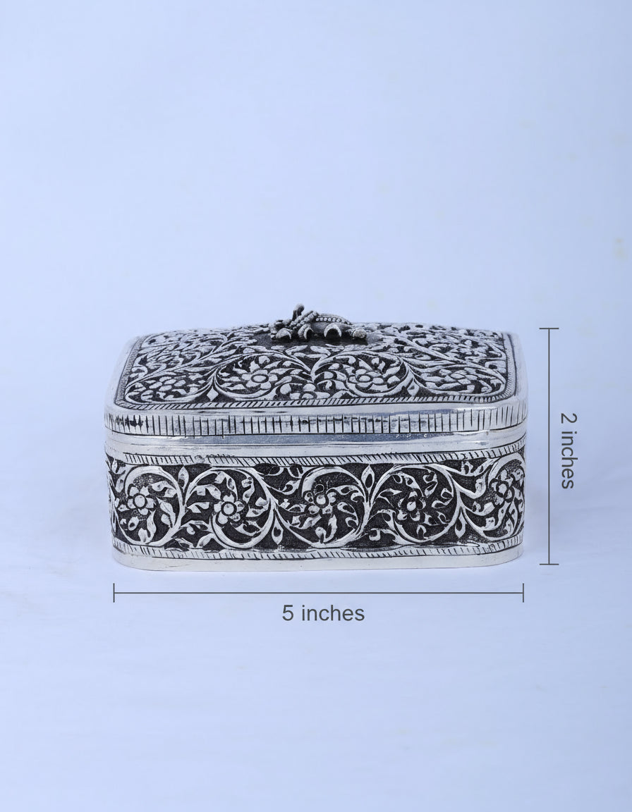 This 442g handcrafted jewel box is made of 925 pure silver with intricate floral and vine patterns. Topped with a detailed elephant motif symbolizing good fortune, it features a rich antique finish that highlights its craftsmanship. Ideal for storing jewelry, dry fruits, or religious offerings, it adds elegance to any pooja room or living space. Durable and timeless, this silver box makes a meaningful heirloom gift for weddings, anniversaries, or housewarmings.