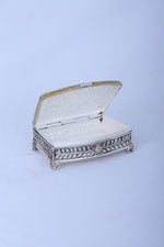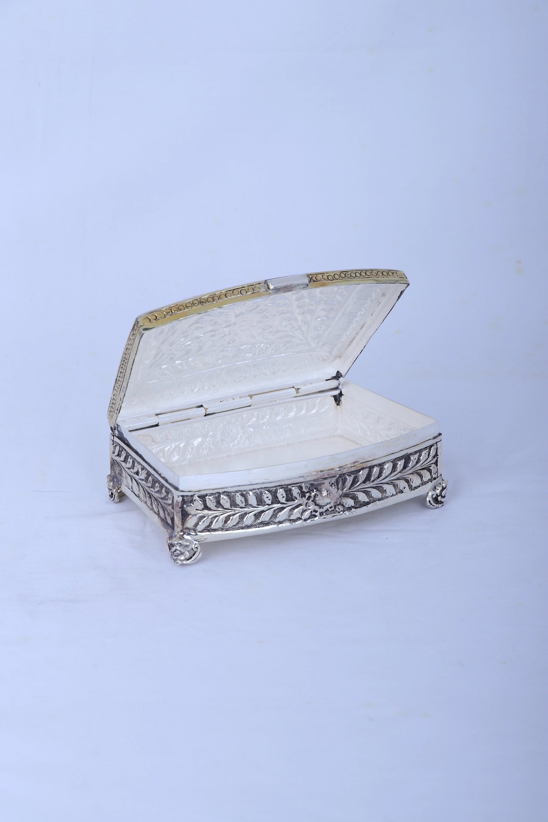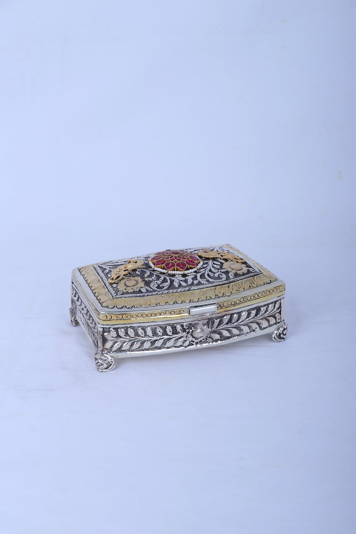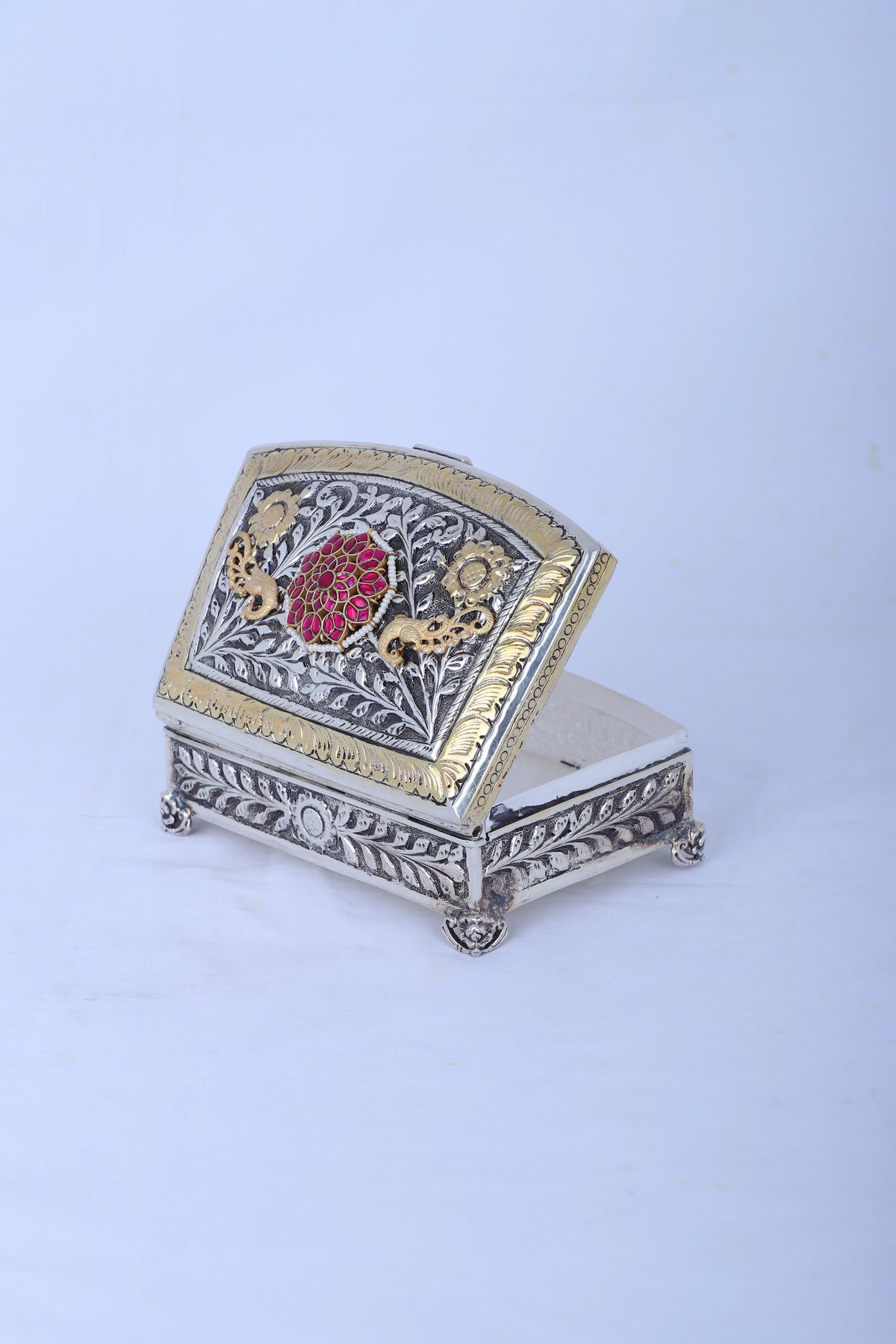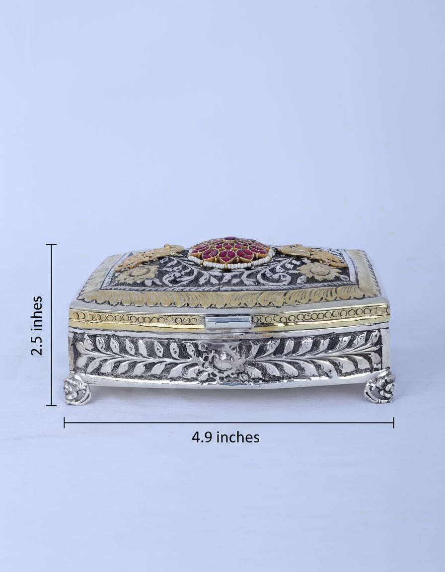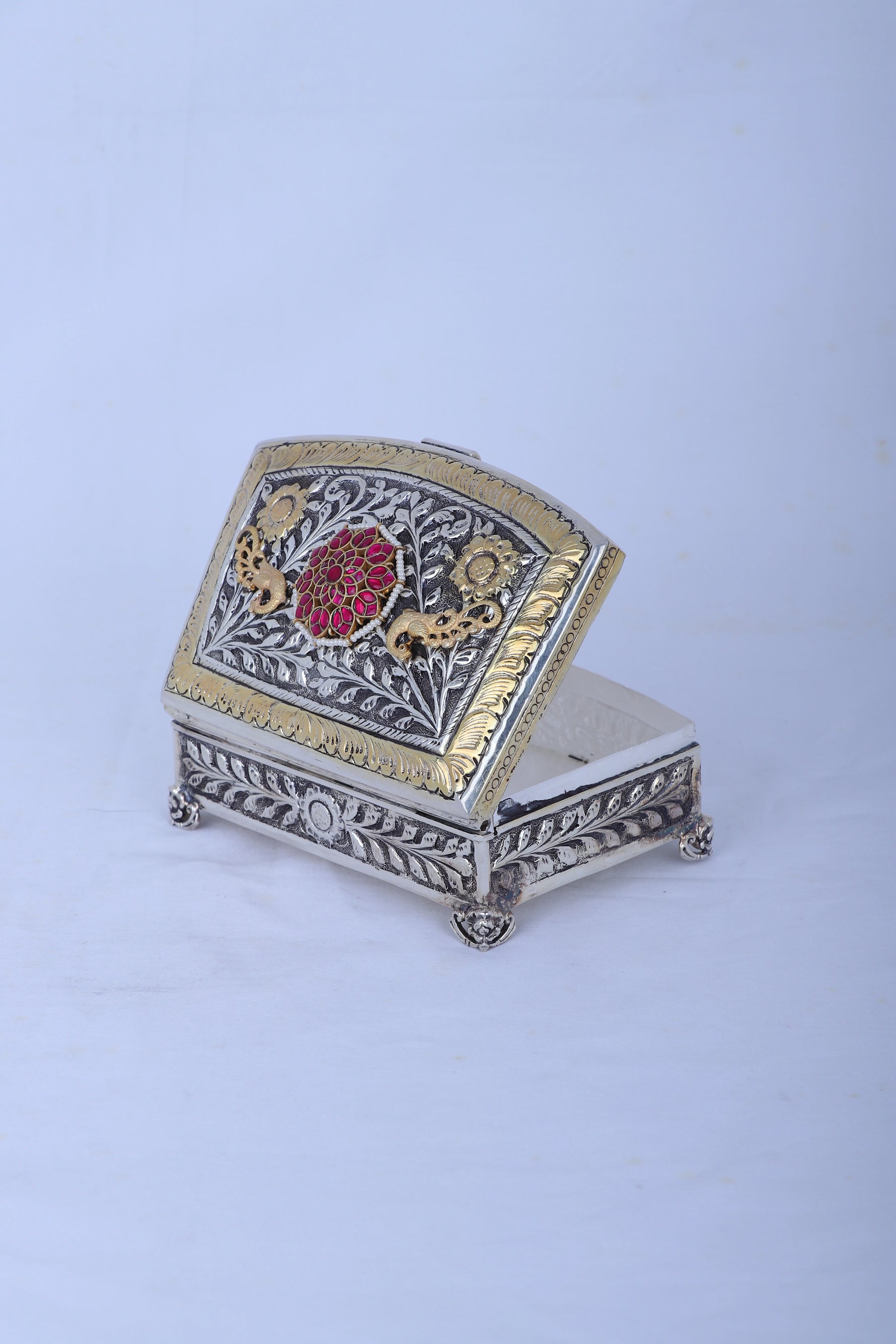 | Design | Square Box with intricate floral carvings, central jewel, and two gold-plated peacocks |