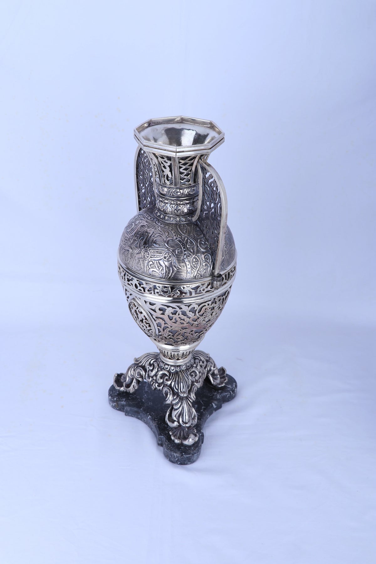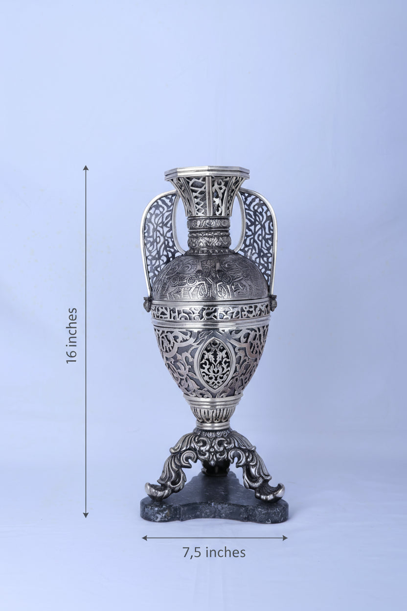 This impressive 16-inch vase, crafted from 925 pure silver and weighing over 2.5 kg, showcases detailed hand-chased filigree and openwork carvings. Its sturdy three-footed base and ornate handles enhance its grand presence. Ideal as a centerpiece for ceremonial spaces or special poojas, this vase combines lasting quality with timeless elegance. It makes a distinguished heirloom gift for major family milestones, symbolizing enduring value and refined sophistication.