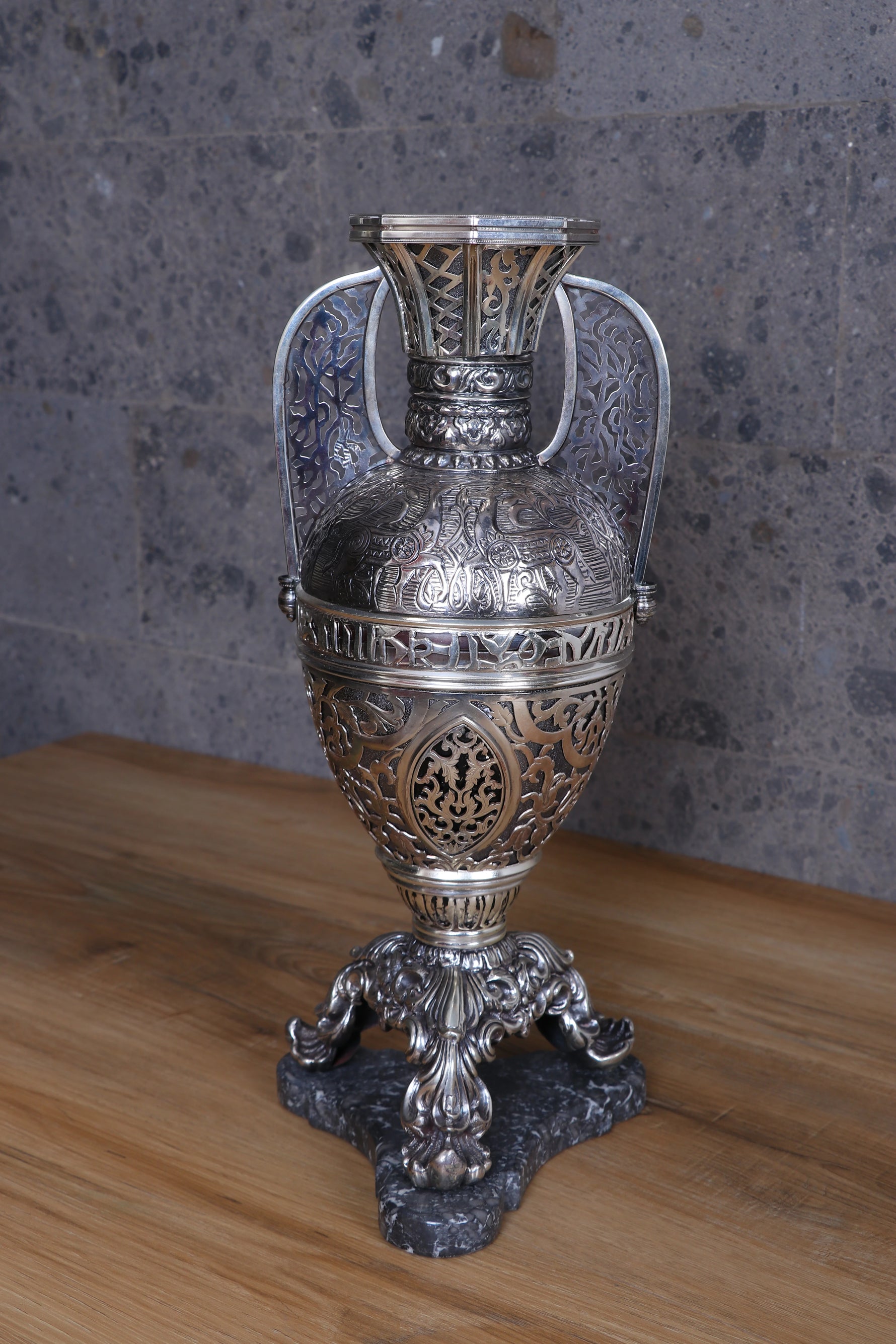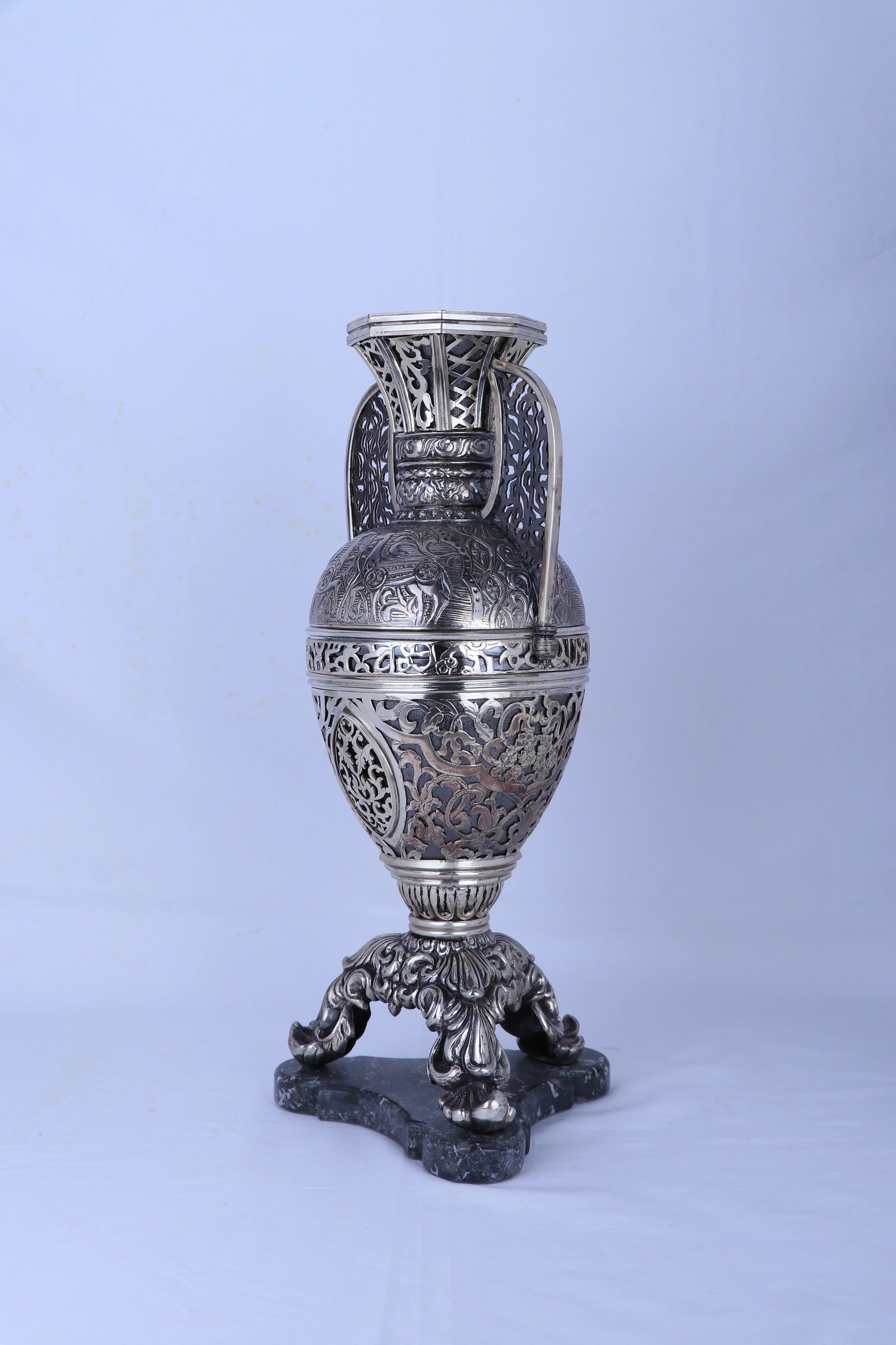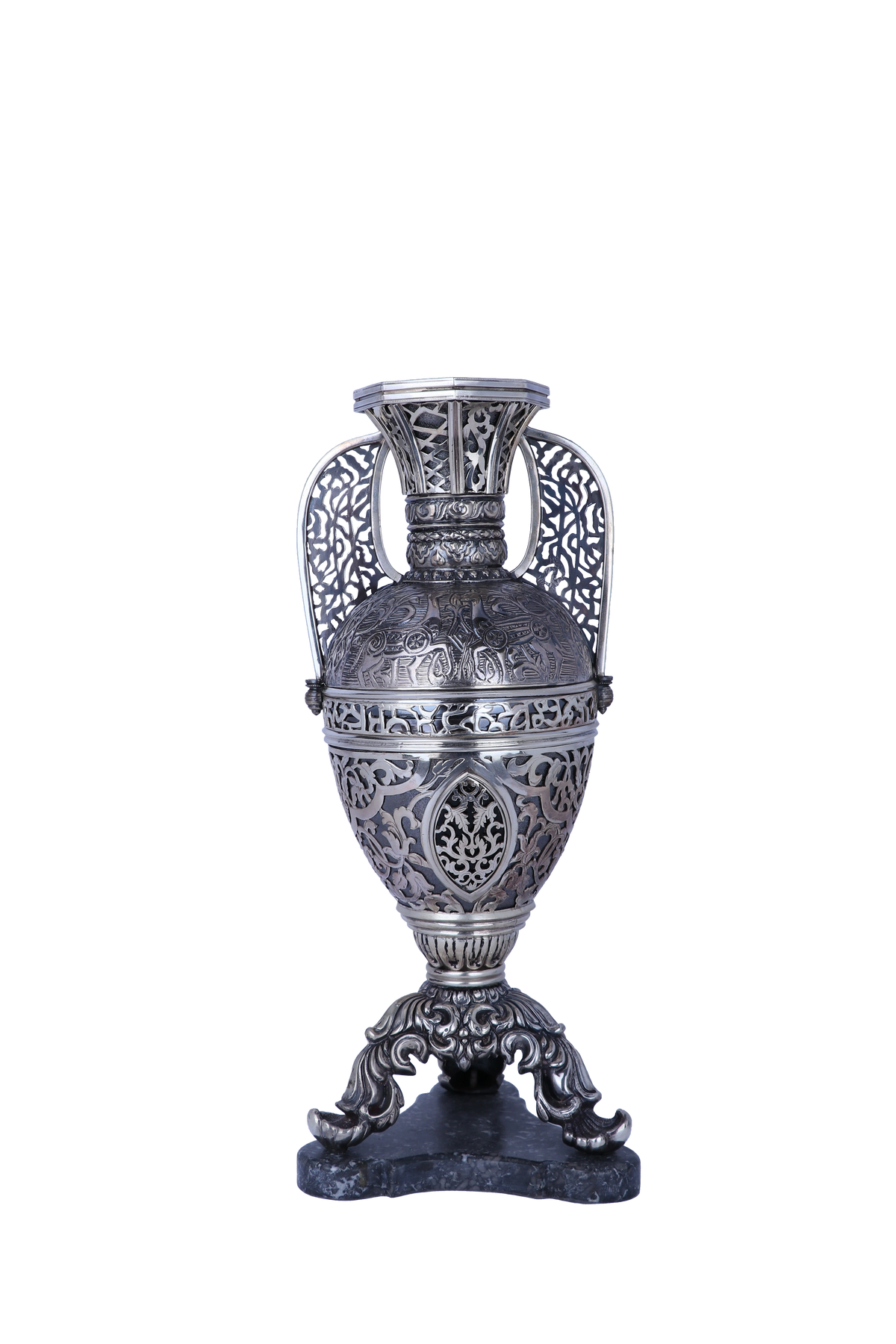 | Design | Tall Urn with Ornate Openwork Handles, Filigree Body, and Scrolled Three-Footed Base |