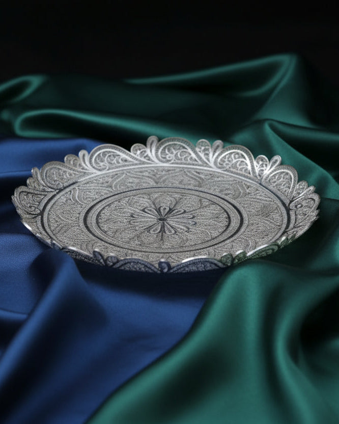 Exquisite 925 sterling silver decorative plate featuring intricate Filigree (Tarakasi) artistry. Hand-crafted with delicate, coiled silver threads forming intricate floral patterns that allow light to filter through, creating a luminous visual effect. Perfect as a home decor centerpiece, pooja altar offering vessel, or heirloom gift. Certified pure silver ensures lasting durability and timeless elegance across generations.
