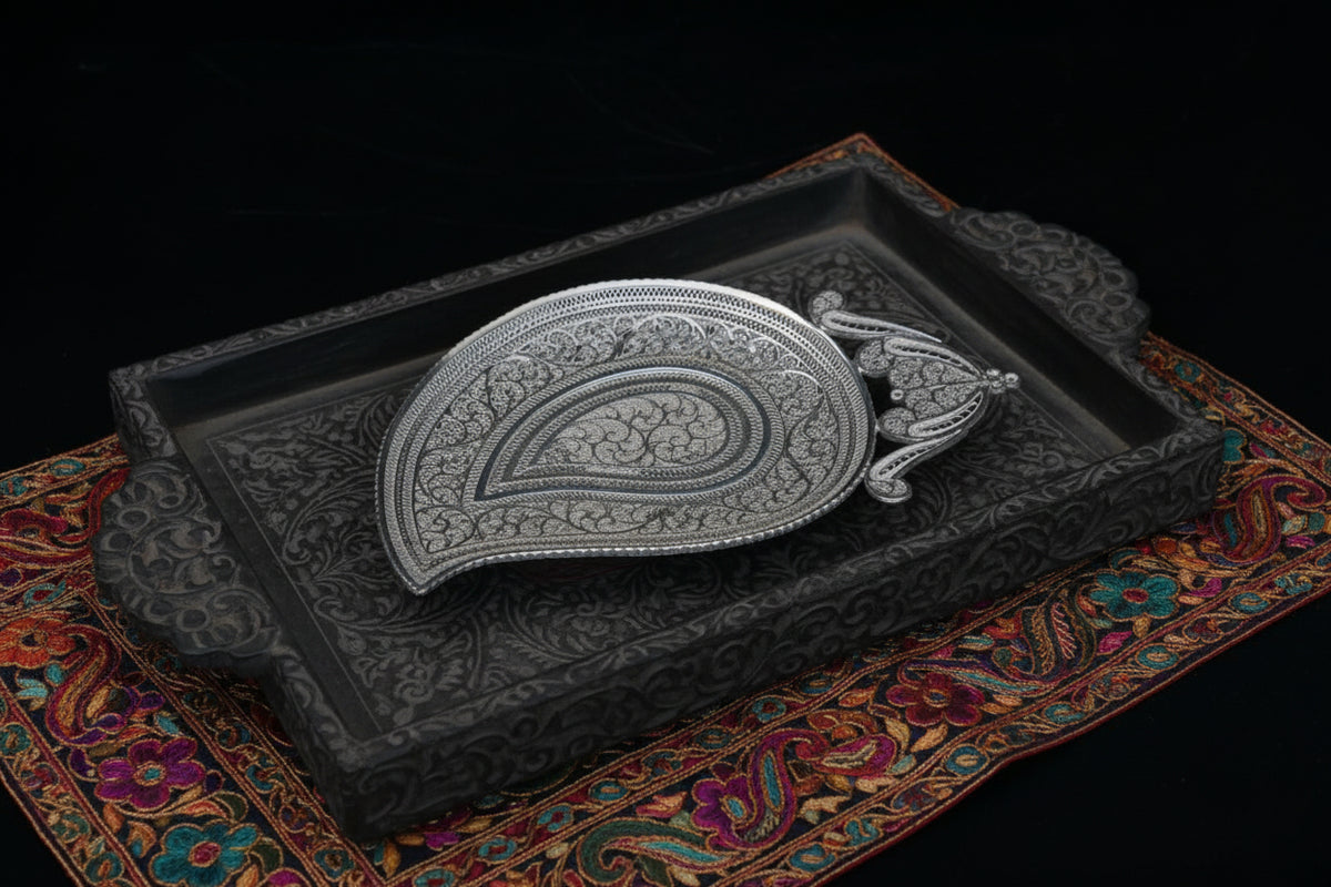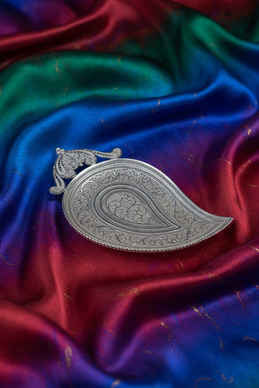 Elevate your home with this exquisite 925 sterling silver tray, masterfully shaped like a traditional mango—a symbol of prosperity and abundance. Its mirror-polished finish and graceful curves make it an ideal centerpiece for coffee tables or display shelves. Perfect for serving during festivals, presenting offerings during Pooja, or gifting for weddings and housewarmings, this certified pure silver piece combines timeless Indian aesthetics with lasting durability. A meaningful heirloom that transcends generations.