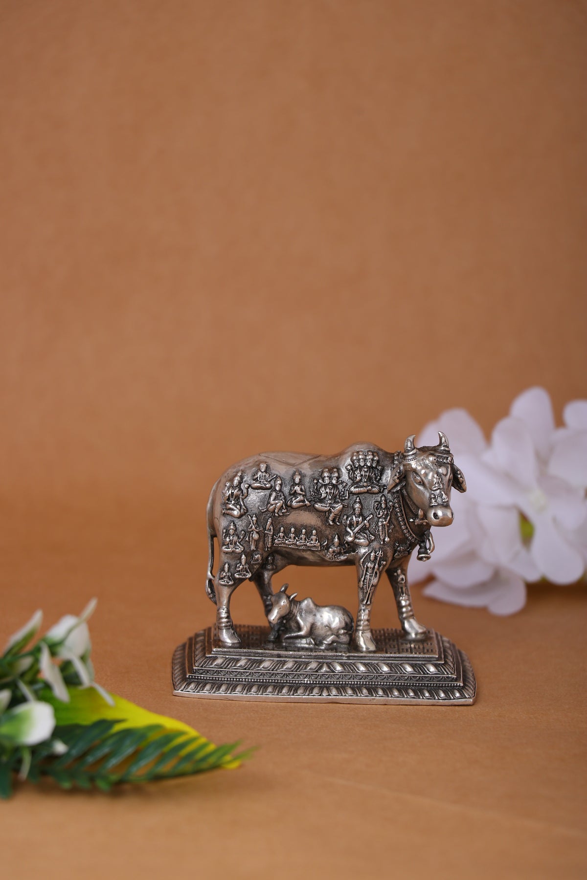 This sacred sculpture embodies the ultimate representation of Kamdhenu, the celestial wish-fulfilling cow who emerged during the cosmic ocean churning (Samudra Manthan). According to Hindu scriptures, Kamdhenu contains the entire universe within her sacred form—her horns represent the Trinity (Brahma, Vishnu, Shiva), her eyes symbolize the Sun and Moon, her shoulders carry Agni and Vayu, and her four legs represent the four Vedas. This unique tableau captures the profound belief that all 33 crore Hindu deities reside within Kamdhenu's divine body, making her the ultimate source of spiritual nourishment and material abundance. The nursing calf represents the continuous flow of divine grace and the eternal bond between the cosmic mother and her devotees.