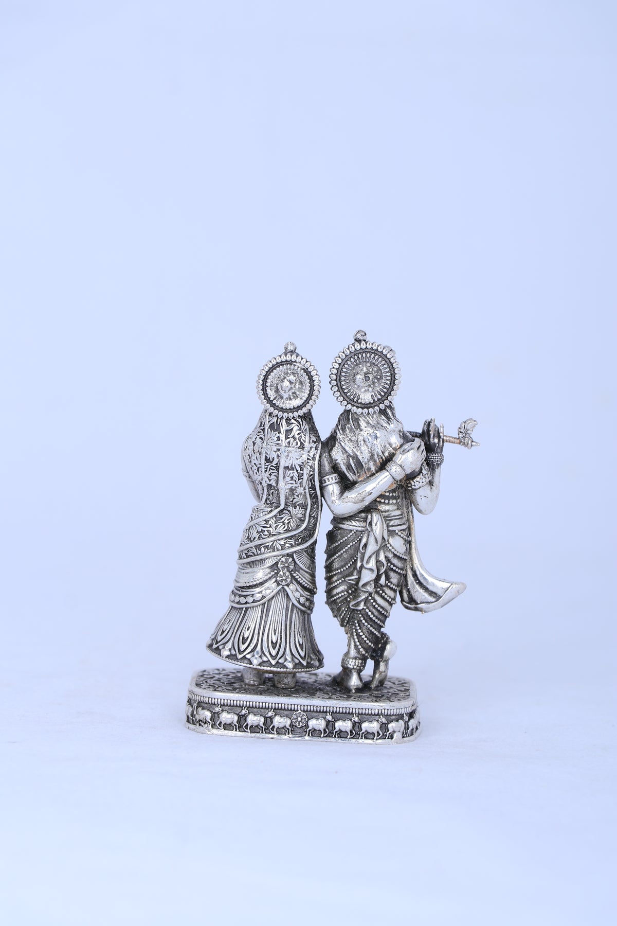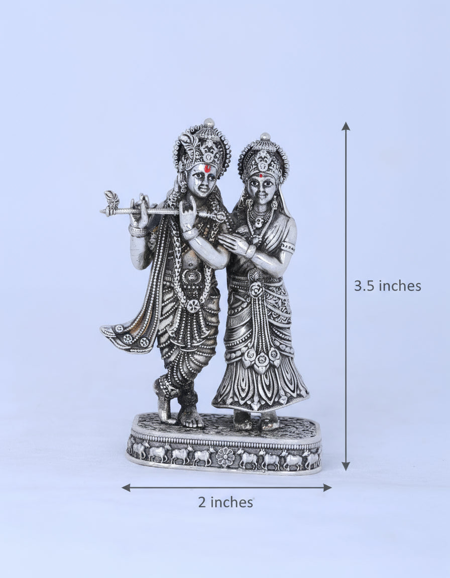 This handcrafted Radhe Krishna idol weighs 148 grams and is made from 925 pure silver with an antique finish. It features the divine couple together, capturing fine details in their expressions and attire. Ideal for home worship or special occasions, this silver murti symbolizes love, harmony, and devotion. A meaningful gift for weddings or anniversaries, it serves as both a spiritual centerpiece and a lasting silver keepsake.