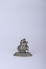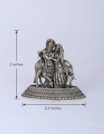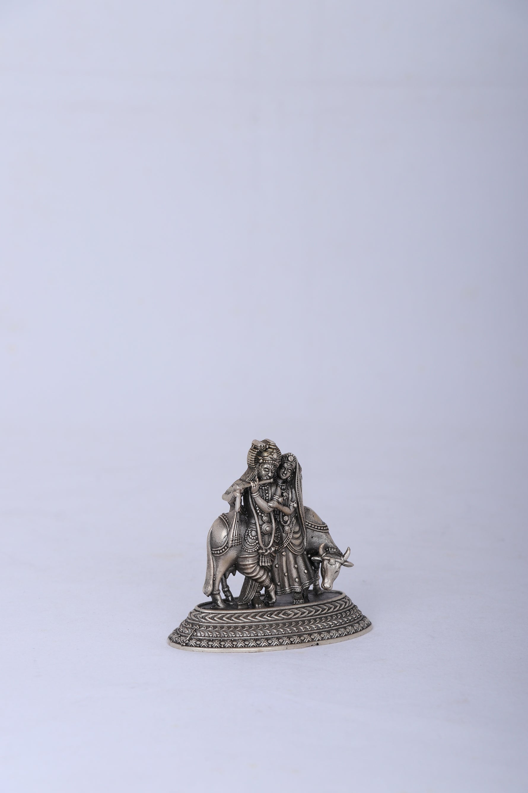 This exquisite Radha Krishna idol is crafted from 925 pure silver, featuring detailed artistry with Radha, Krishna, and a sacred cow on an antique-finished base. Perfectly sized for home pooja mandirs or office spaces, it brings peace and positivity to your surroundings. Durable and elegant, it suits daily worship and special occasions like Janmashtami. An ideal gift for weddings and housewarmings, this idol carries cultural significance and lasting value.