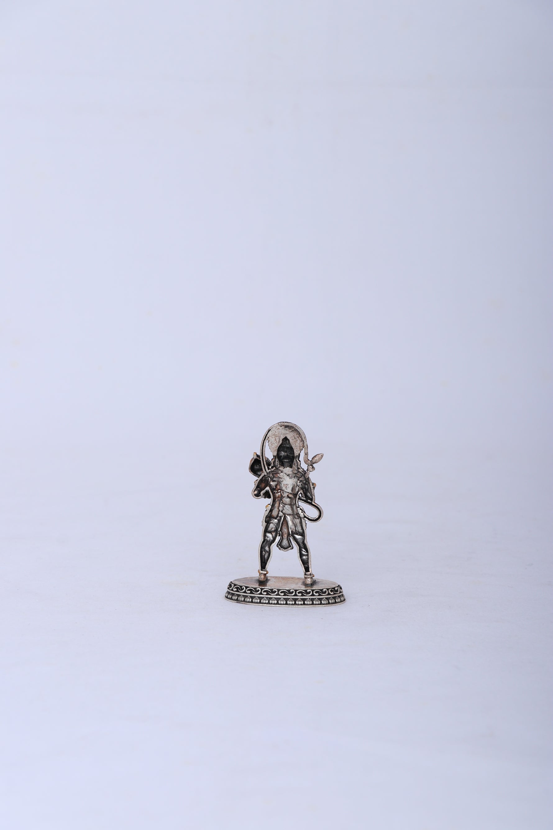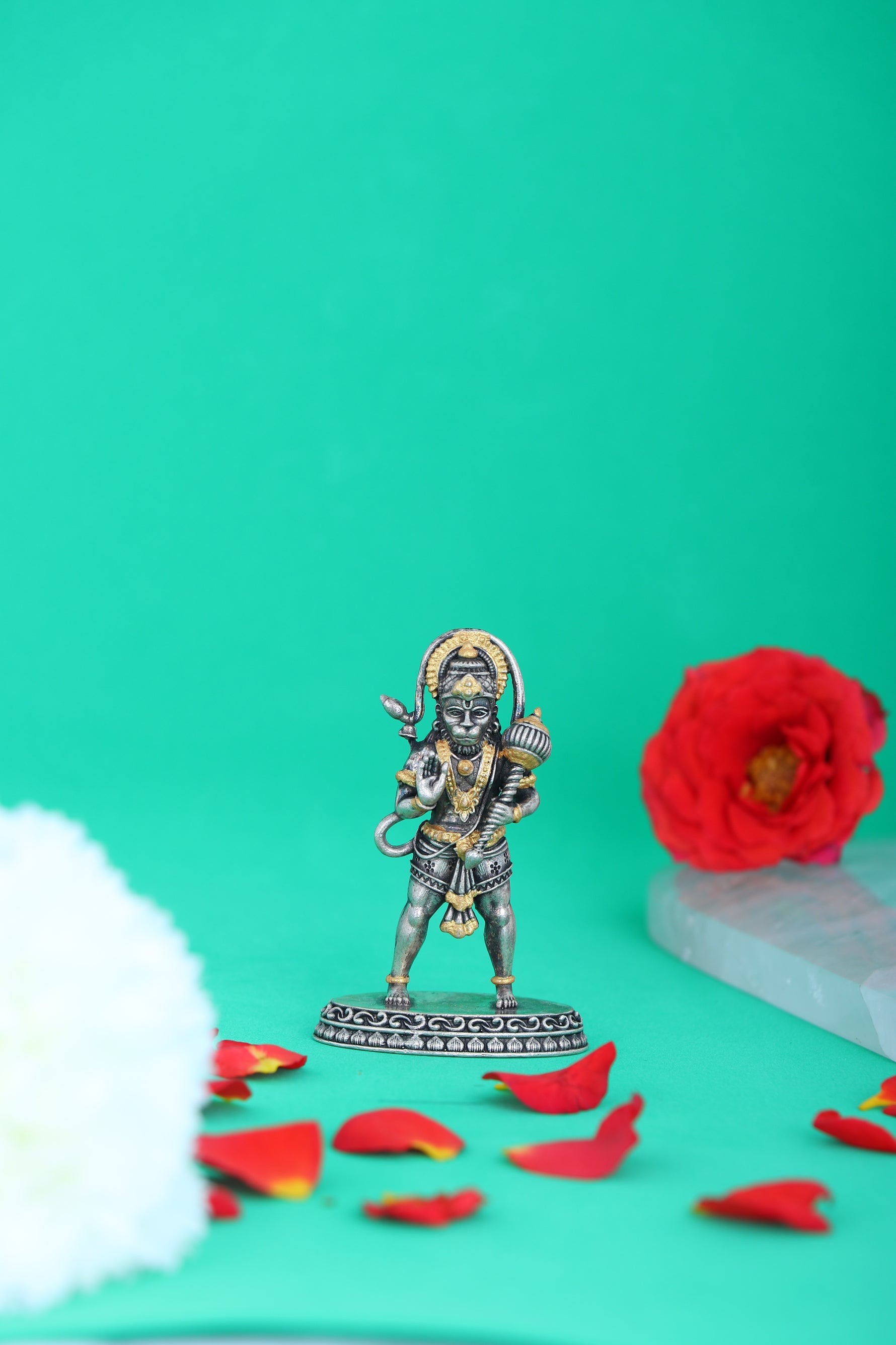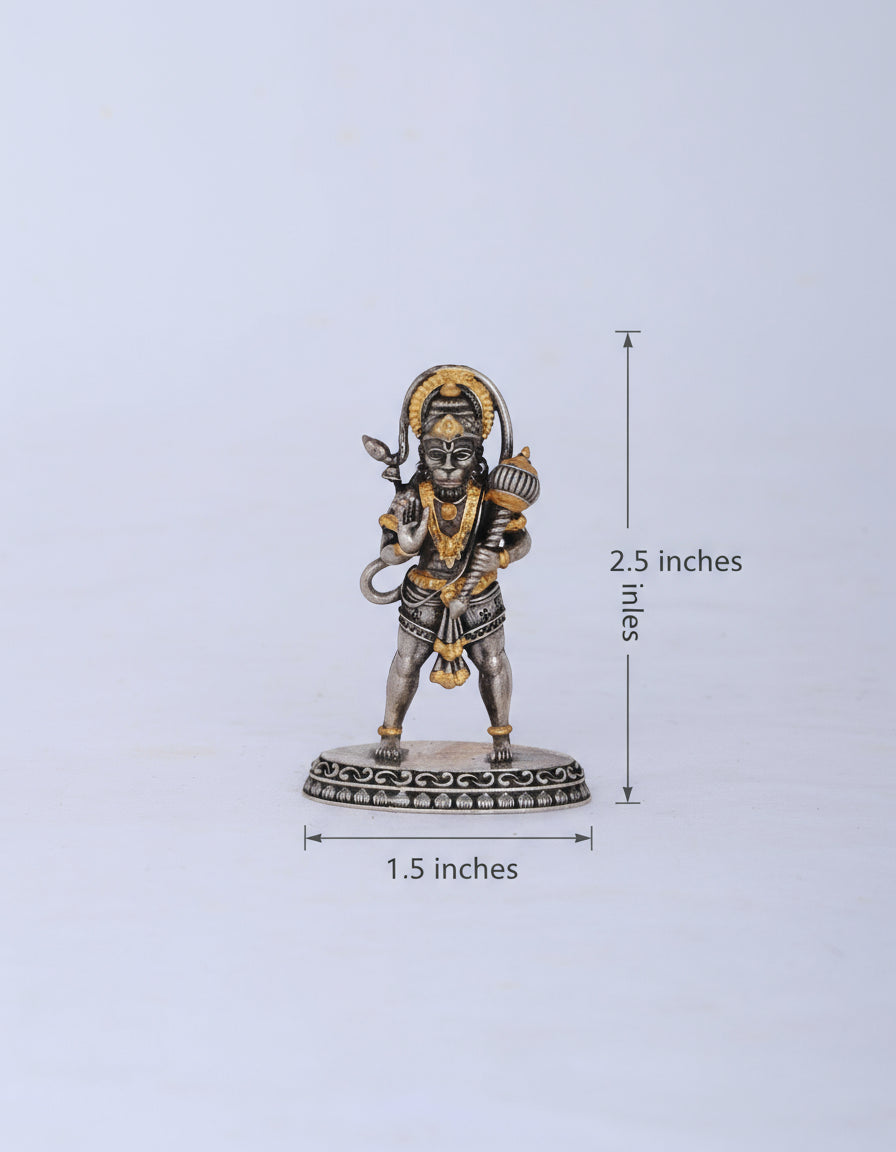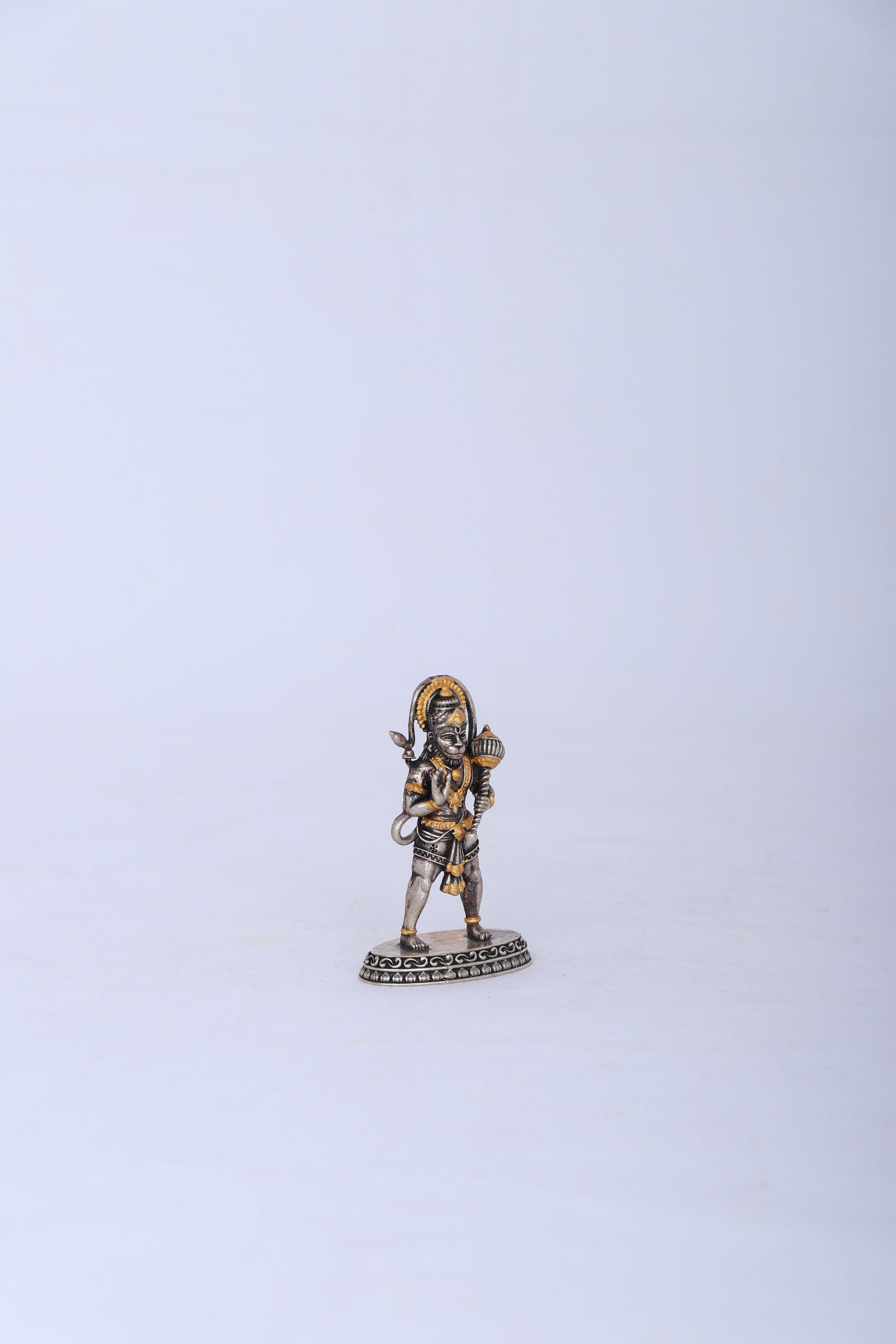 This 25g Hanuman idol is crafted from certified 925 pure silver with detailed gold accents on the crown and ornaments. Standing with a raised gada and blessing hand, it features a sturdy base and an antique mirror finish. Compact and durable, it suits small altars or desks, providing spiritual strength and protection. Ideal for daily worship, special occasions, or as a meaningful gift, this finely made murti combines traditional artistry with lasting shine.