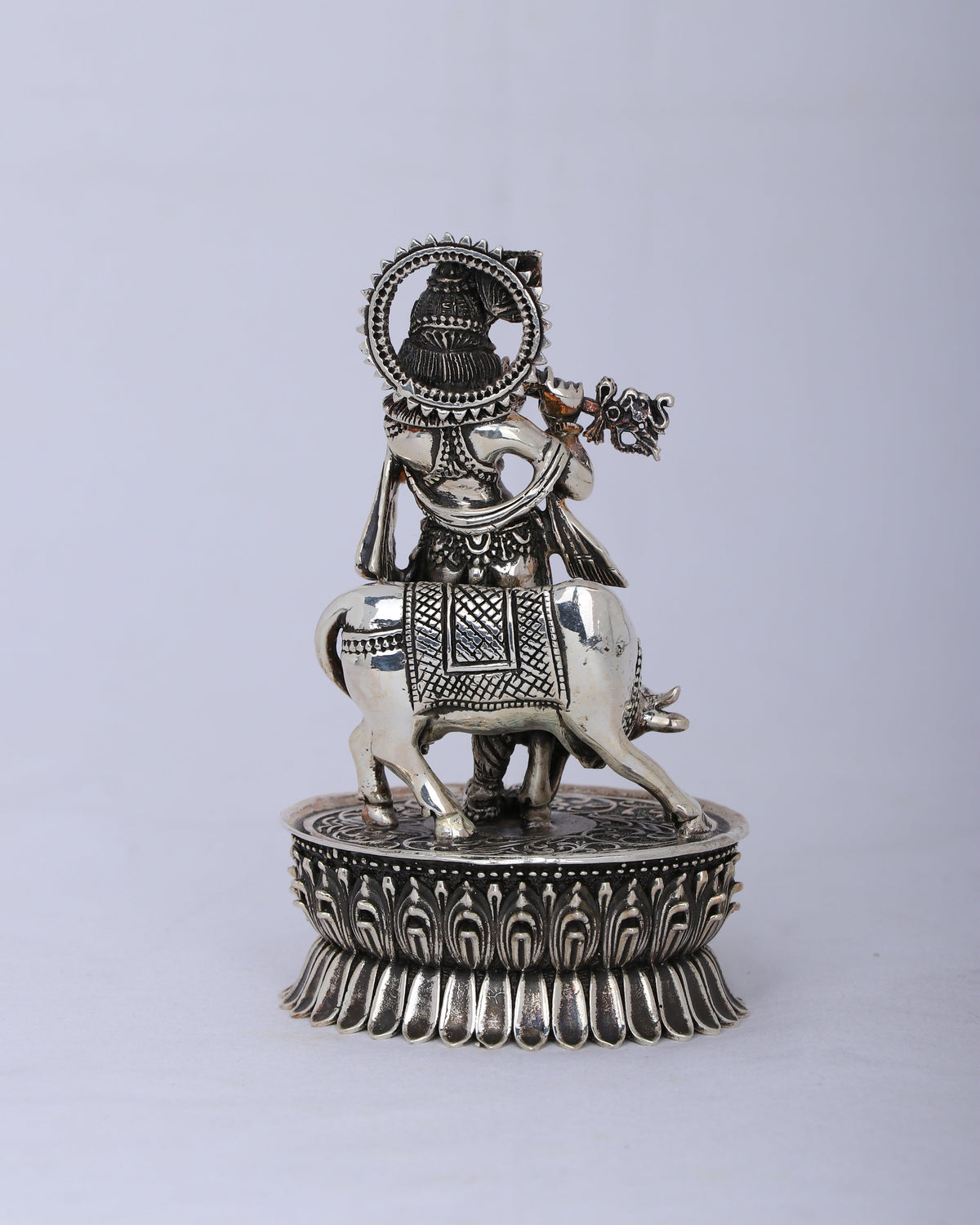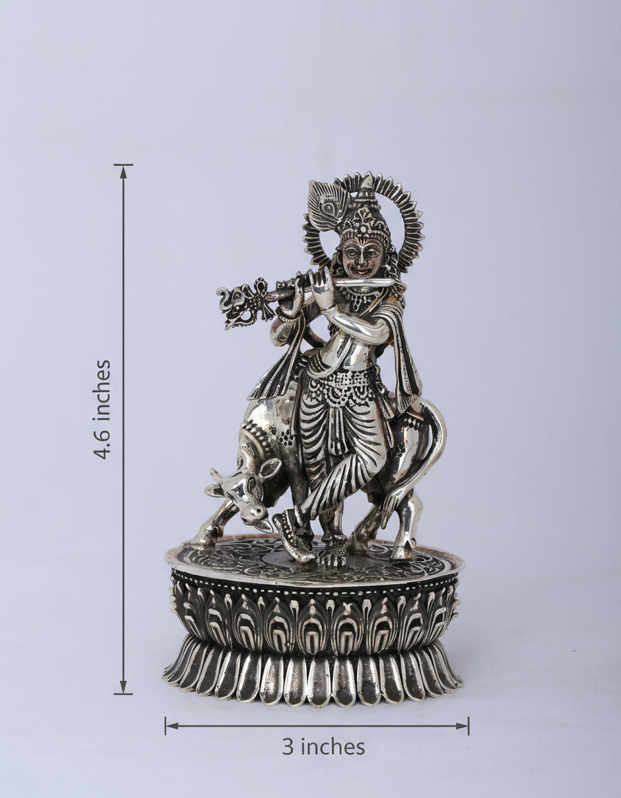 Pure 925 Silver Krishna with Cow Idol – 377g Flute Murti for Pooja