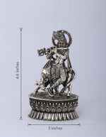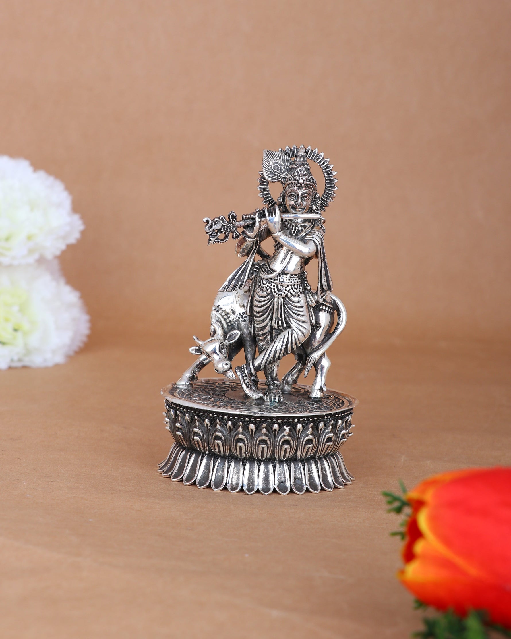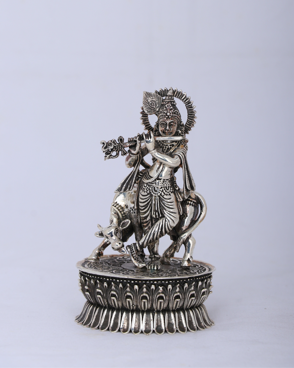 This exquisitely handcrafted Krishna idol, made from certified 925 pure silver, features Krishna joyfully playing his flute beside a sacred cow on a sturdy lotus base. Weighing 377 grams, its detailed design and dual finish give it a timeless elegance. Ideal for daily pooja, special ceremonies, or as a meaningful gift, this durable idol symbolizes divine grace and compassion, enhancing any devotional space with peaceful energy and spiritual significance.