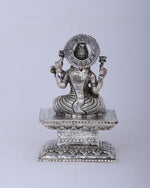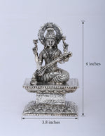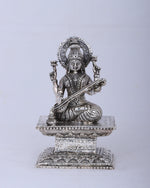This 623g pure 925 silver Saraswati idol captures the goddess of knowledge seated with her veena on a detailed lotus throne. Handcrafted with mirror-polished finish, it features traditional symbols like lotus flowers and prayer beads. Measuring 6" tall and 3.8" wide on a sturdy multi-tiered base, it is ideal for worship, festivals, and academic blessings. Durable and elegant, this statue is a meaningful gift for students, teachers, and artists seeking inspiration and wisdom.