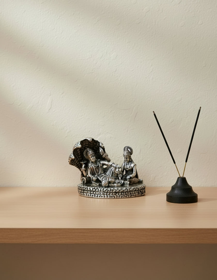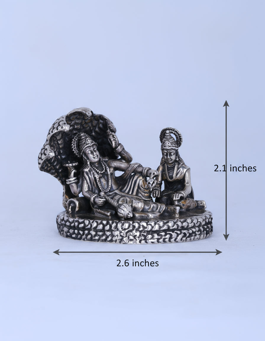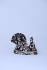 This 925 silver Vishnu Lakshmi statue, weighing 187 grams, beautifully captures Lord Vishnu reclining on Shesha Naga with Goddess Lakshmi by his side. Its antique finish highlights intricate details, making it a meaningful centerpiece for any home temple. Symbolizing peace and cosmic harmony, it suits daily worship and special occasions like Vaikuntha Ekadashi. Crafted from pure silver, it is both a spiritual treasure and a valuable keepsake, perfect as a thoughtful gift for weddings, housewarmings, or any Vaishnava devotee.