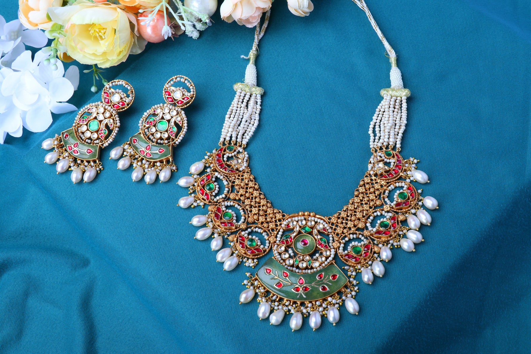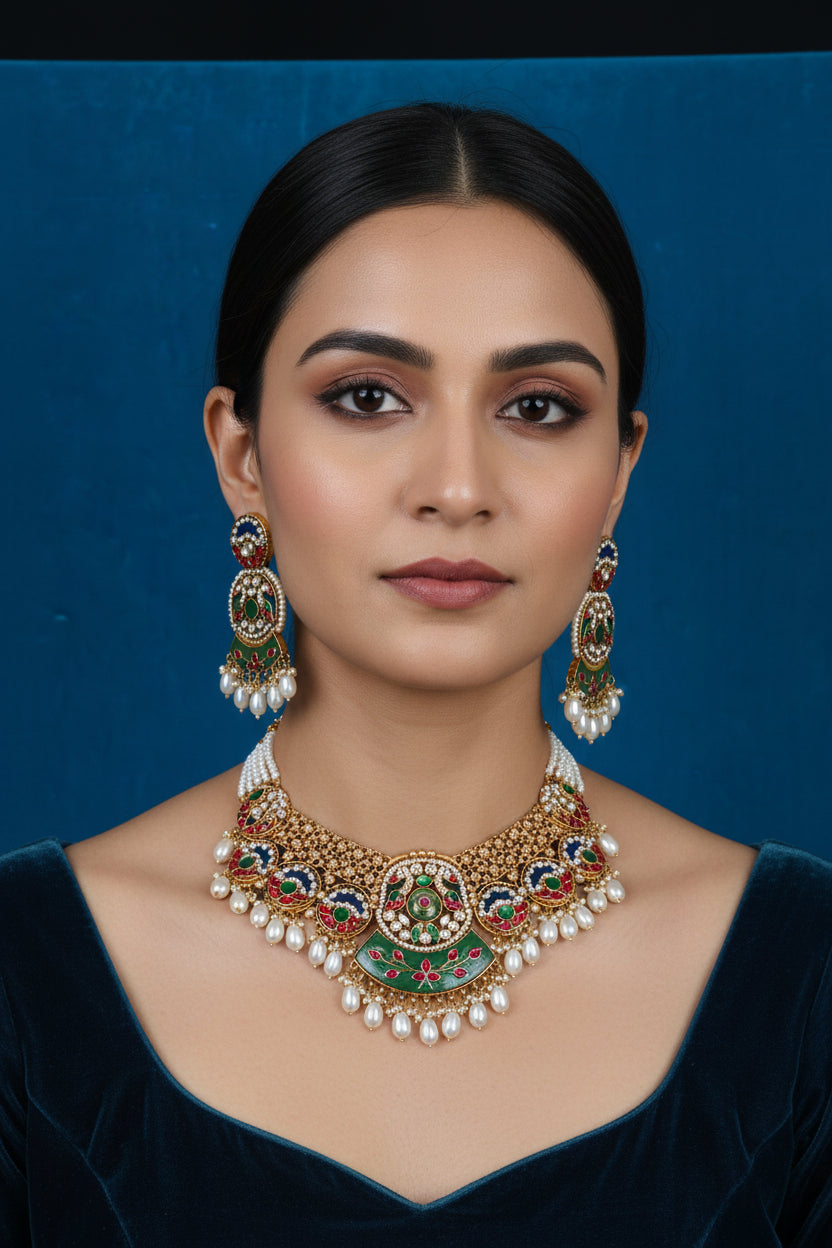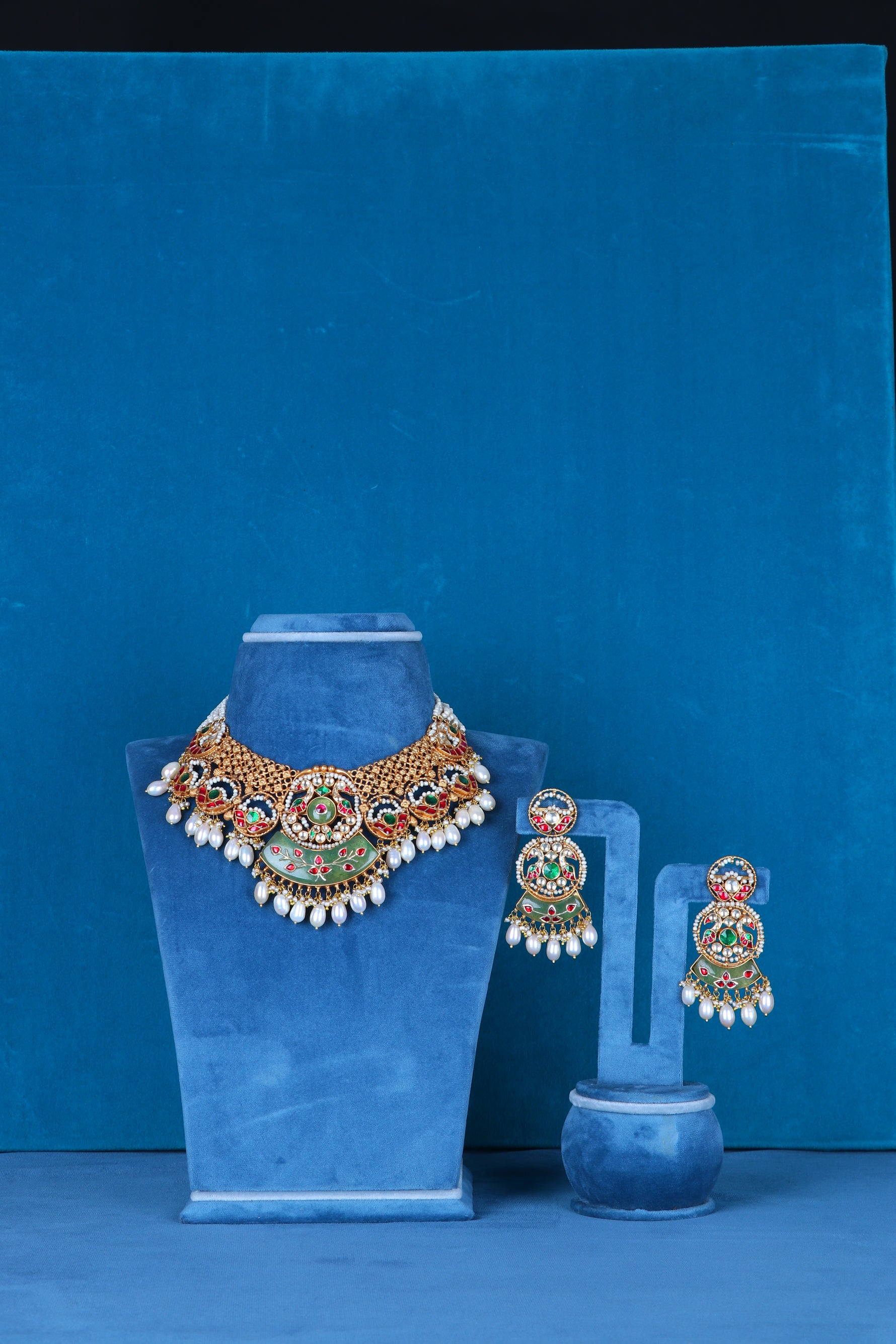 Design: Matching necklace and earring set featuring bold, smooth, structured geometric elements (fan or overlapping shapes)