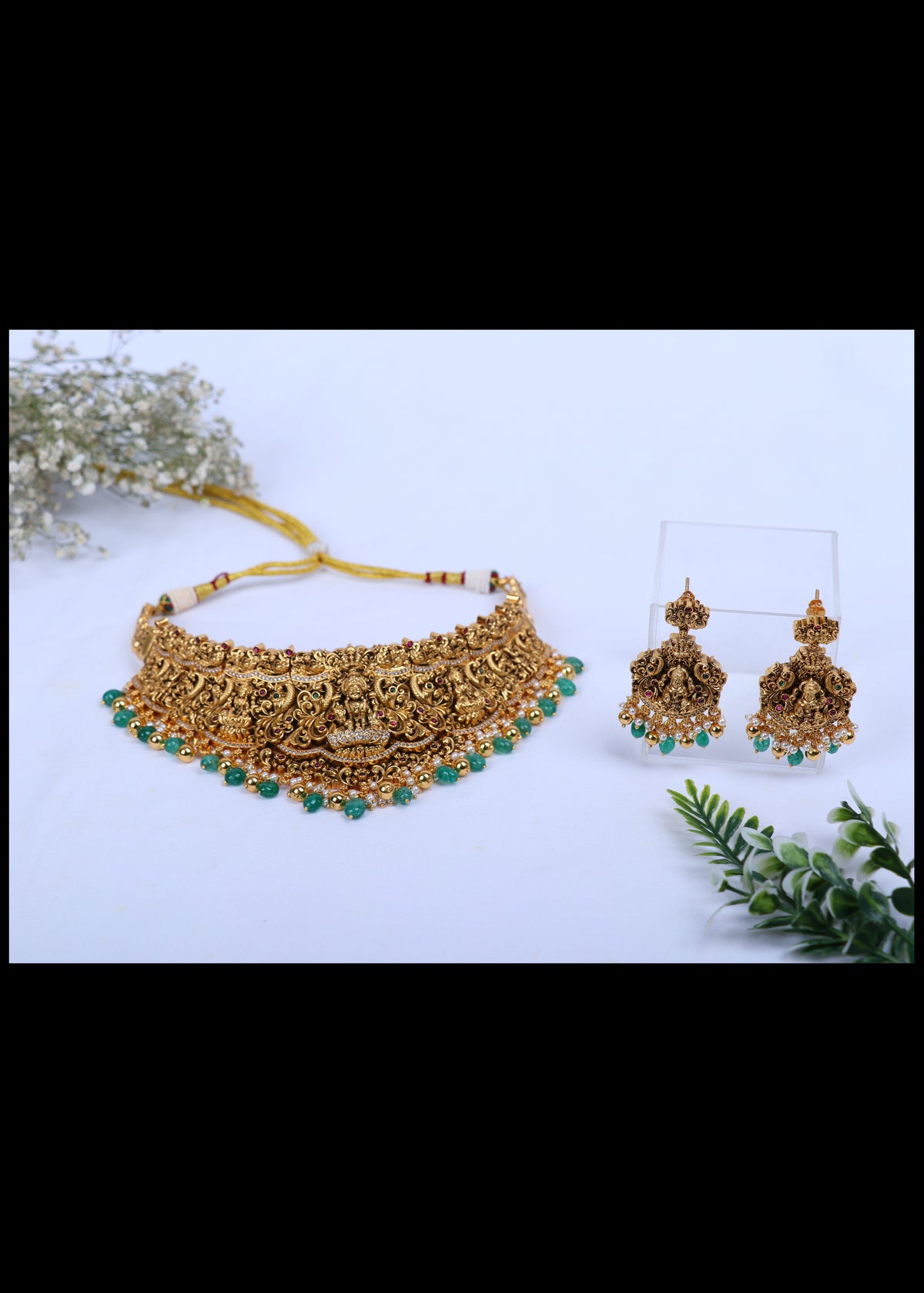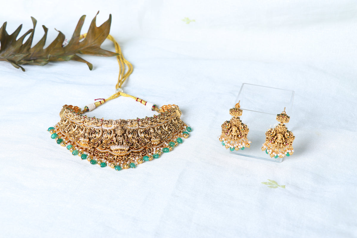 Design: Matching necklace and earring set featuring ornate, clustered traditional motifs