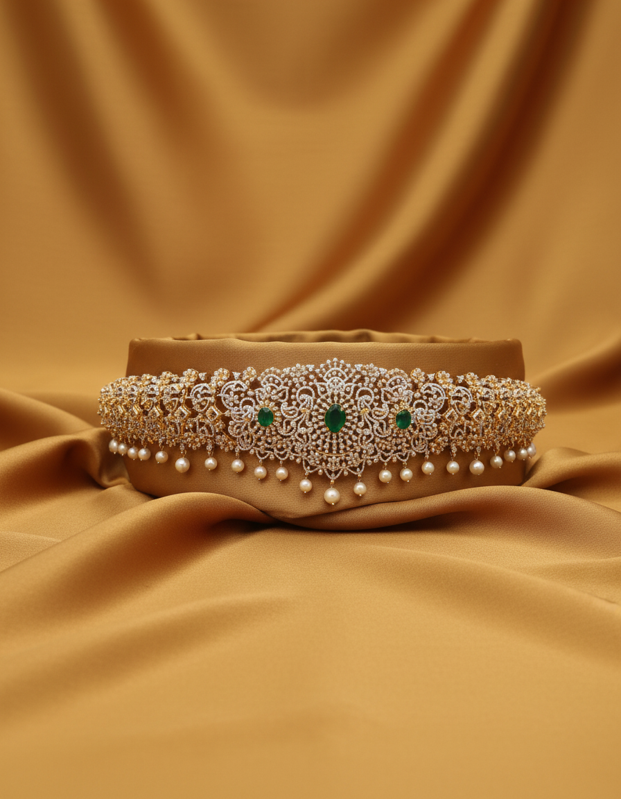 Gold-plated kamarbandh crafted from 925 pure silver with intricate filigree detailing and white cubic zirconia stones. Designed for traditional Indian occasions—weddings, festivals, and ceremonial wear—this waist belt combines comfort with heirloom-quality craftsmanship. The solid silver base ensures durability and balanced weight distribution, while the lustrous gold finish delivers timeless elegance. An ideal gift for significant milestones, this piece transcends jewelry to become a treasured family heirloom.