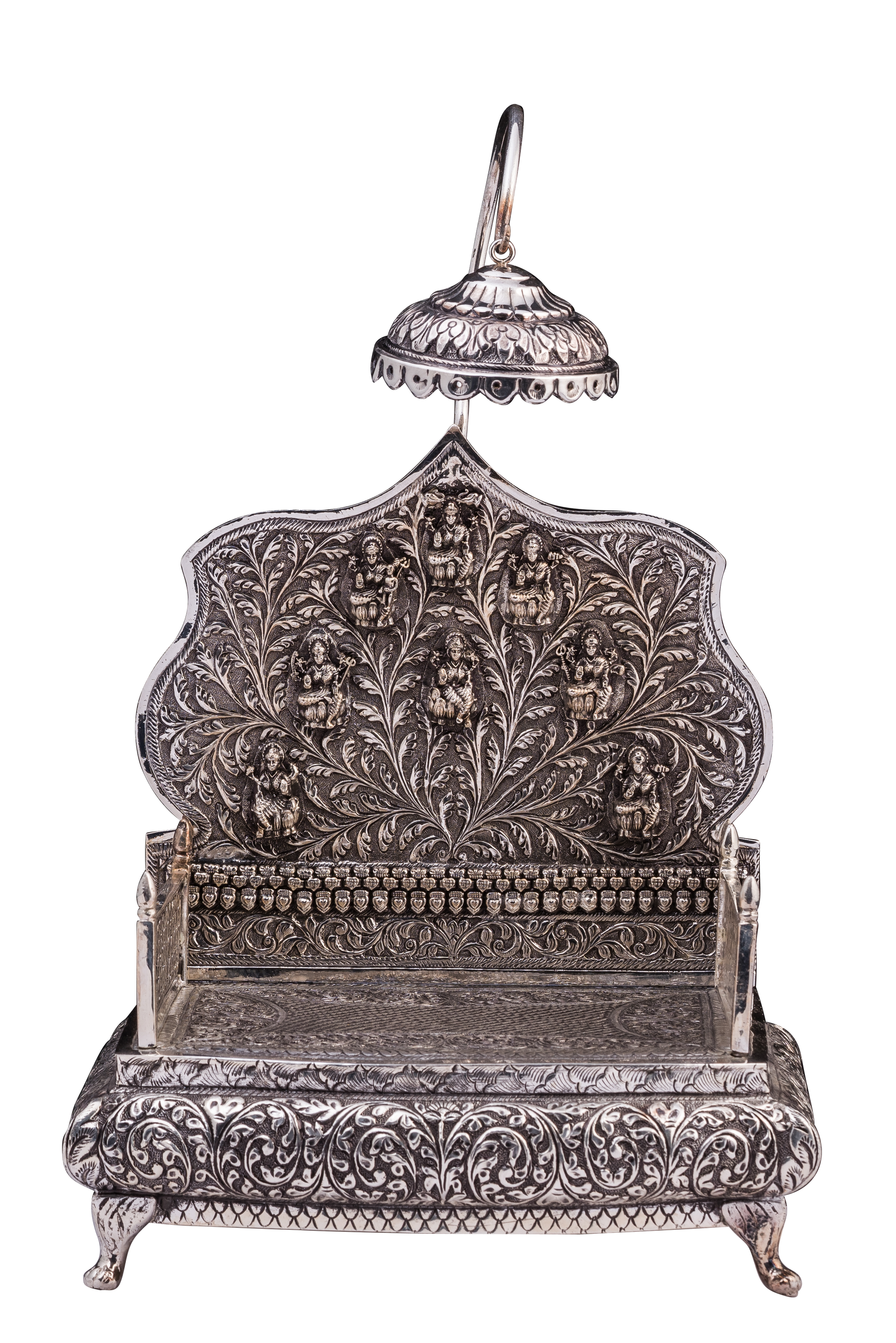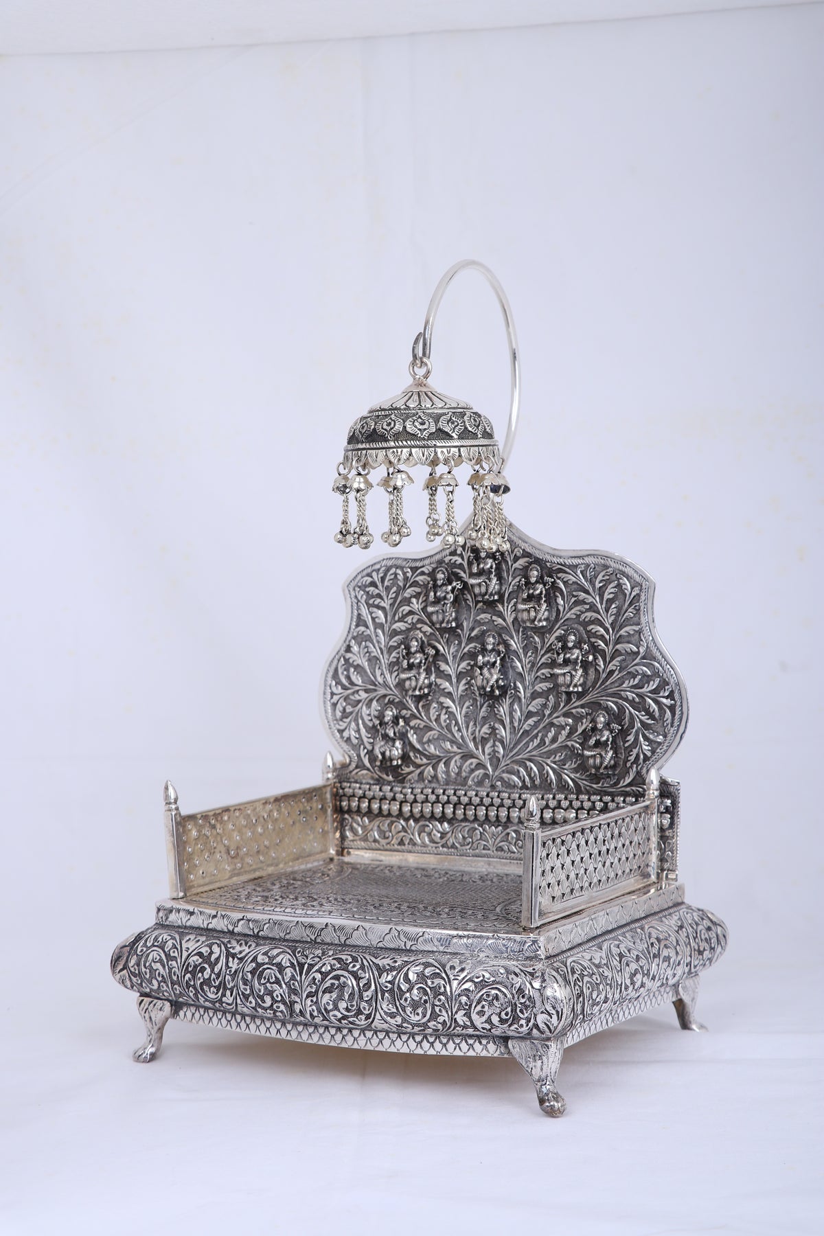 | Design | Ornate Singhasan with high carved backrest, removable umbrella, and intricate deity/floral carvings |
