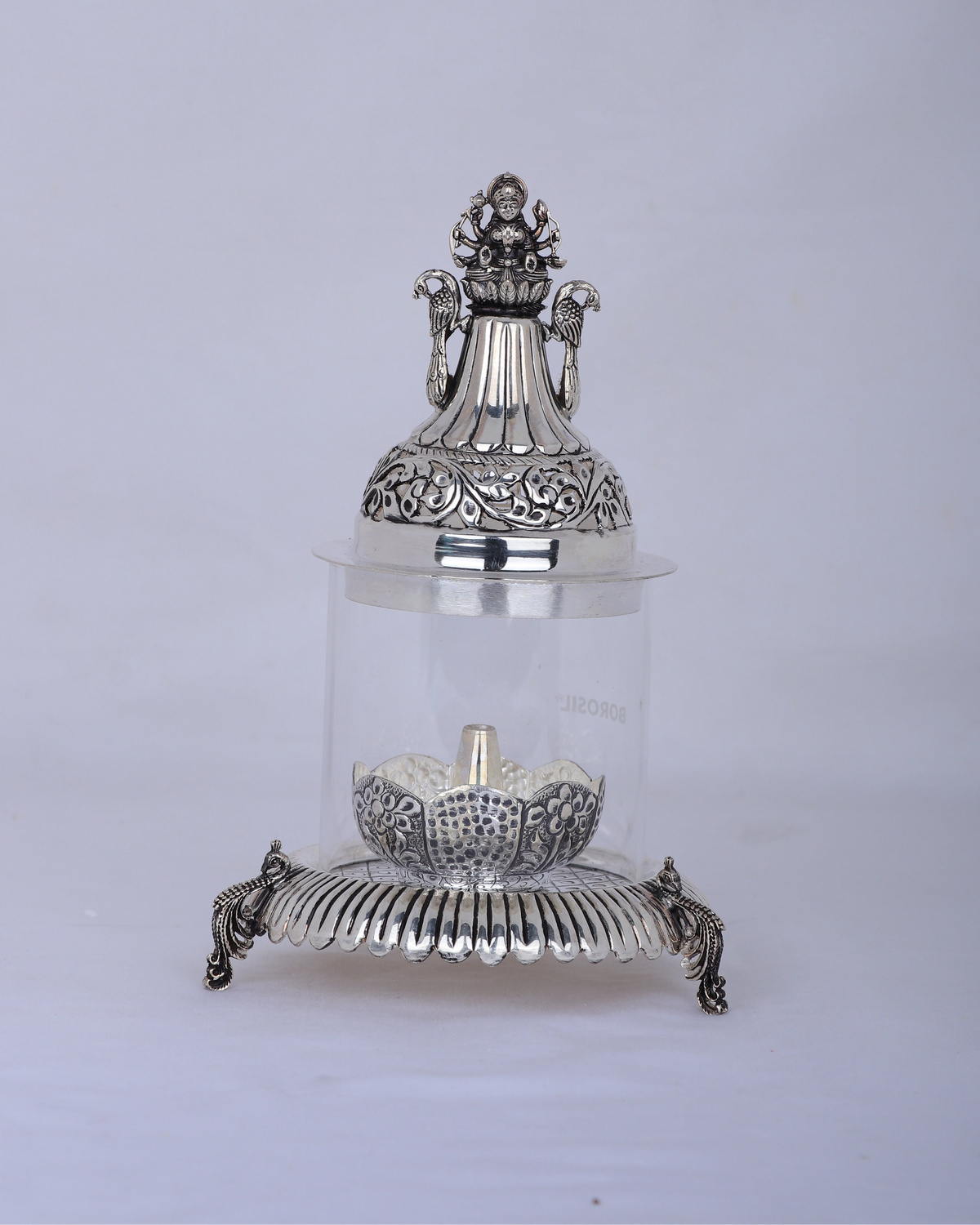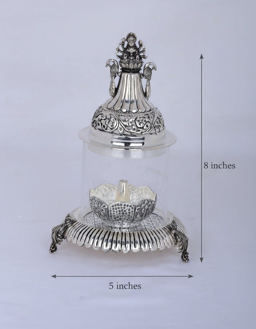 Craftsmanship: Features an intricately sculpted Lakshmi figurine atop a nakashi-engraved domed lid with peacock handles, durable glass cover for continuous flame protection, ornate lotus-shaped interior diya dish, and a radiant petal-edged base standing on four peacock-claw feet. All silverwork finished in a mirror polish with selective oxidization for depth and antique character.