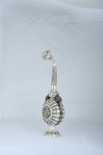 This exquisite Gulab Dani is handcrafted from certified 925 pure silver, featuring hand-chased paisley and floral motifs on its bulbous base. A sculpted peacock head spout adds grace and cultural significance. The mirror-polish finish highlights skilled tradition.