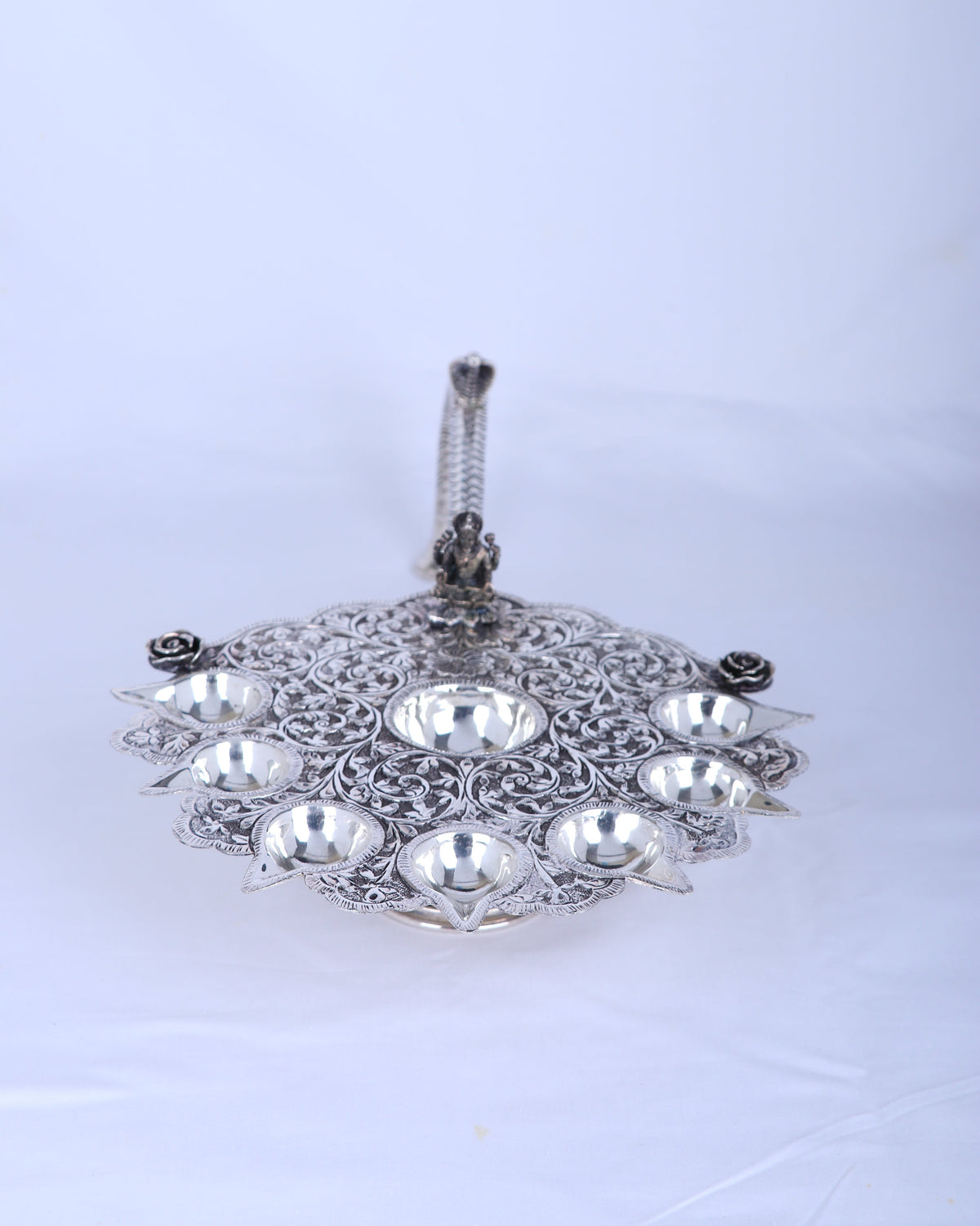 Design Elements: Twelve individual oil wells arranged in ornate lotus formation, sculptural deity figure centerpiece, elaborate twisted rope-design handle, decorative base with traditional motifs