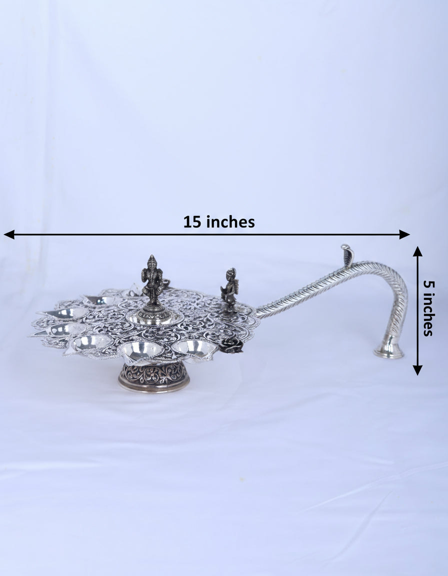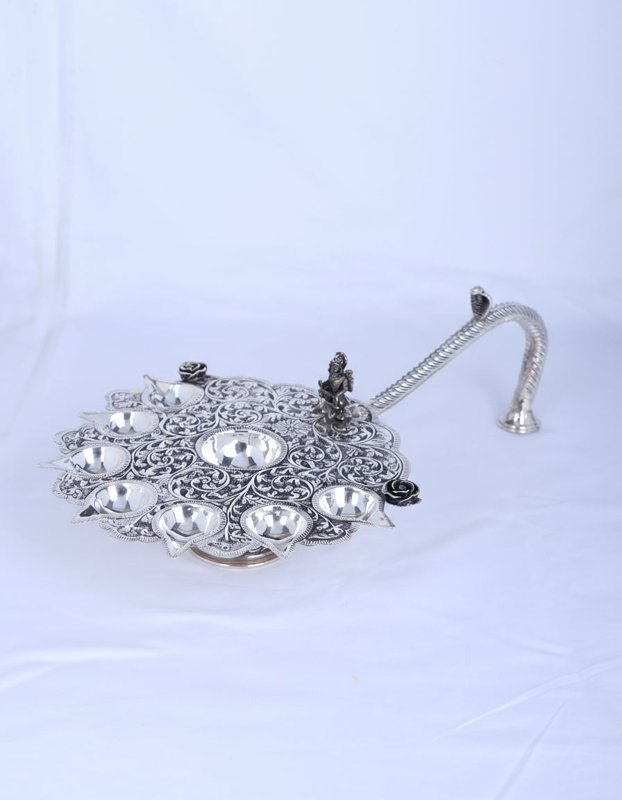 Type: Grand Multi-Wick Silver Ceremonial Aarti Lamp with Deity Figurine