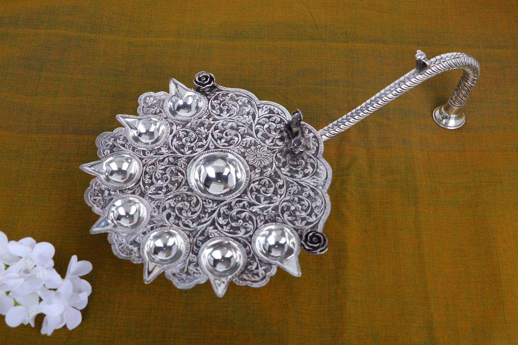 Finish: Mirror-polished silver plating with deeply engraved sacred geometry, floral patterns, and traditional iconography