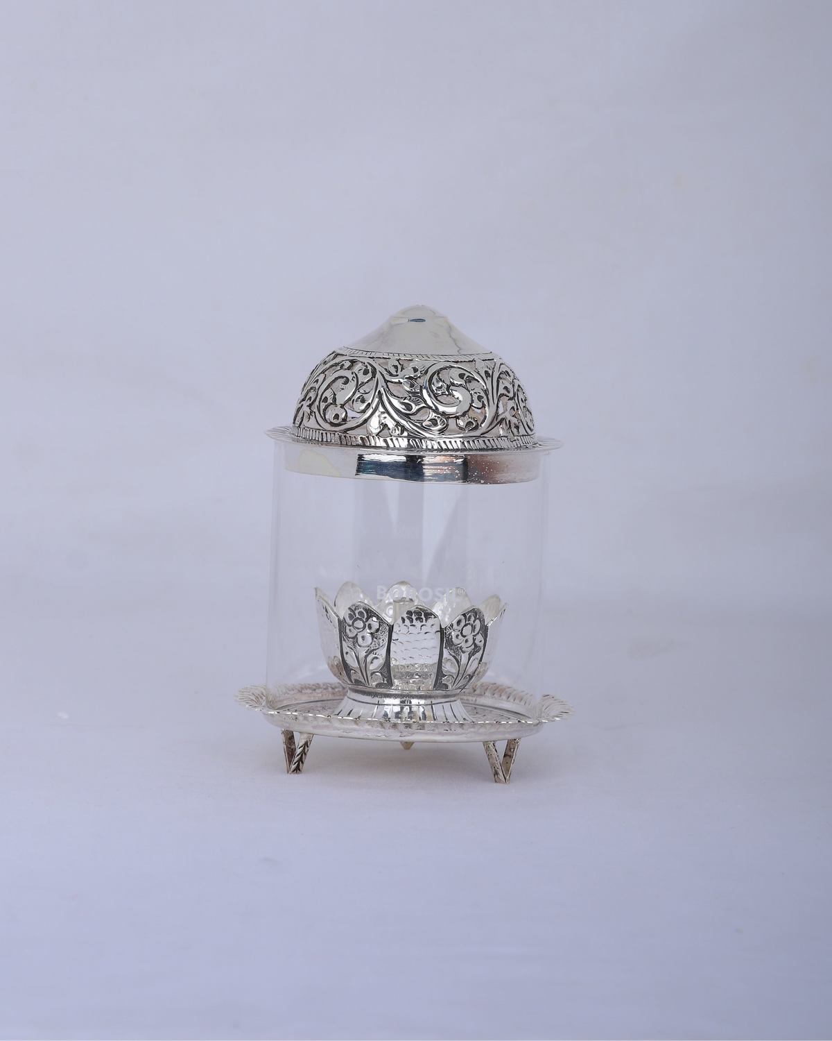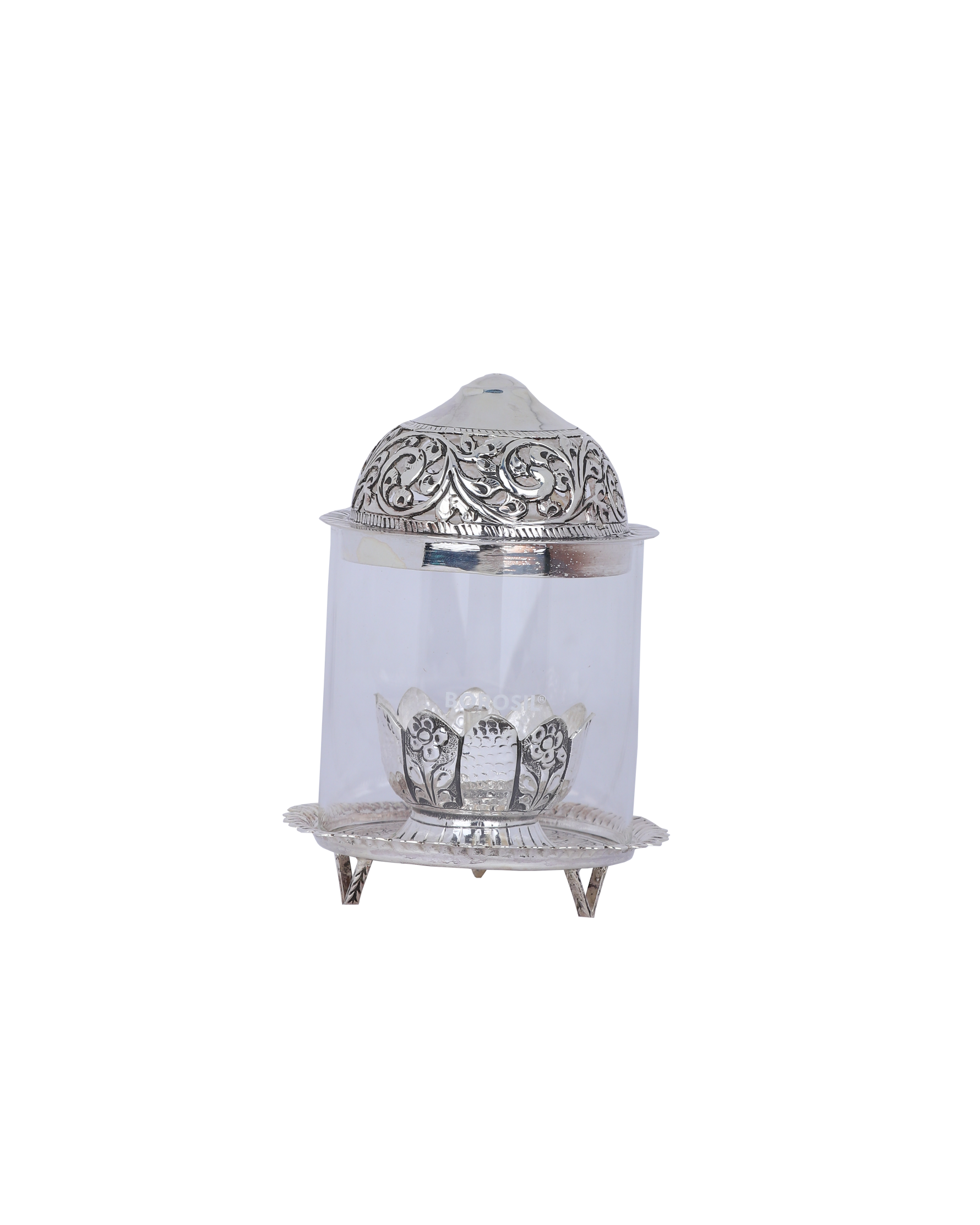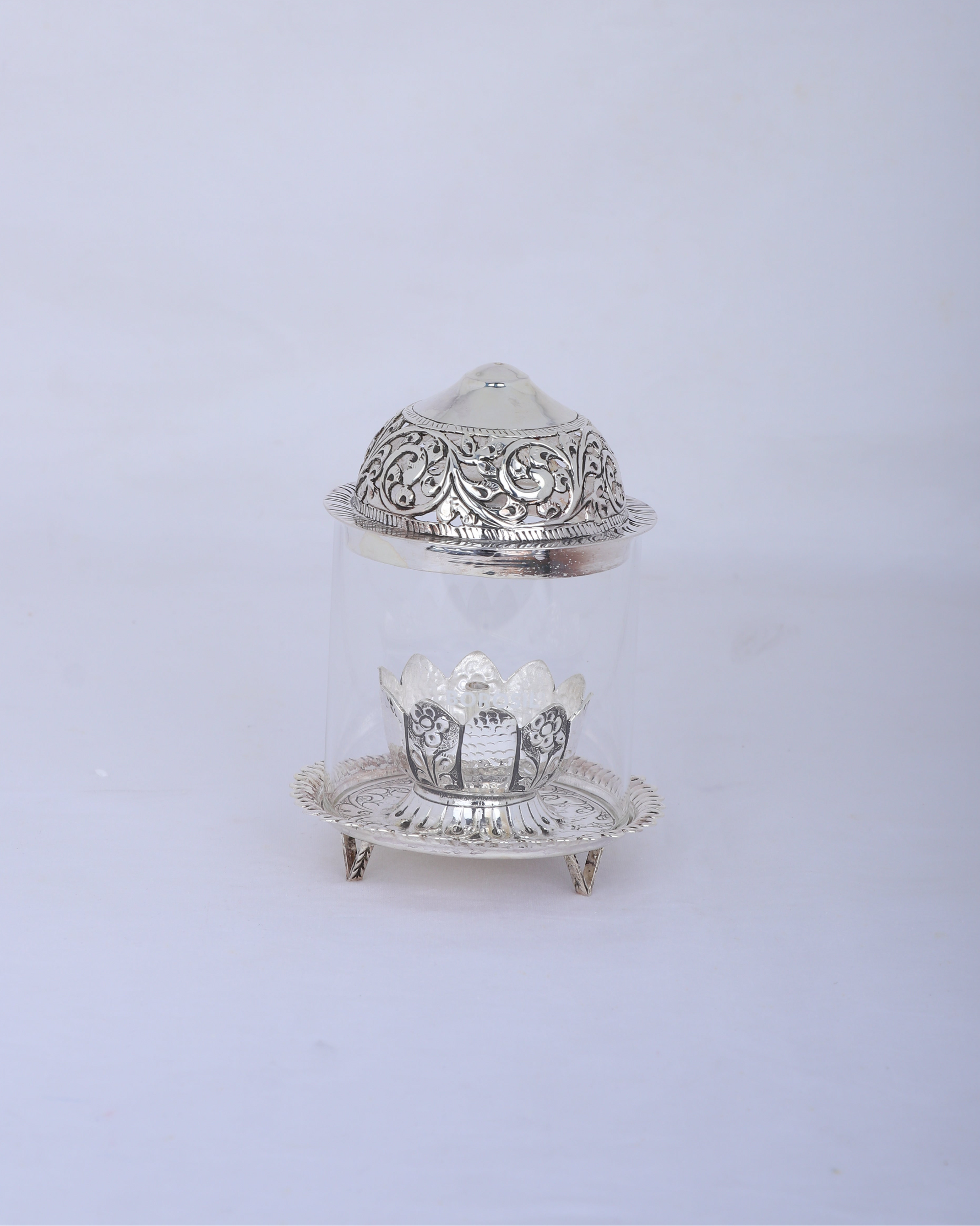 Material: Premium 92.5% silver with intricate antique finish; fitted with heat-resistant glass chimney for safe, uninterrupted burning (Total Weight: 212 grams; Set of 3 pieces)