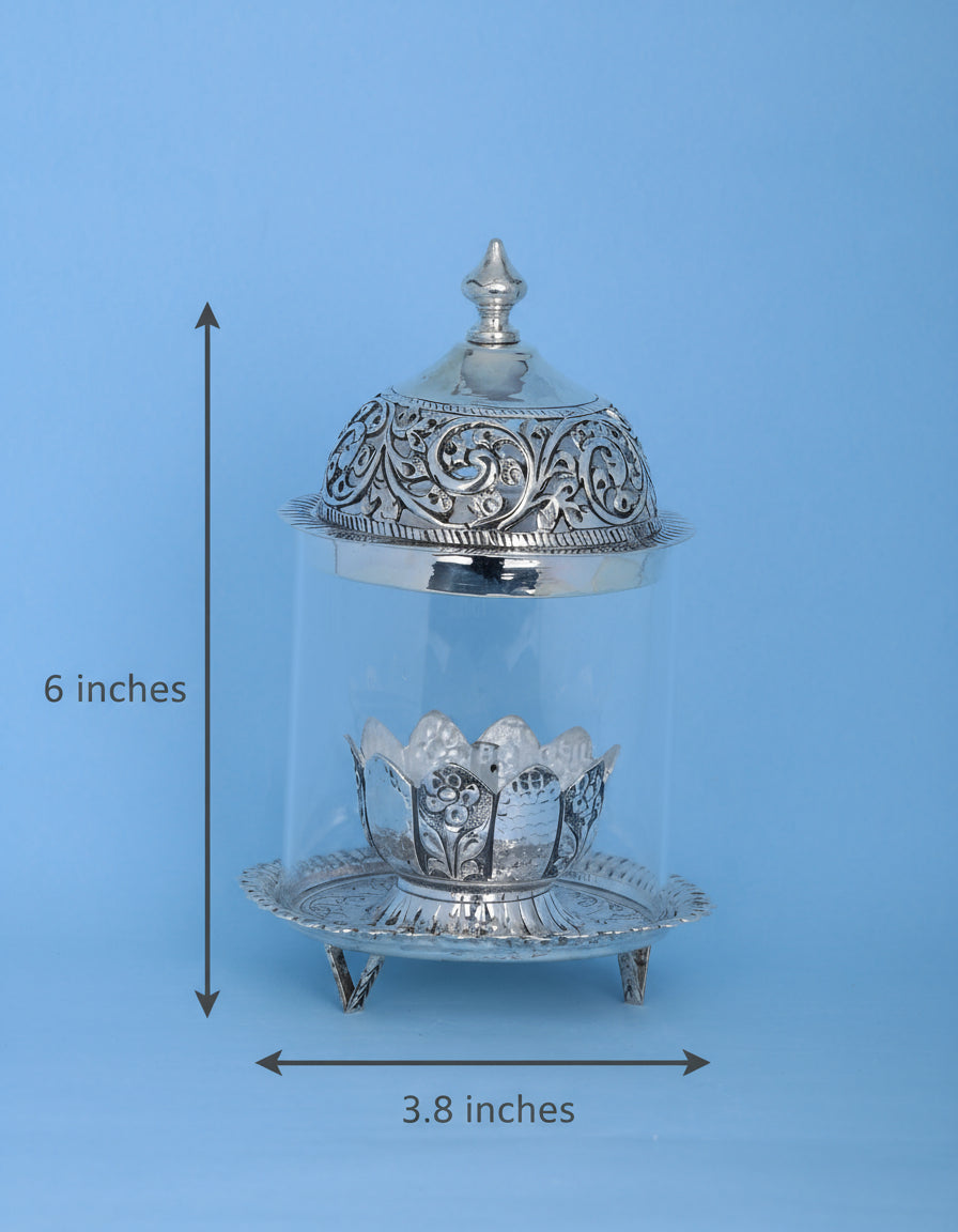 Embellishments: Antique nakashi engraving, scalloped plate with beaded detailing, clear glass chimney for flame protection, all-over metal scrollwork, no stones or meenakari—sheer luxury is crafted in silverwork.