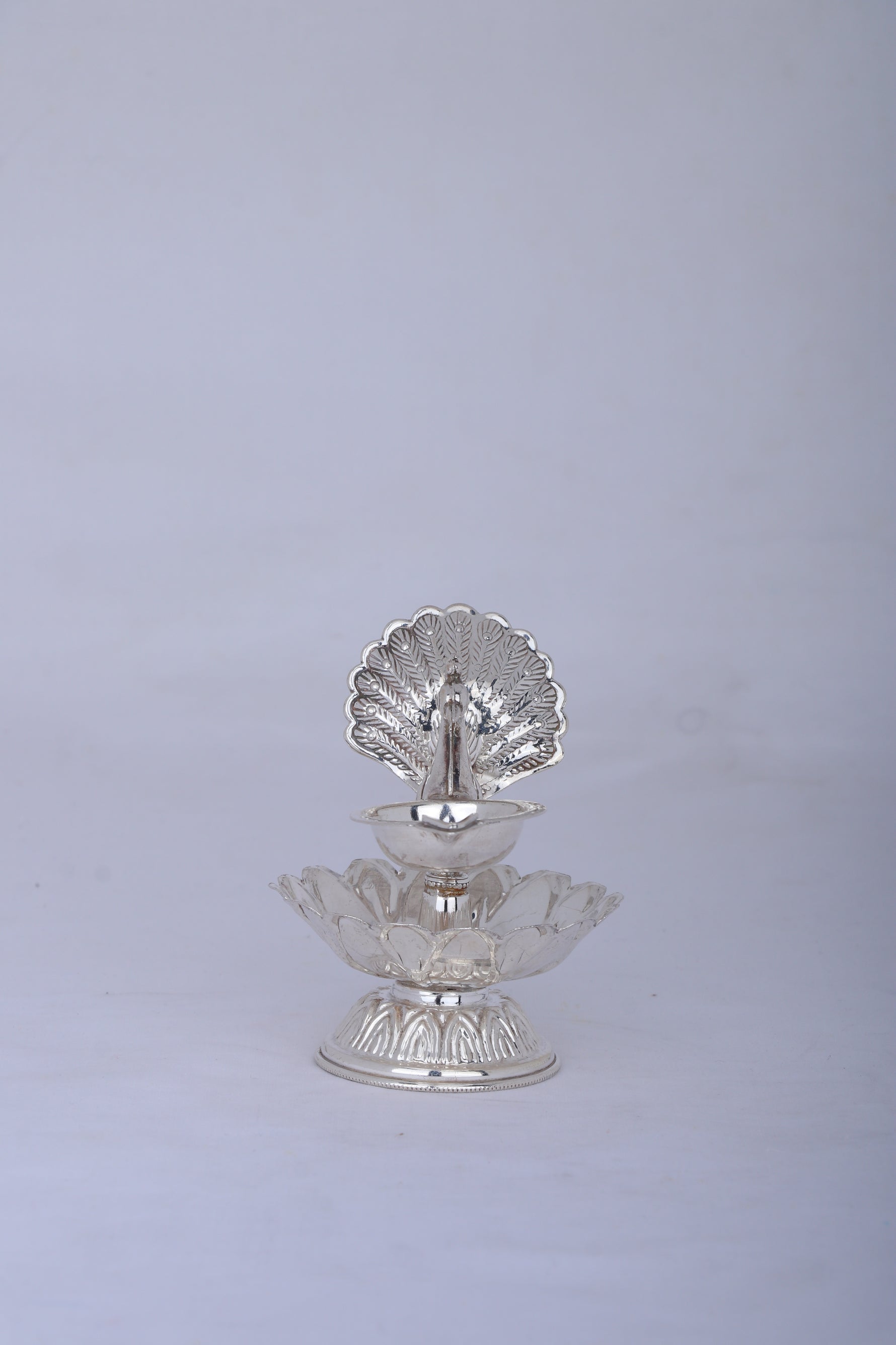 This elegant Deepam, crafted from pure 925 silver, features a beautifully detailed peacock handle and traditional floral engravings. Weighing 123 grams and measuring 3.2" in height, it combines artistry with function, perfect for daily aarti, Diwali, and special rituals. Its wide oil bowl provides steady light, while the polished finish adds a radiant touch to any spiritual setting. Symbolizing beauty and prosperity, this peacock Deepam is a refined gift for those who value meaningful craftsmanship and sacred tradition.