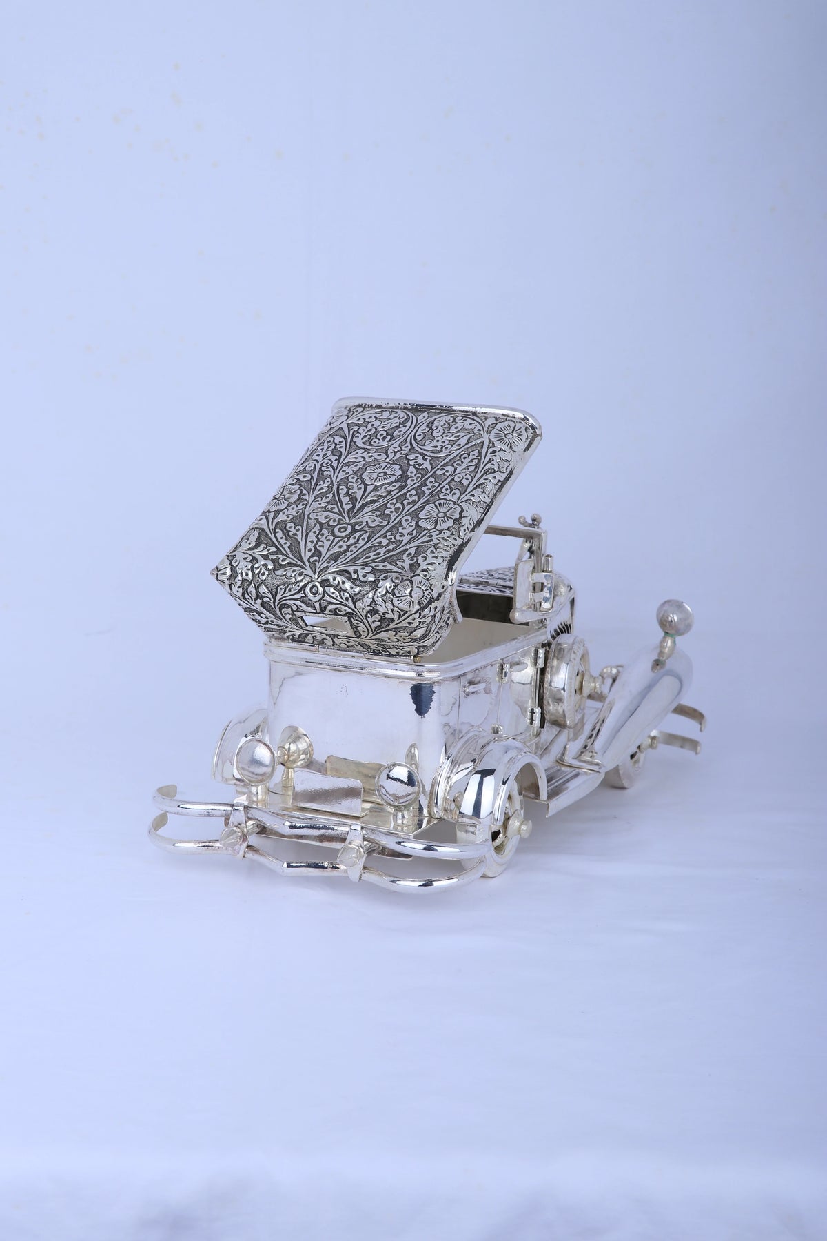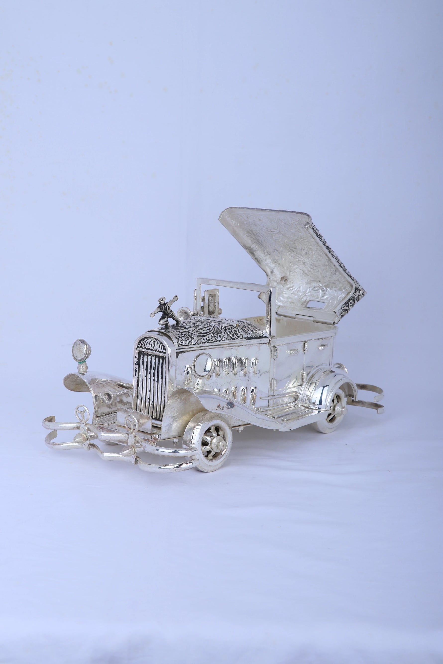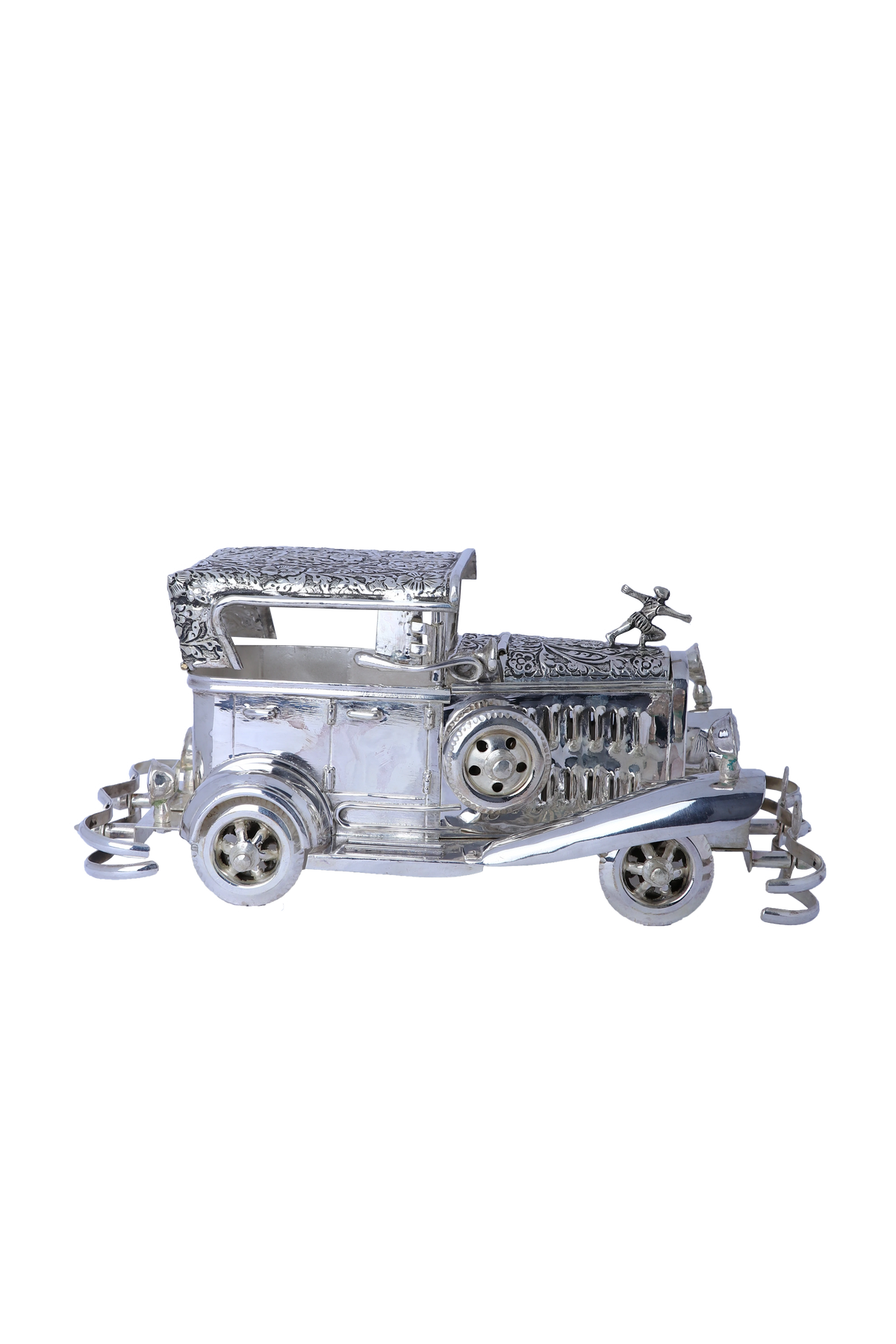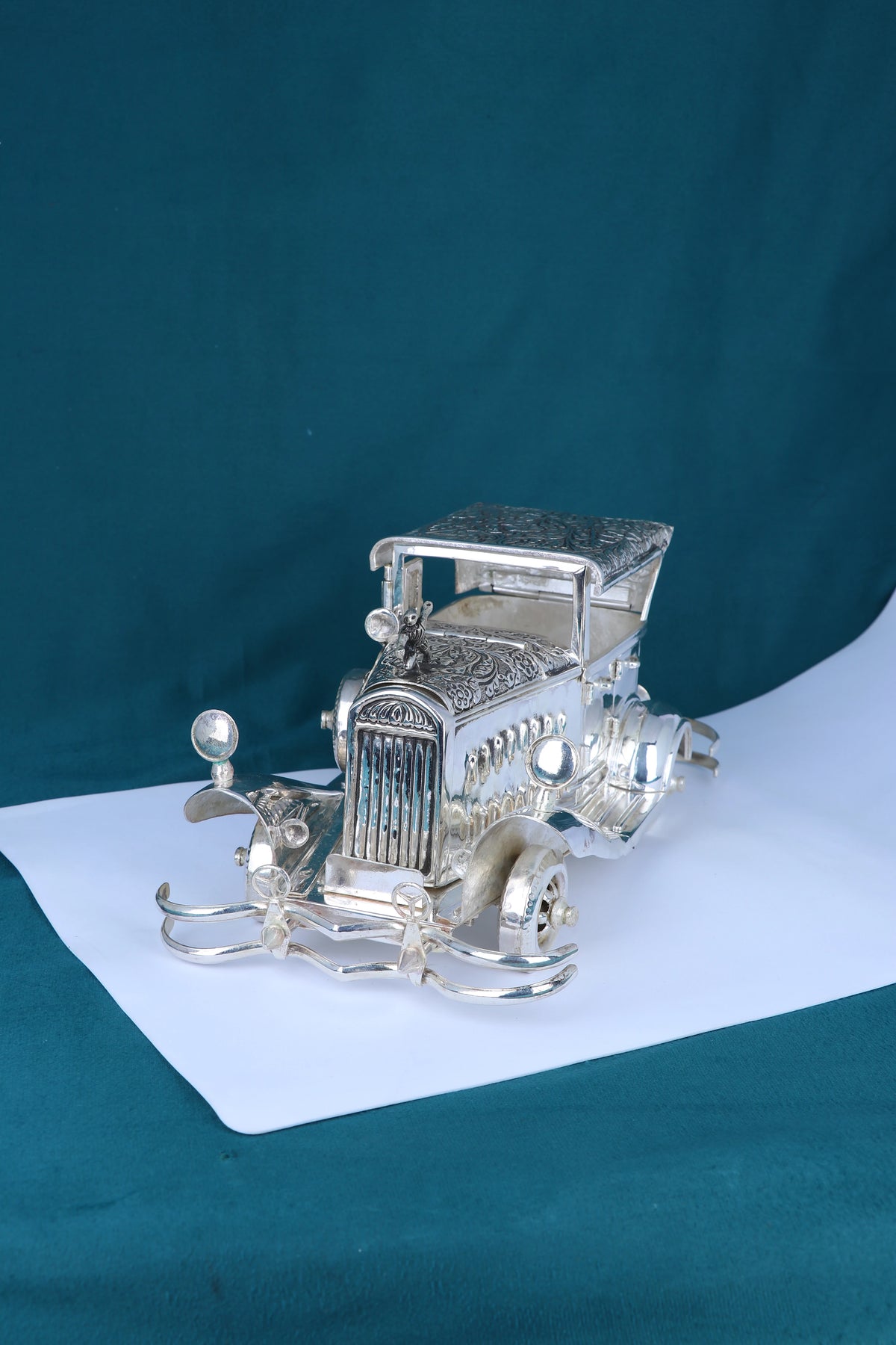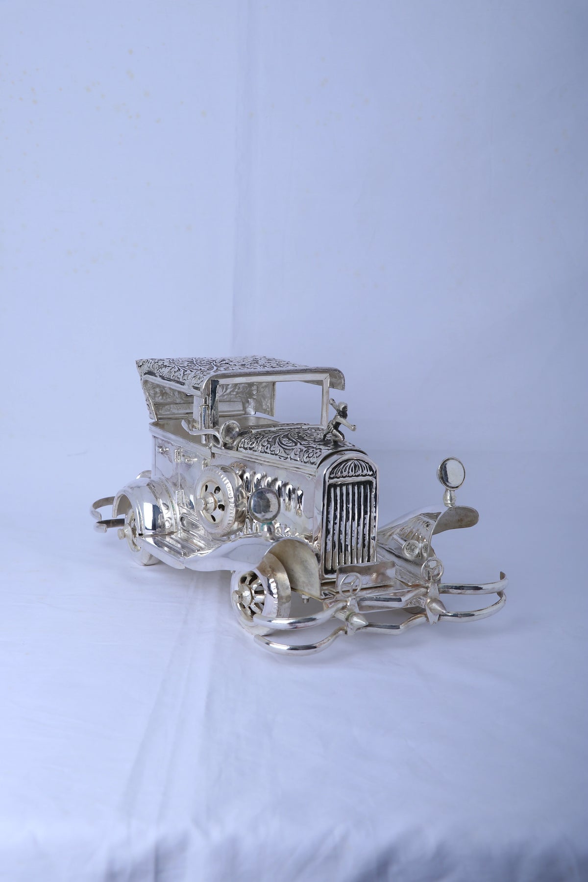 This impressive vintage Rolls Royce model weighs nearly 2 kg and is crafted from 925 pure silver with a mirror-polished finish. Detailed with hand-chased artistry, it makes a striking centerpiece for any office or living space. Symbolizing luxury, success, and progress, it serves as an elegant heirloom or a meaningful gift for major milestones. Its solid silver build ensures lasting beauty and value.