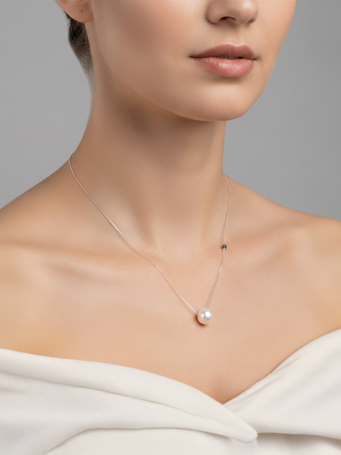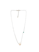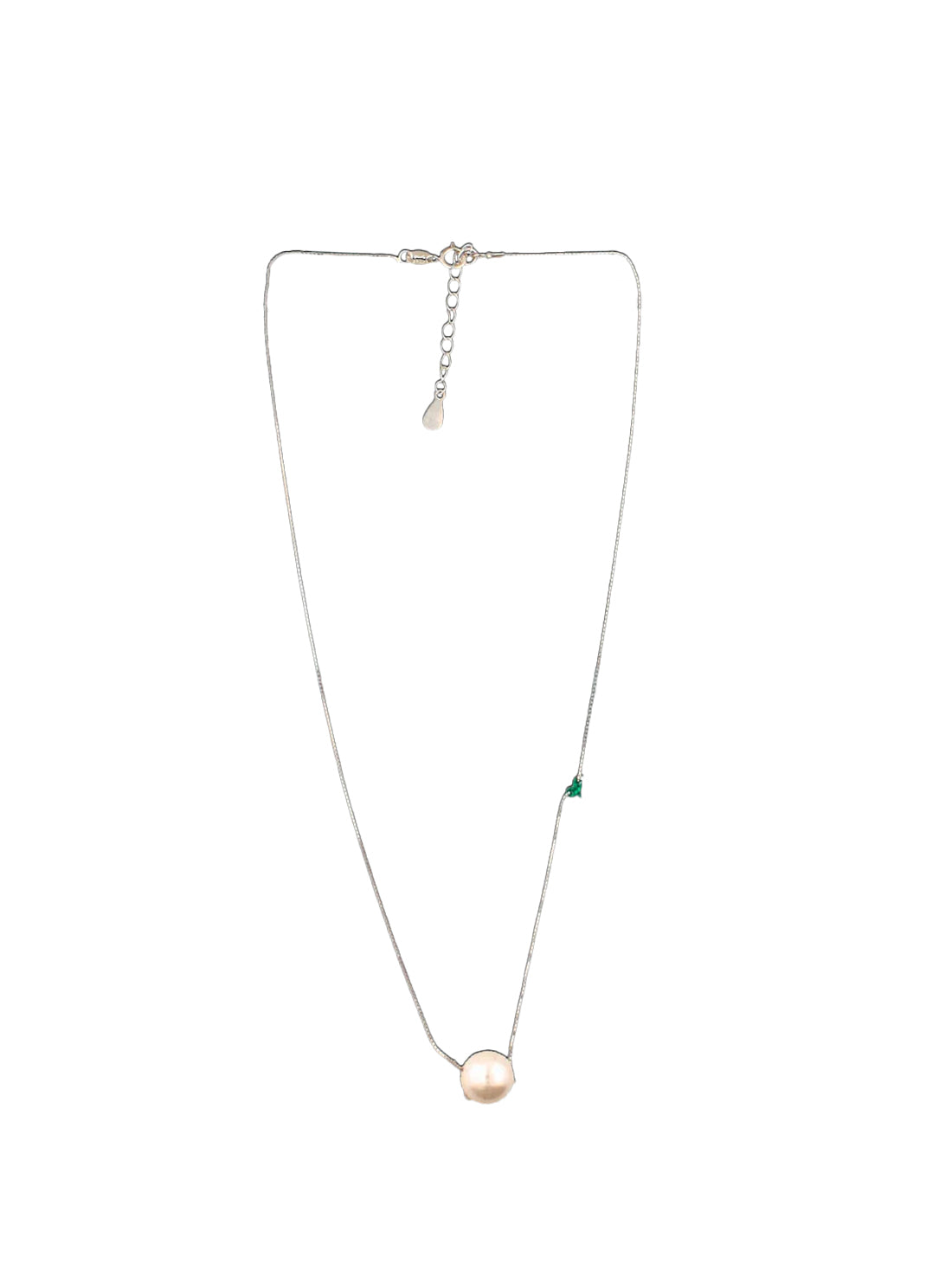 Design Features: Single pearl drop pendant, green stone accent, adjustable chain length, branded clasp
