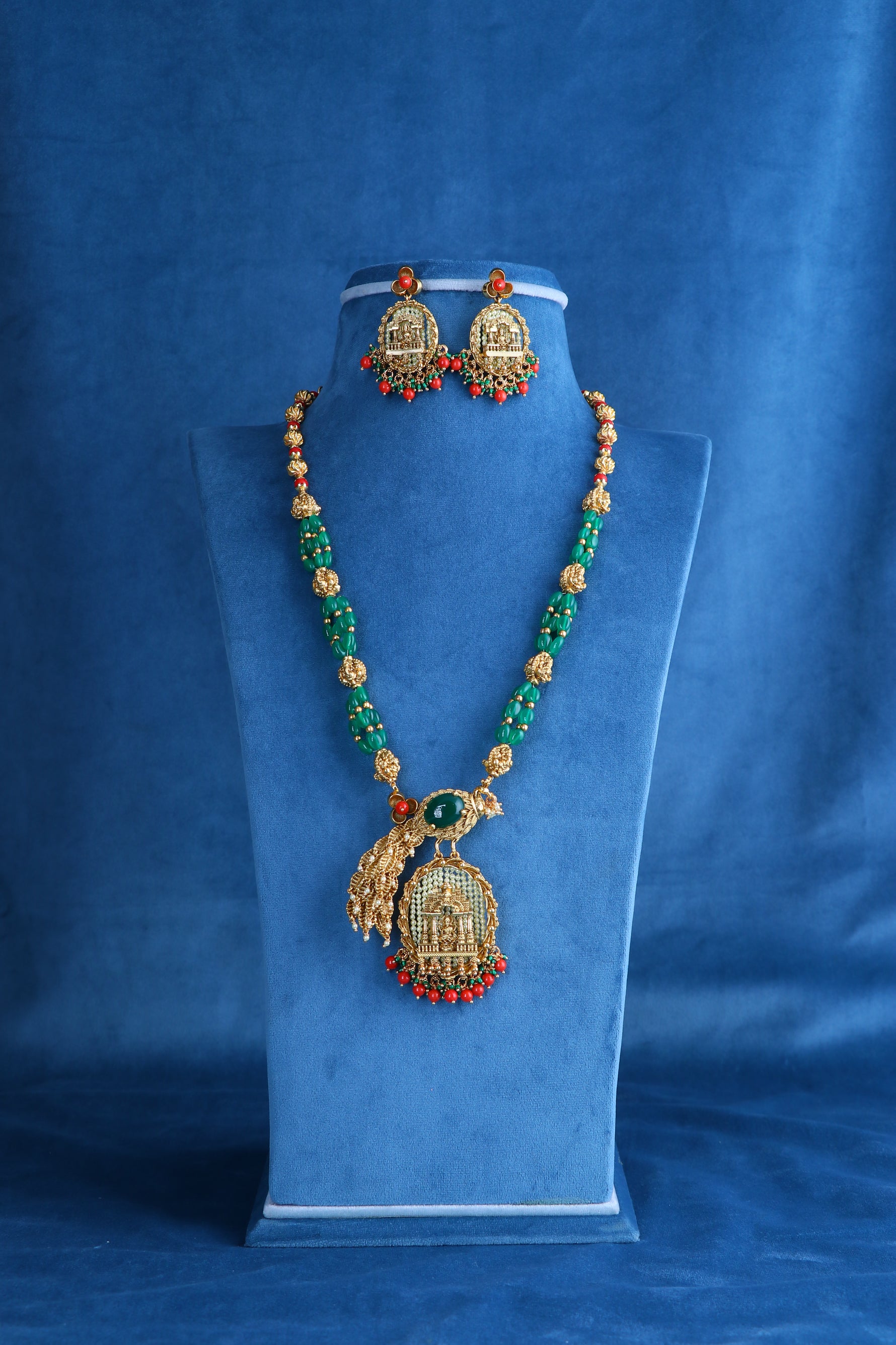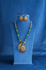 Design: Matching necklace and earring set featuring small, smooth, clustered geometric elements