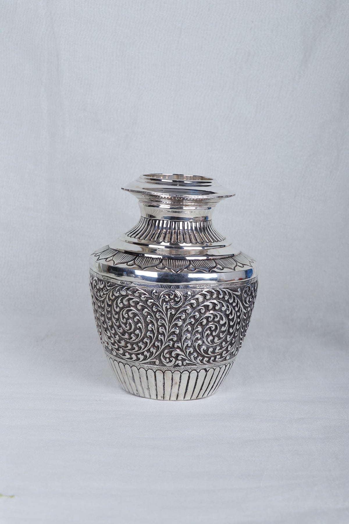 Craftsmanship: Hand-engraved Nakashi-style spiral floral motifs with deep-relief detailing across the body, vertical flutes at the base, and ornate engraving around the neck and rim