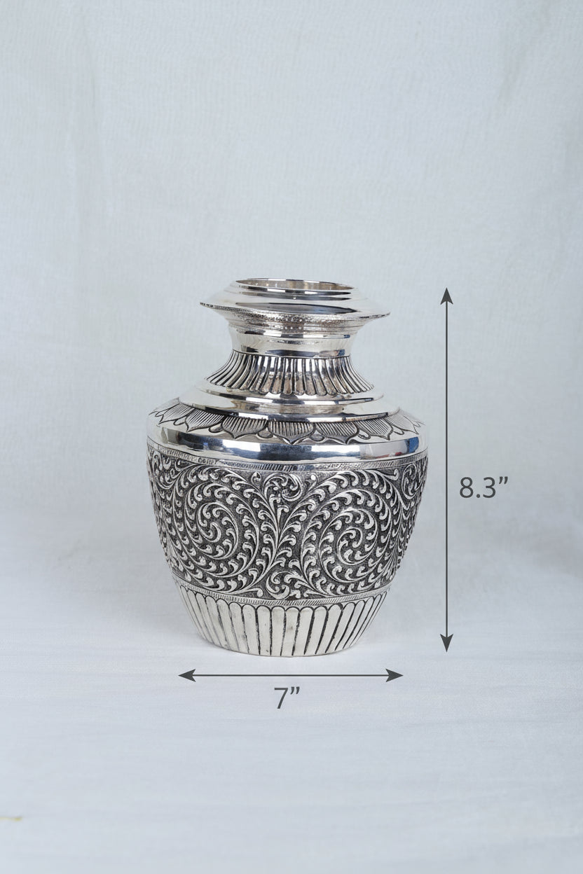 Drawing inspiration from traditional Rajasthani and South Indian temple silverware, this lota features classic Nakashi hand-chasing. Swirling florals symbolize abundance, purity, and prosperity—making such vessels integral to Vedic rituals, wedding kalash sthapana, Diwali ceremonies, and housewarming blessings. This design pays tribute to generations of artisans who elevated spiritual vessels into works of art, treasured in both home temples and palace collections.