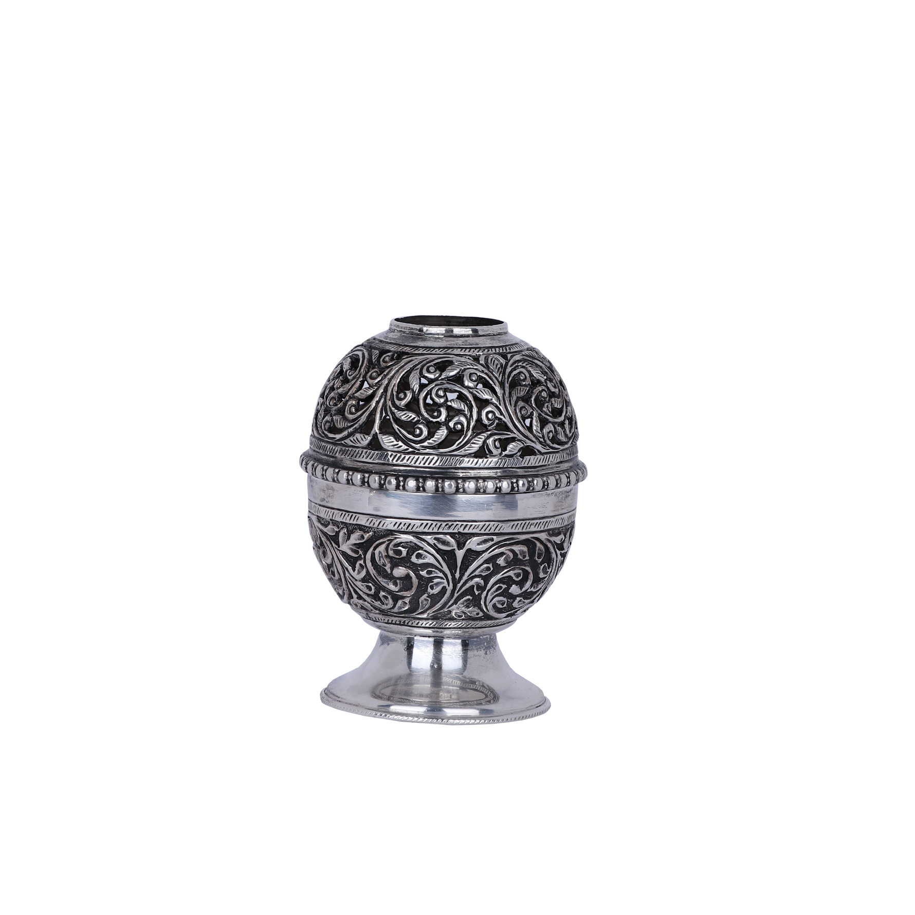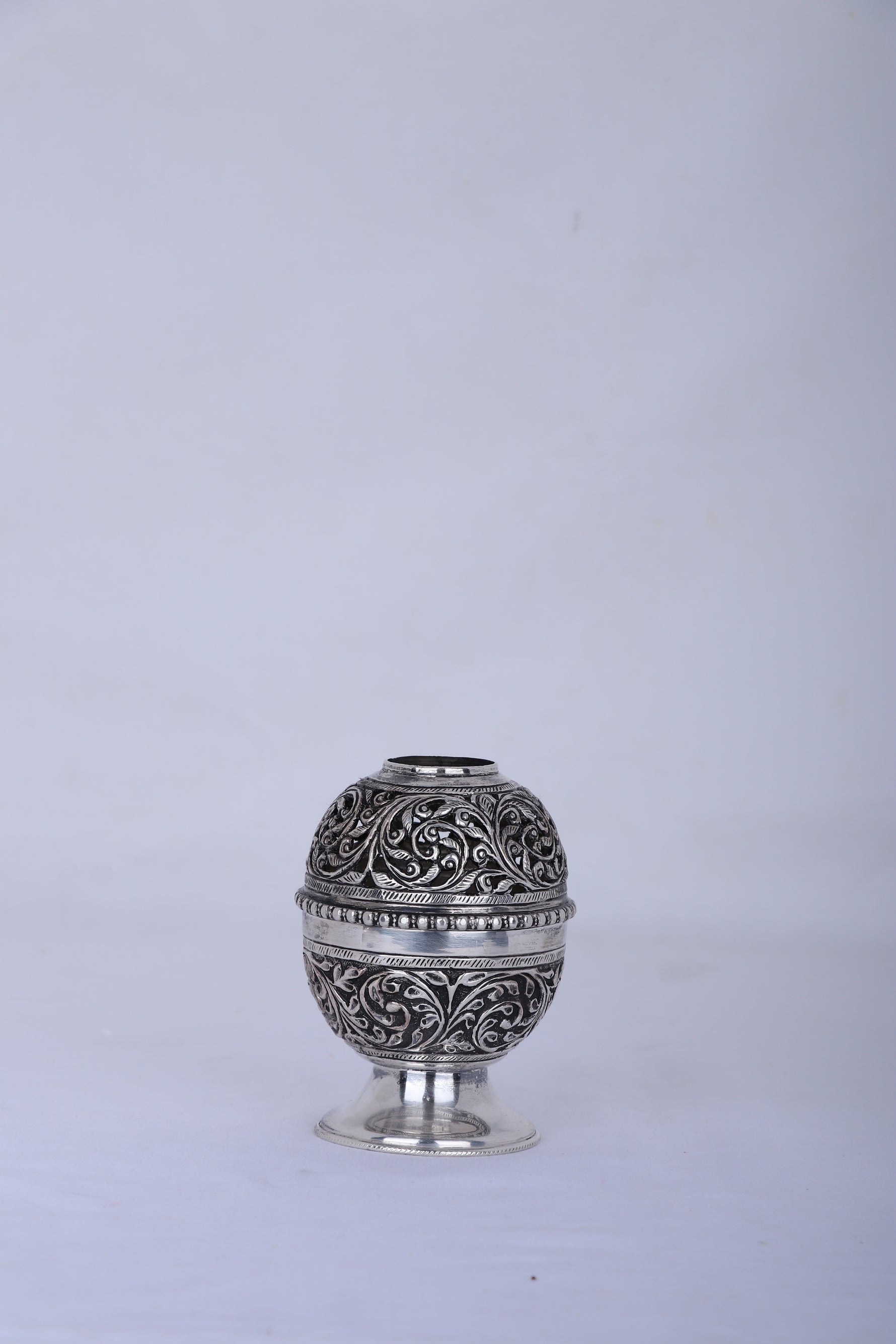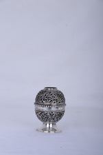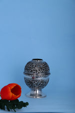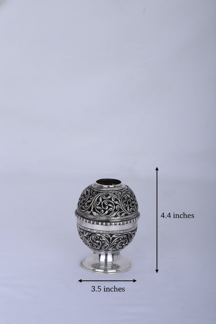 Craftsmanship: Expertly handcrafted with spherical body and deep-relief nakashi floral and vine motifs throughout, finished with a glossy antique silver polish. The diya features an integrated pedestal base for optimal stability and ease of use during uninterrupted burning.