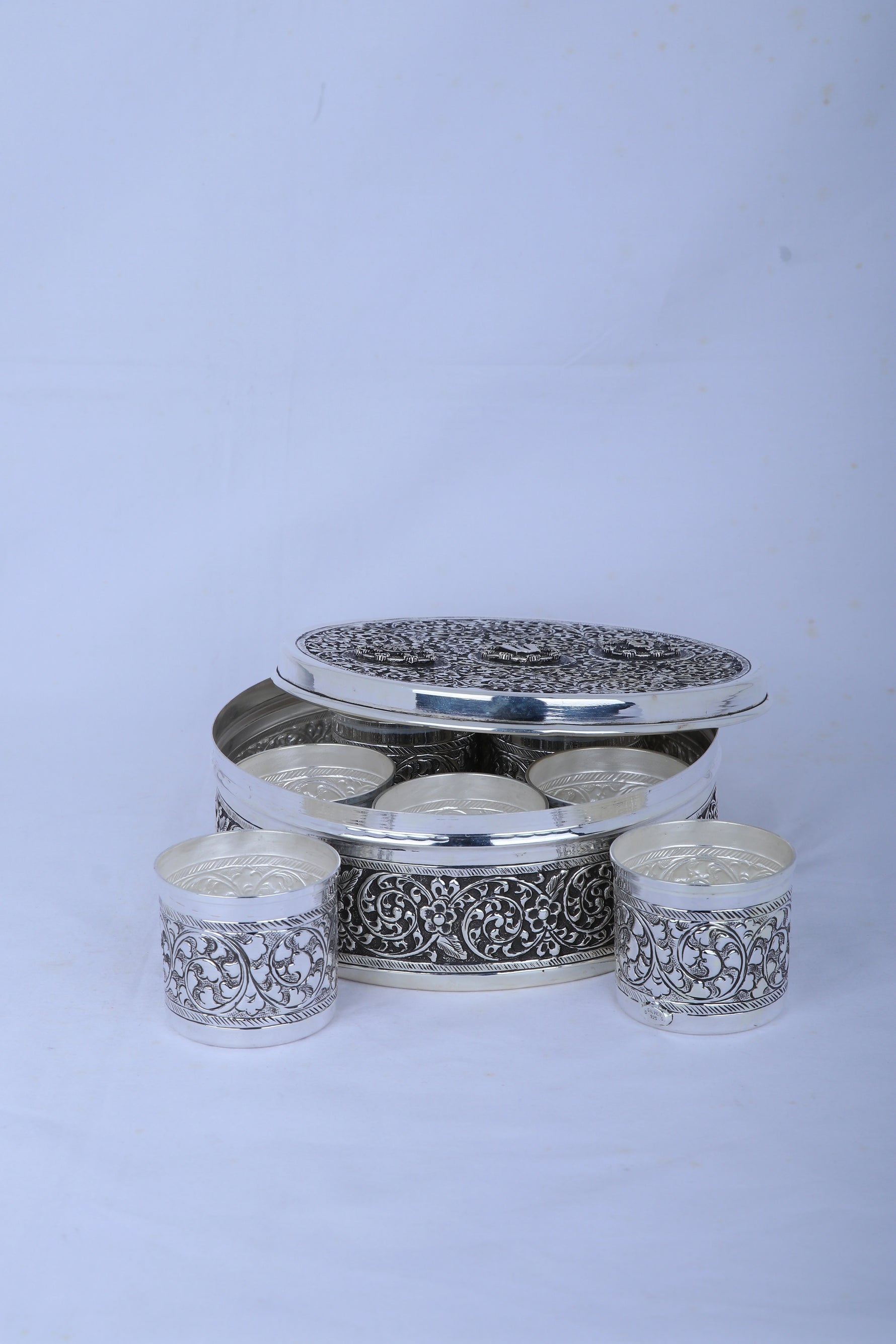 This oversized round box, crafted from 925 pure silver and weighing over a kilogram, includes seven internal cups and a richly decorated lid featuring the Tirupati Balaji Namam symbol. Ideal as a Pooja Samagri box, spice container, or dry fruit server, it offers organized storage with lasting value. Perfect as a luxurious heirloom or prestigious gift for housewarmings, anniversaries, and weddings.