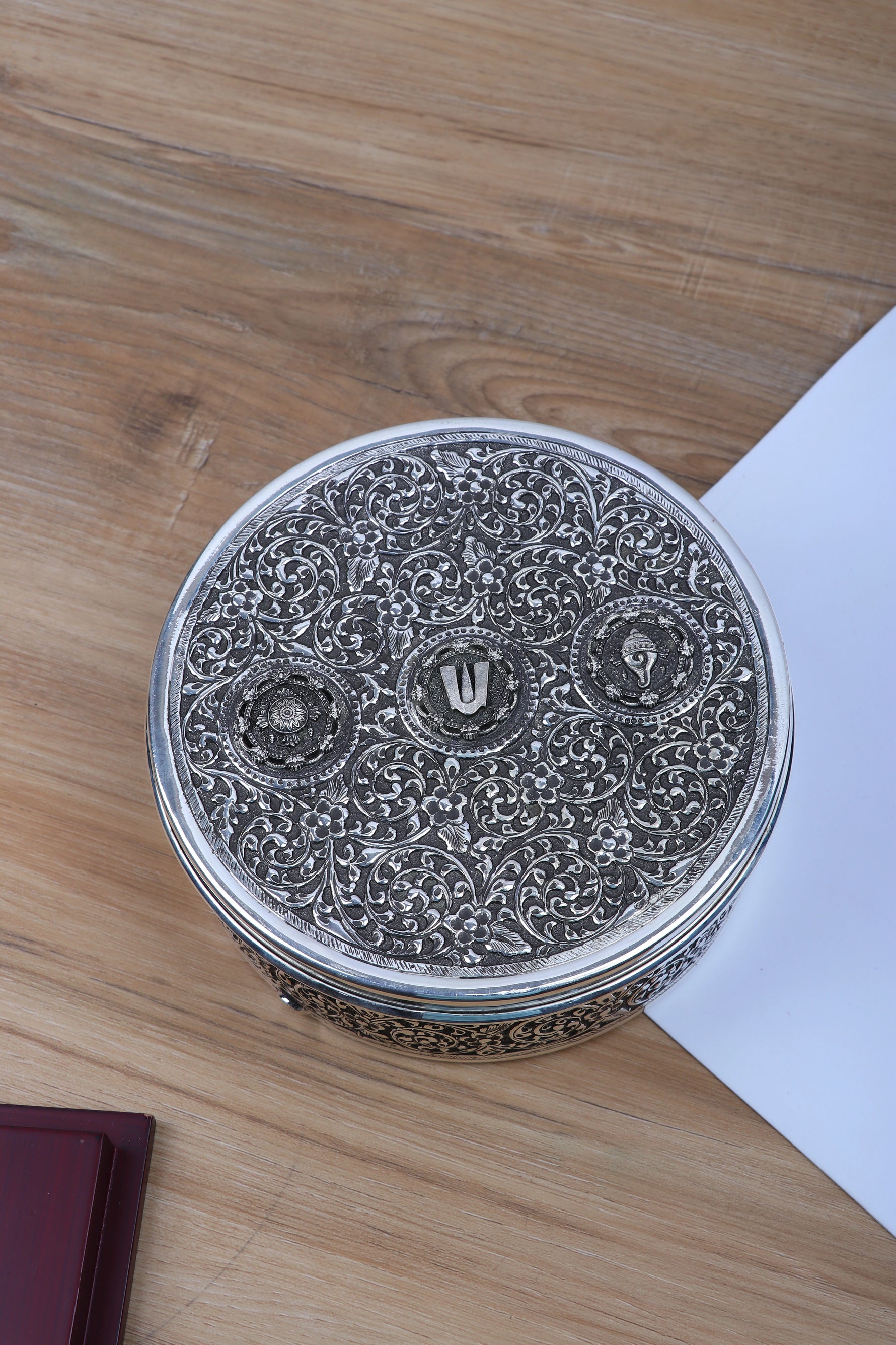 | Design | Round box with ornate lid, featuring the Tirupati Namam and seven removable internal cups |