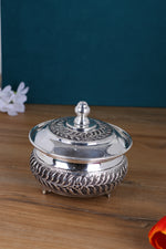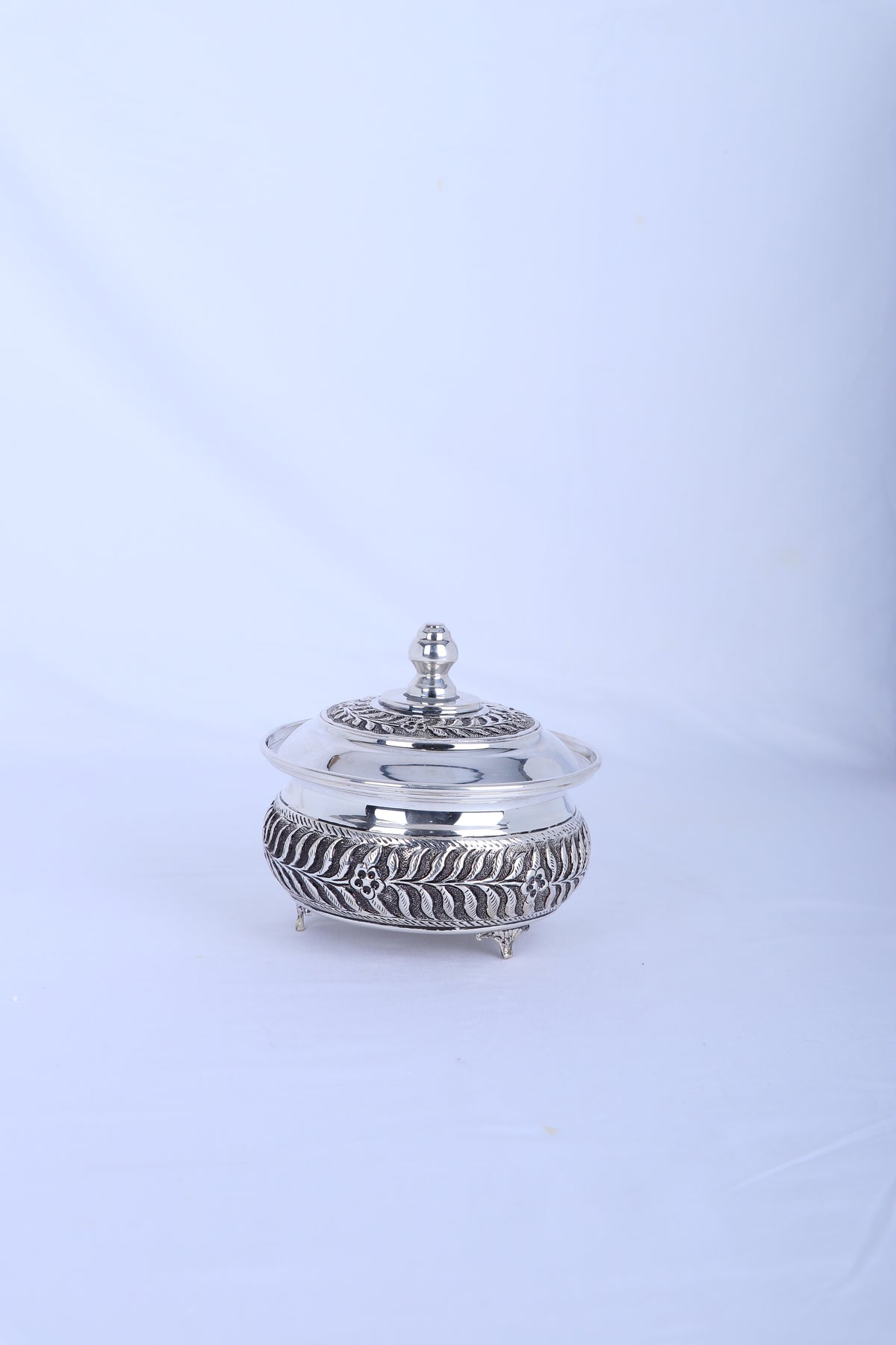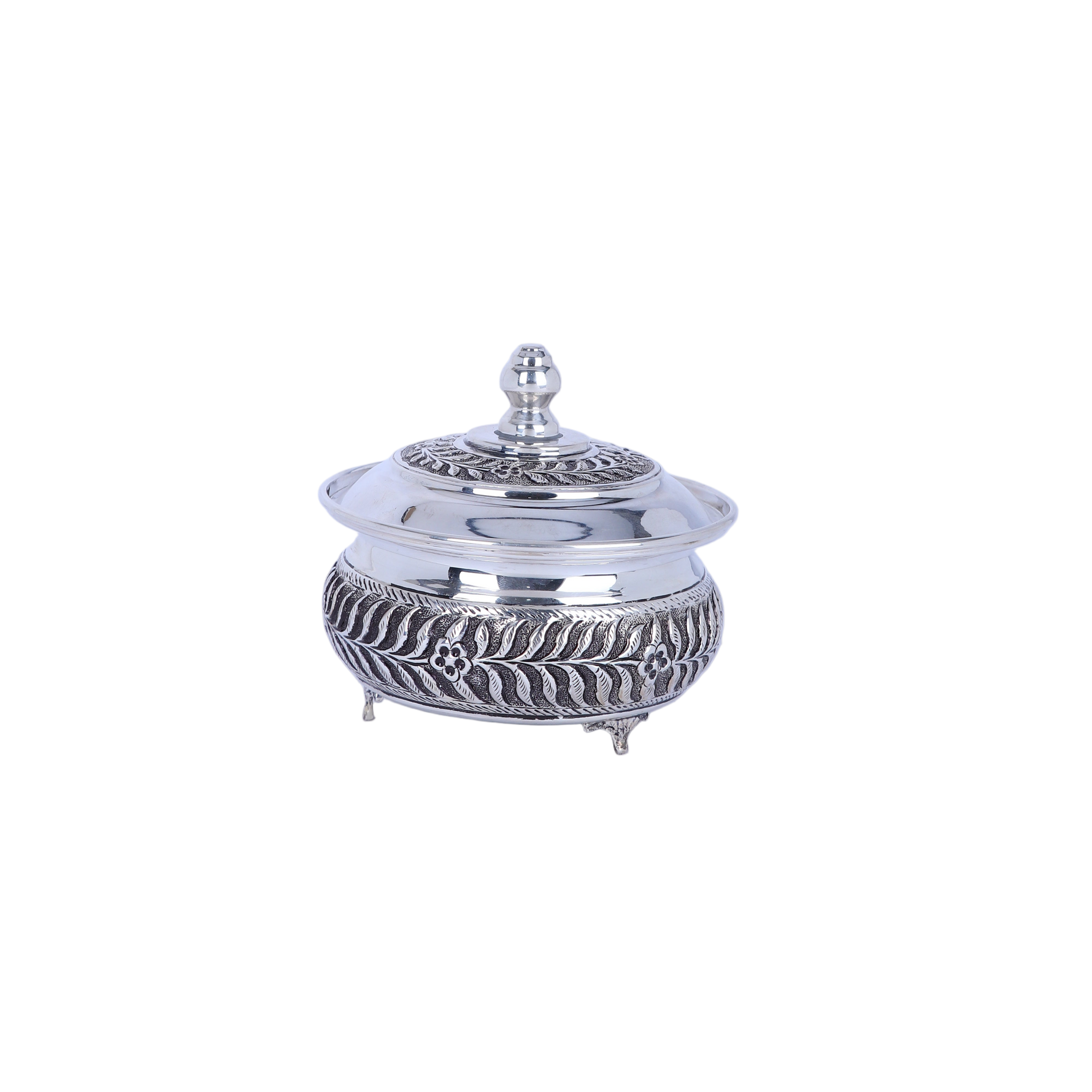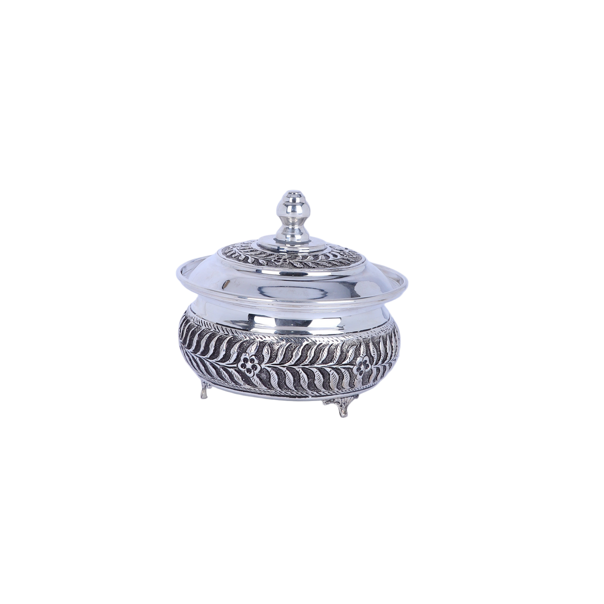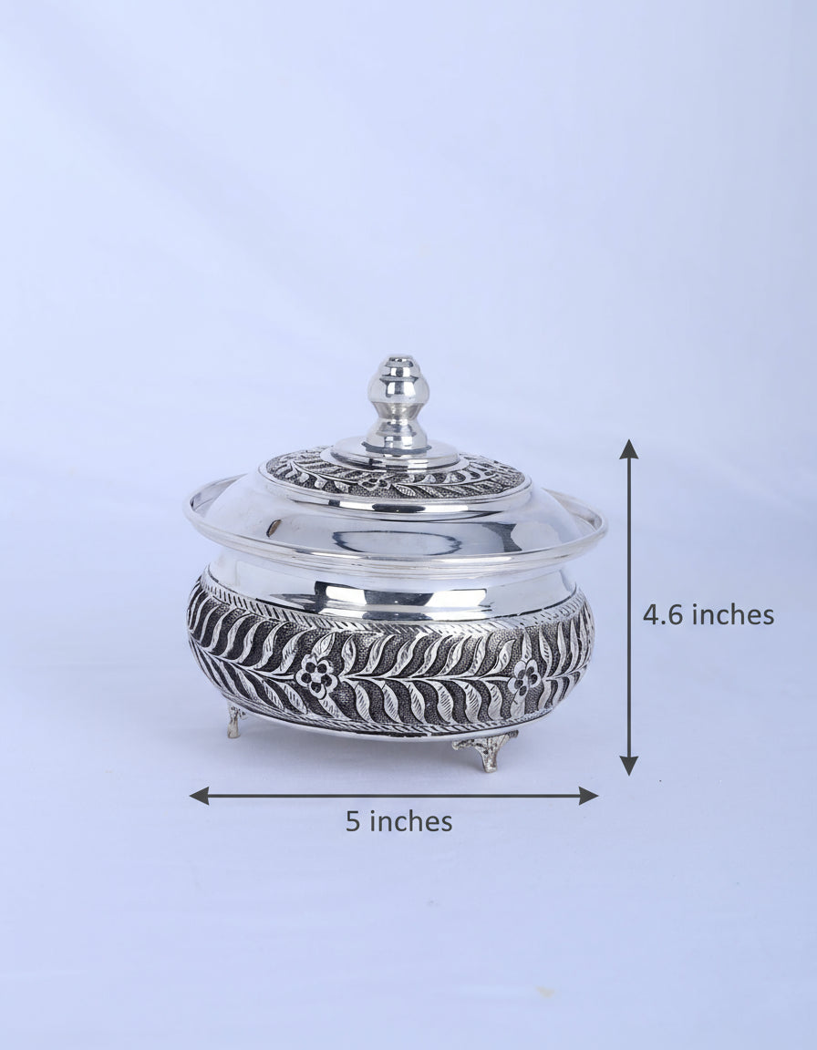 Craftsmanship: Features exquisite hand-engraved nakashi work covering the body and lid with deep-relief floral vine patterns and leaf motifs. The footed base provides elegant elevation while the domed lid is crowned with a traditional kalash-style finial. Handcrafted using centuries-old Indian repoussé, chasing, and nakashi techniques.